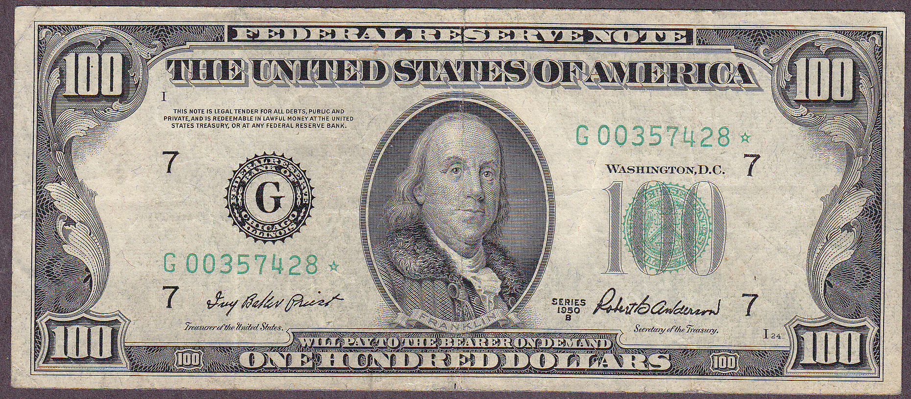 Fr.-2159* 1950-B $100 Chicago FRN Ser. G00357428* Fine++