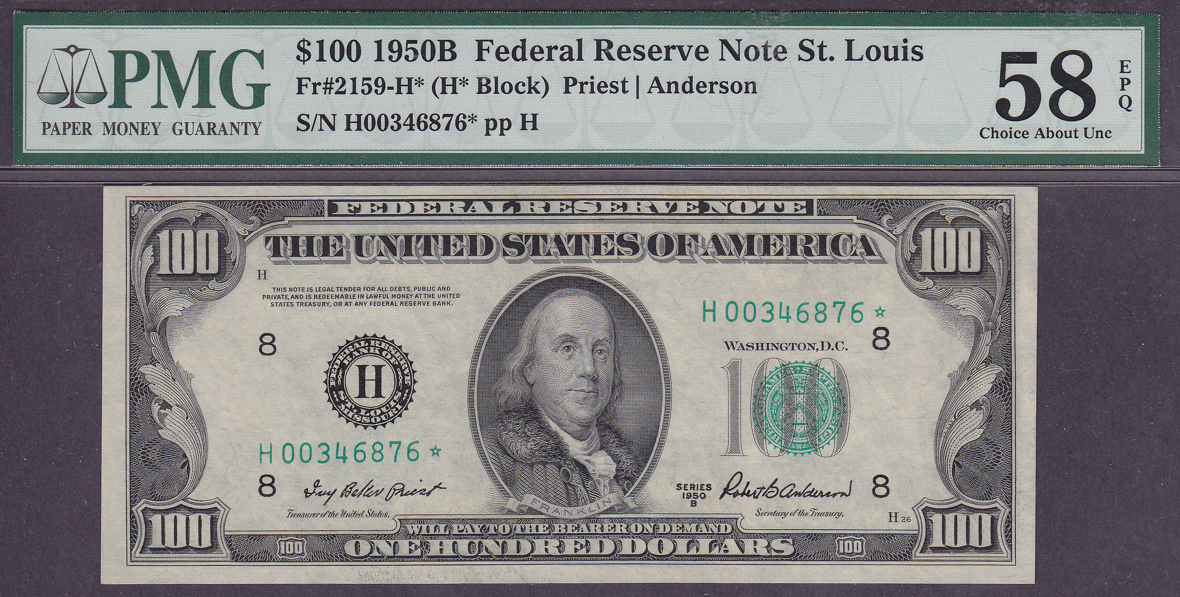 Fr.-2159* 1950B $100 St. Louis Ser. H00346876* PMG AU-58 EPQ