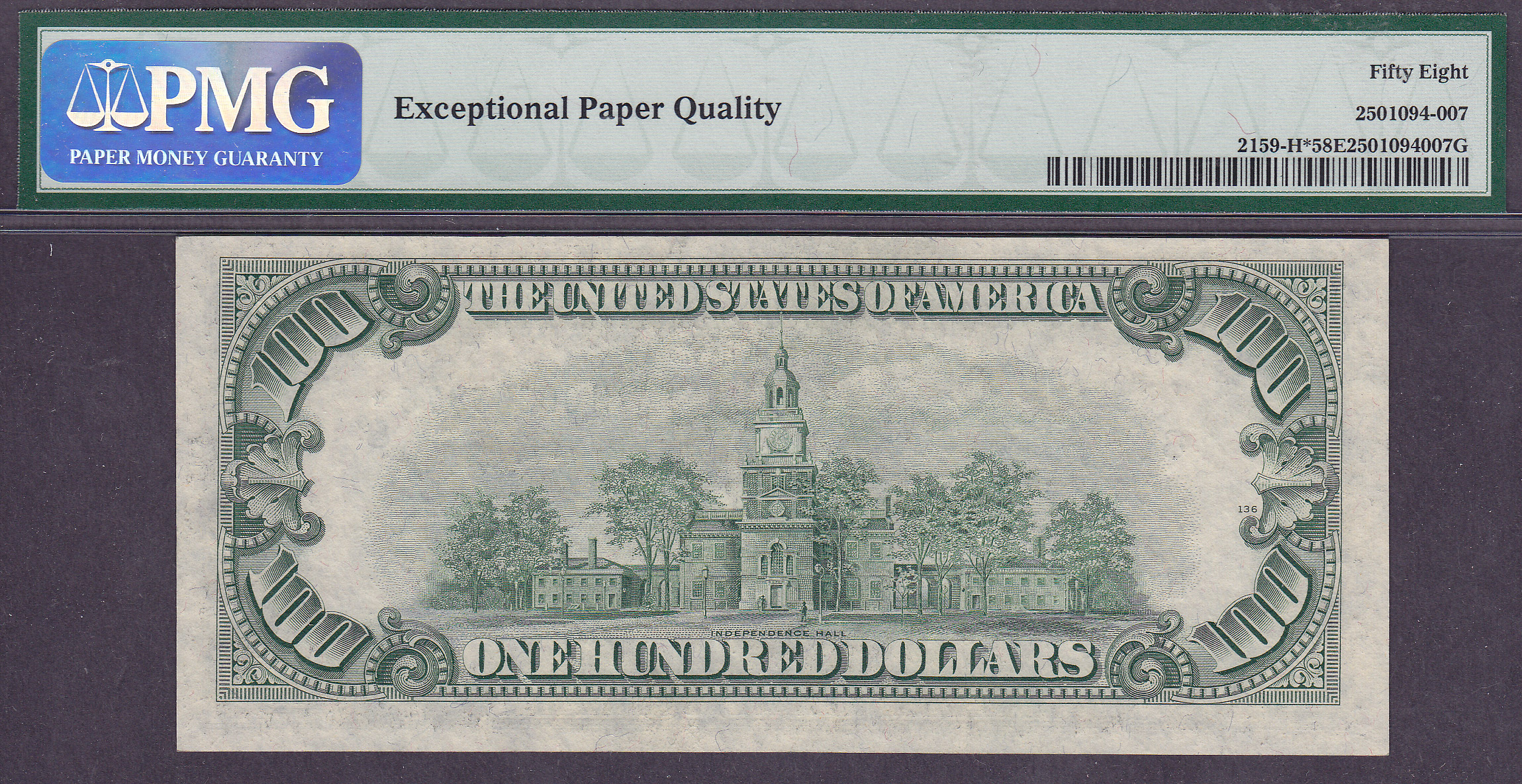 This is a nice example of the 1950B $100 St Louis star note. The serial number is H00346876* and it is in a PMG-58EPQ holder. It was previously in a CGA-58 holder.