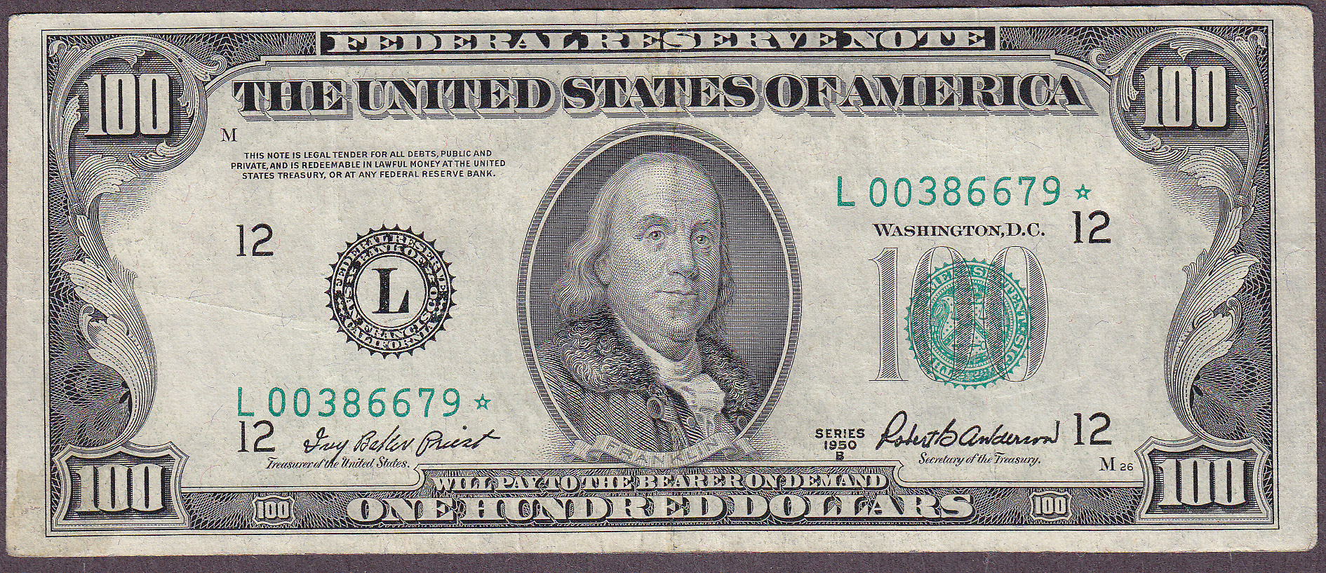 Here is a nice 1950B* $100 San Francisco star note. The serial number is L00386679*. There are no rips, tears, pinholes or bank marks. 1950B* stars are very hard to come by.