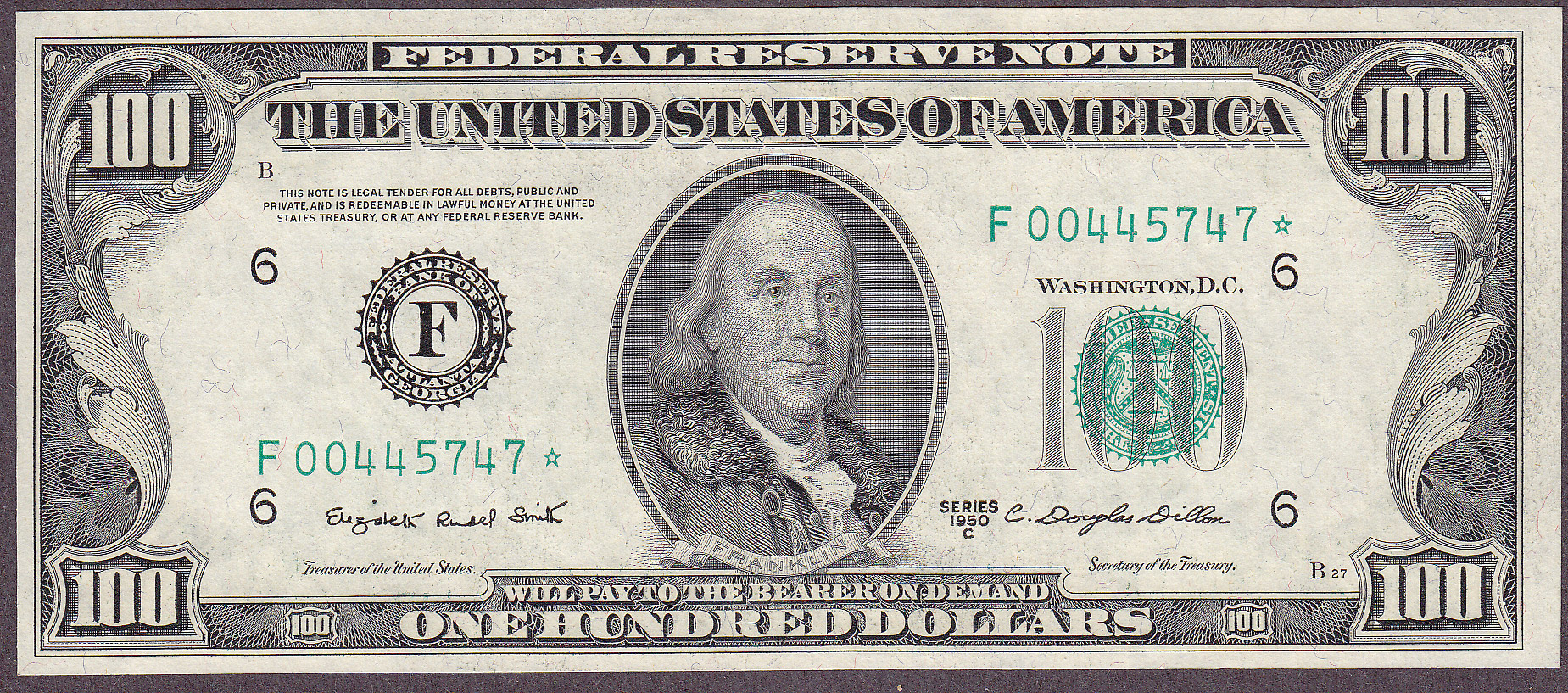 Here is a nice and scarce Unncirculated 1950C* $100 Atlanta star note. The serial number is F00445747*, which is also the exact serial number that Schwartz/Lundquist uses as their high serial number in their 9th edition book. There are no rips, tears, pinholes or bank marks. 1950C* stars are very hard to come by.