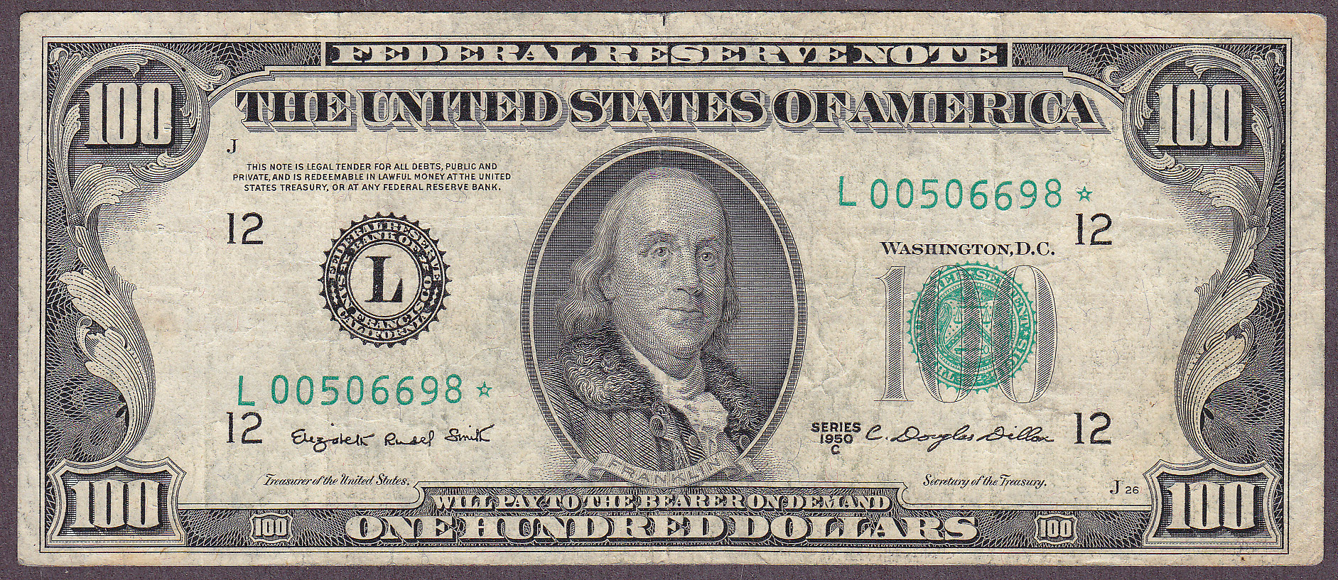 Here is a nice 1950C* $100 San Francisco star note. The serial number is L00506698*, 1950C* stars are very hard to come by. There are no rips, tears or pinholes.