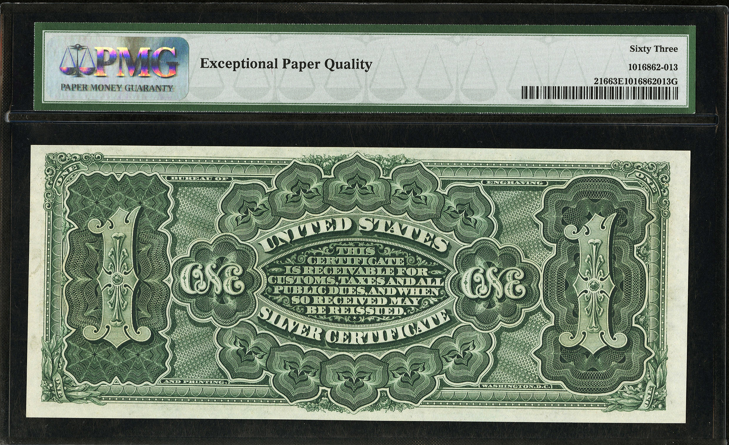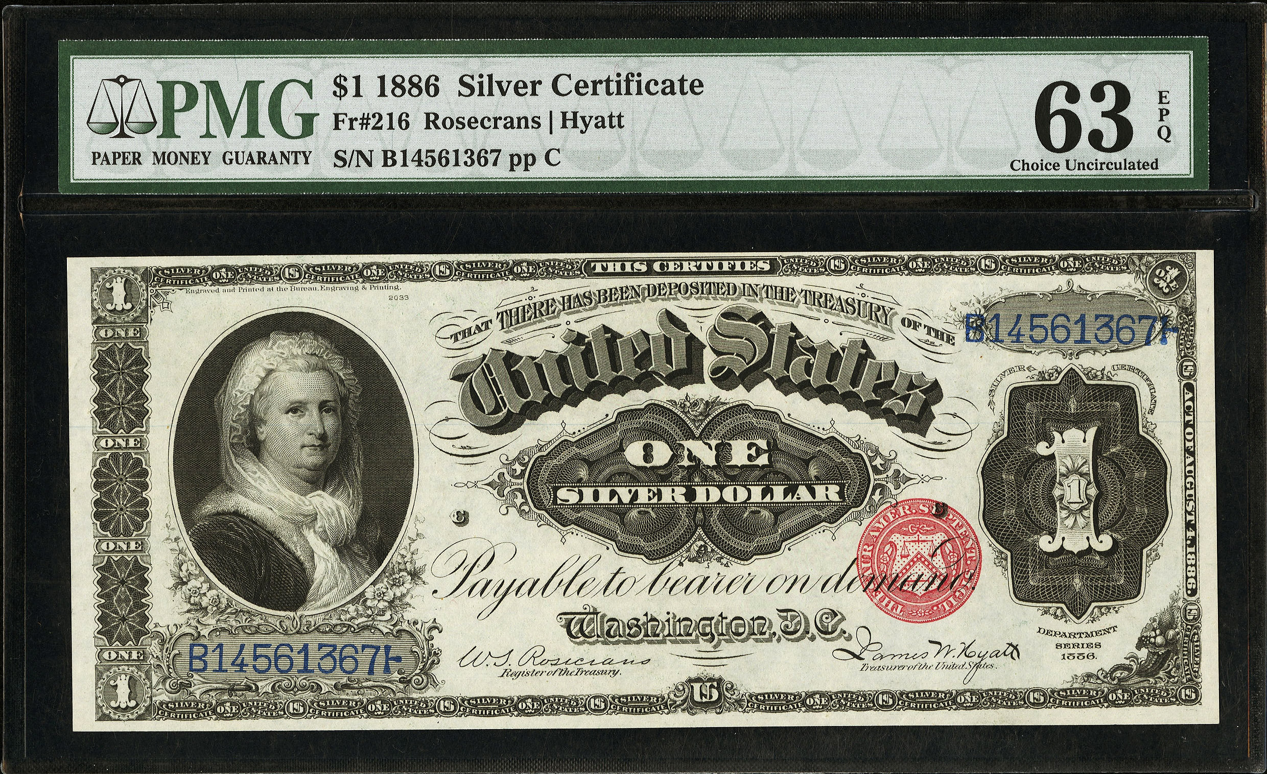 This wonderful 1886 $1 Silver Certificate or commonly refered to as the Martha Note. It is pleasing and could have easily been a GEM if the top margin was a bit more. The originality is easily visible within the PMG-63EPQ holder. It is difficult to find a no problem Martha in an Uncirculated grade, especially at this incrediable low price. A great type note with no problems at all. This note is in a PMG-63EPQ holder and the serial number is B14561367.