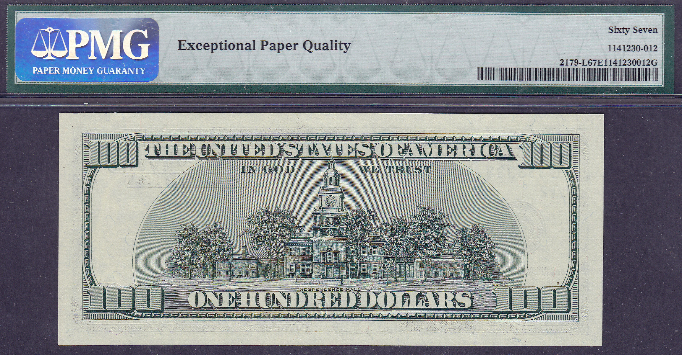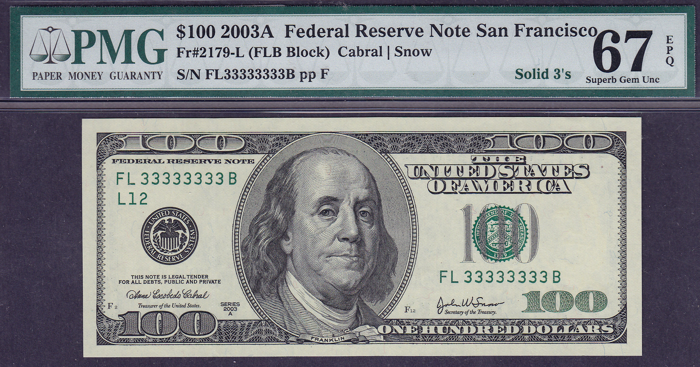 Here is a set of 10 2003 $100 FRN notes in a PMG-67EPQ holder. This is the only solid serial number $100 FRN that I have seen in a PMG-67EPQ. The serial numbers range from FL33333330B to FL33333339B. The solid threes is included in the set. This note has been graded as a PMG-67EPQ. This note has the serial number of FL33333333B. The other nine notes are not graded, but should at least be GEMs. All 10 note have a face value of $1.000.