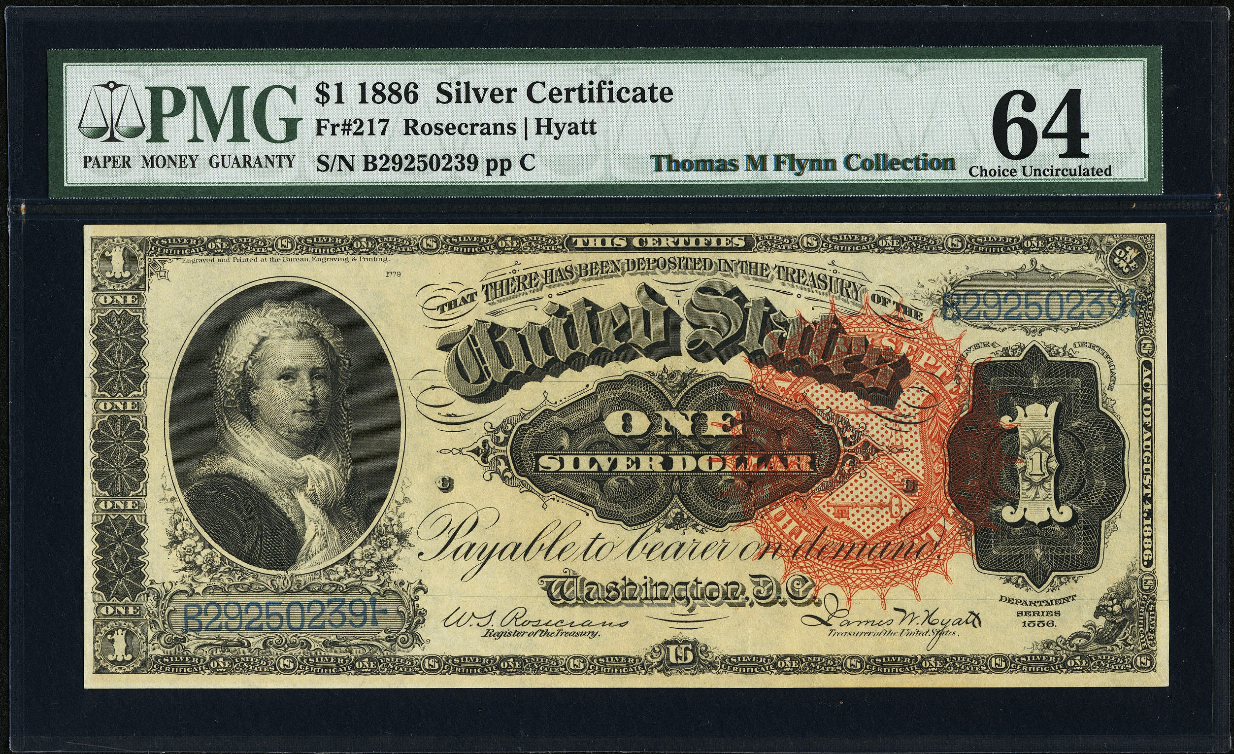 This is an outstanding Martha Note or an 1886 $1 Silver Certificate holdered in a PMG-64 holder. The paper is nice with the bright vivid Large Red Spiked Seal. It features decent margins for the grade. It is origionally from the famous Pedigreed Tom Flynn Collection which is noted on the PMG Holder. It was recently in the R. D. Bradly Collection. A great price for a great note. The selling price includes USPS overnight freight and insurance.