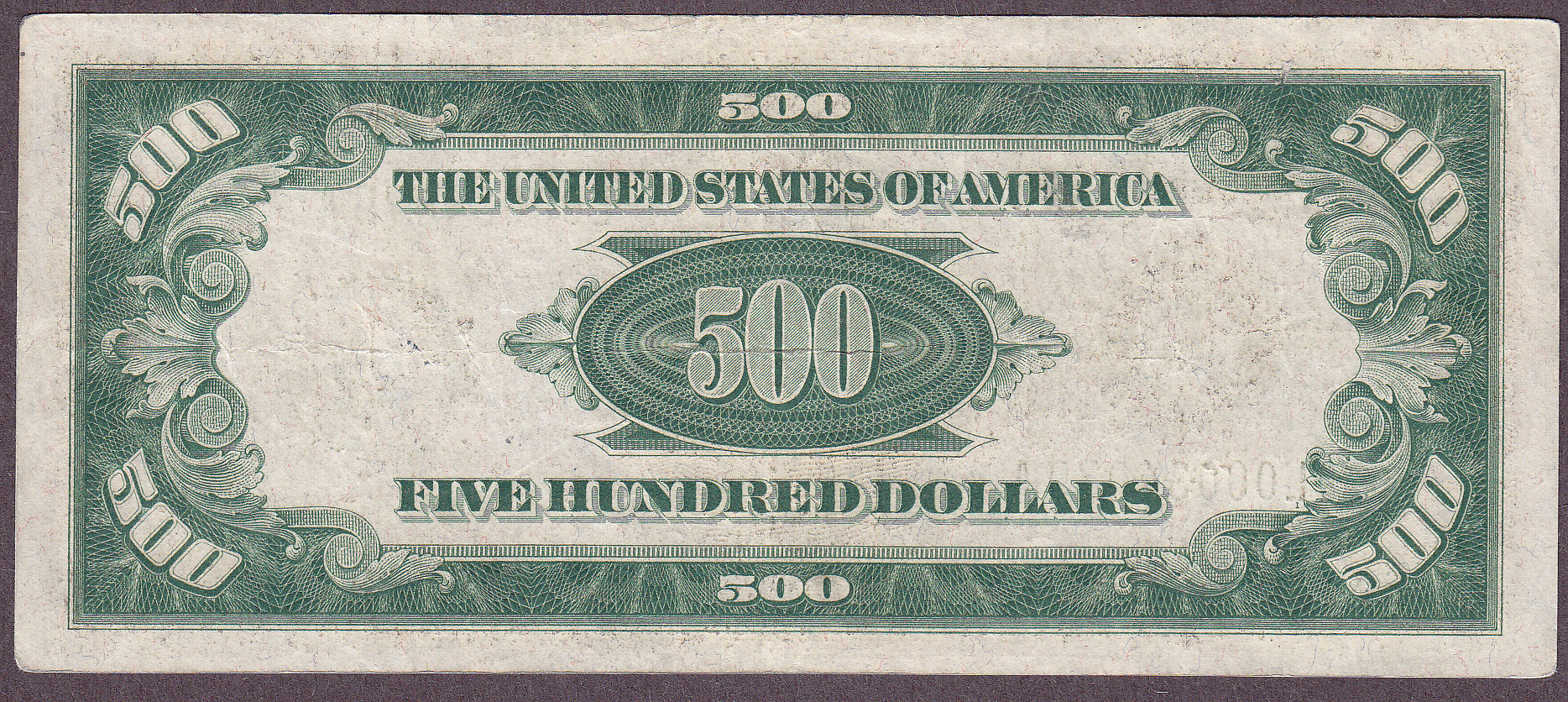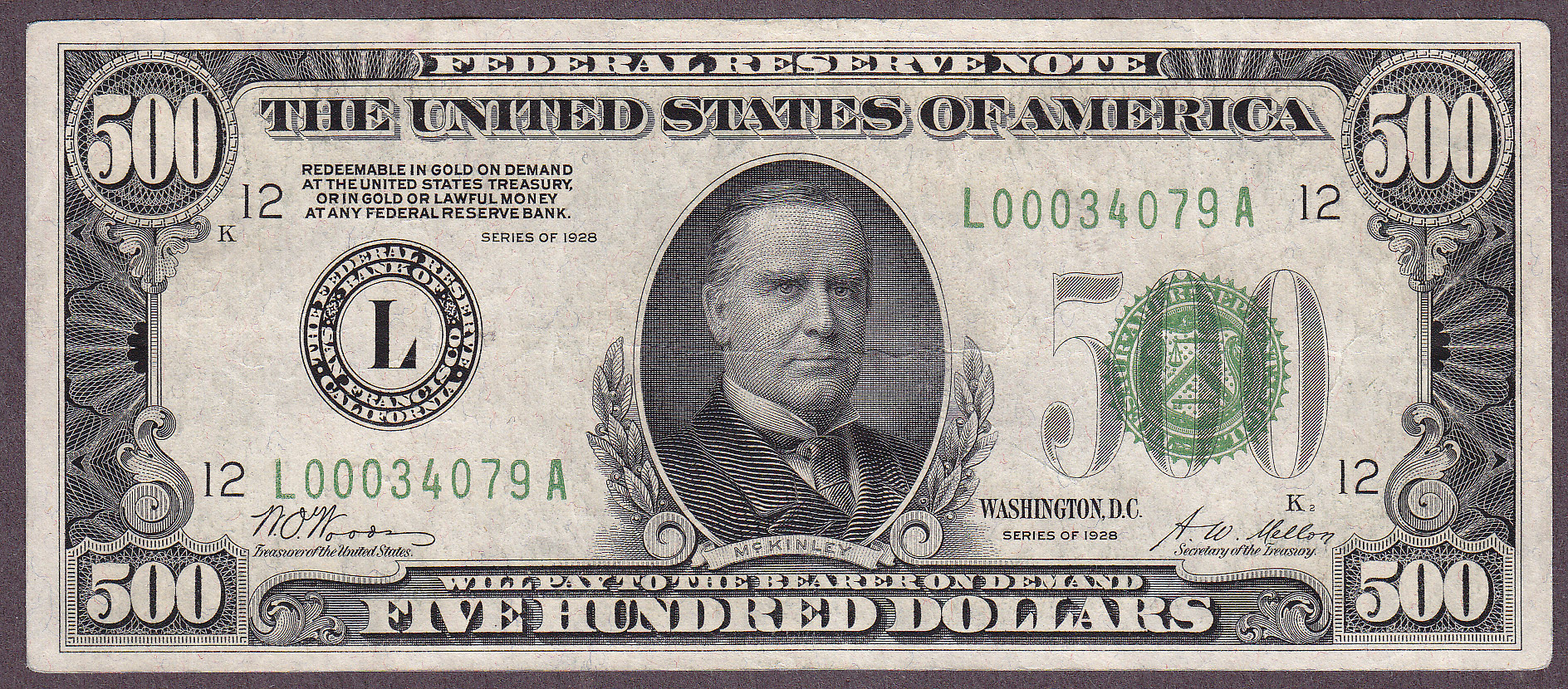 This is a very nice and problem free 1928 $500 FRN from the San Francisco District. The serial number is L00034079A. As you view the large scans you will notice that there are no rips, tears, pinholes or heavy soil or folds. It has original embossing that you can see and feel. Never cleaner or pressed as so many of them have been. It is a very collectible note. 1928 $500 notes are hard to find in this lightly circulated problem free condition.