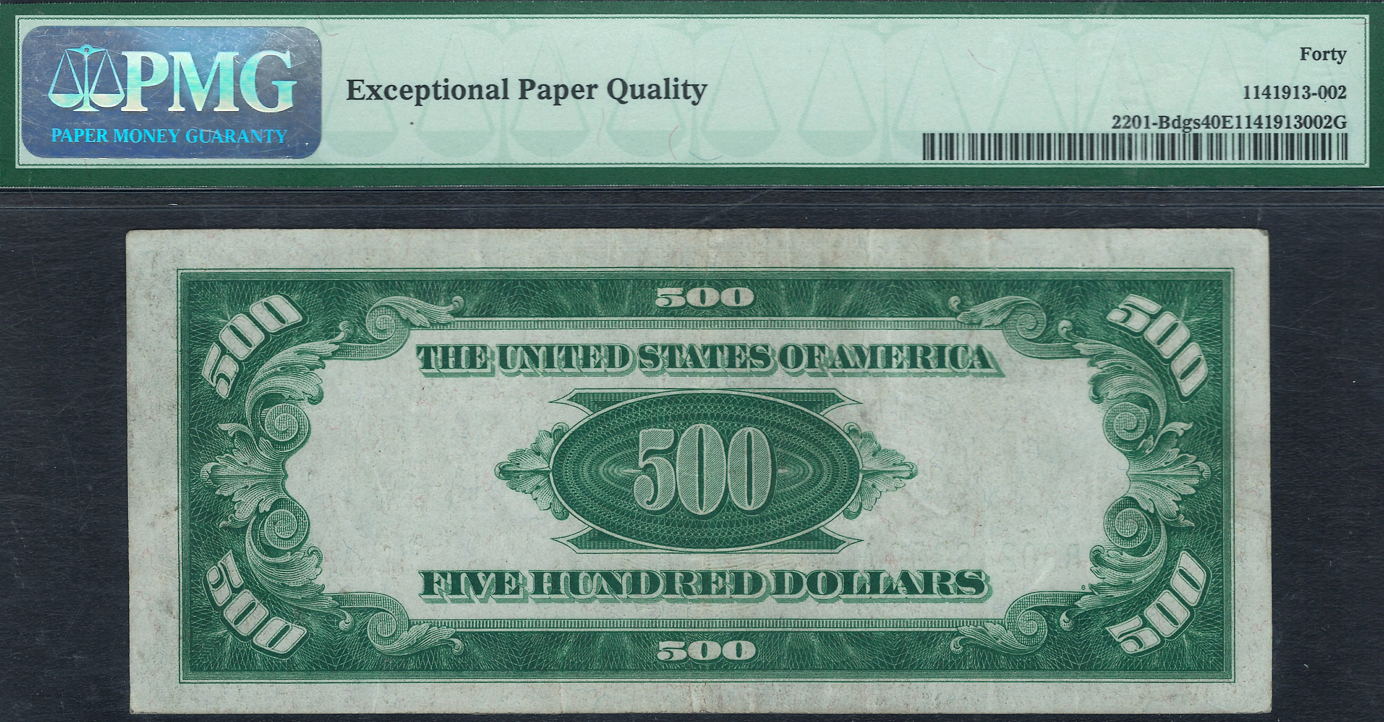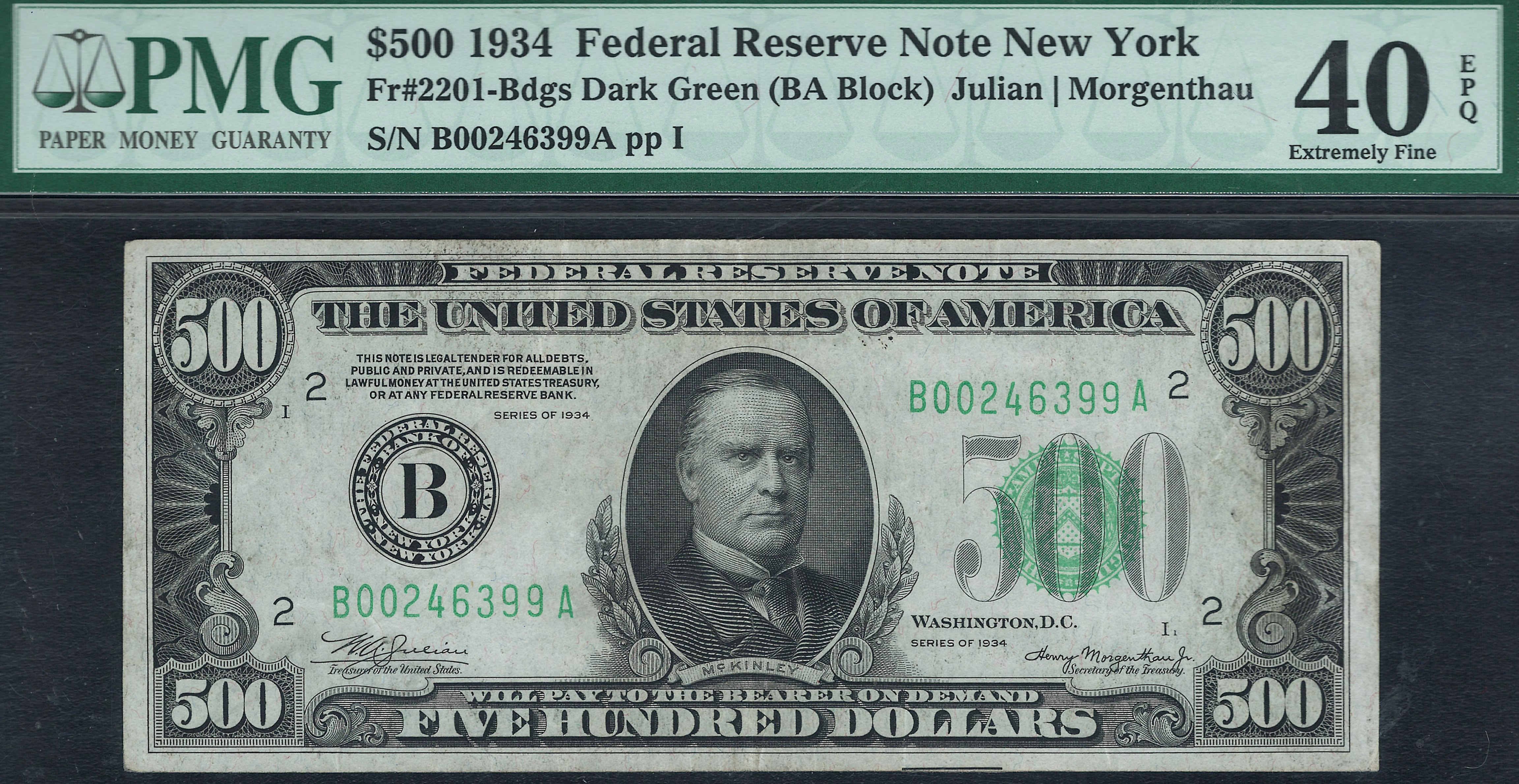 This is a very nice and original Fr.-2201 or a 1934 $500 FRN Dark Green Seal from the New York district, and the ser. is B00246399A. It resides in a PMG EF-40 EPQ holder. This is one of the few PPQ notes that means it has never been pressed or cleaned as most of all the 1928 and 1934 $500 and $1,000 bills have been. It was a common practice back from the 1930 to 1980 era to clean and press them for collectors. If your wanting a totally original and not any issues 1934 $5000 dollar bill, here it is. A pressed and cleaned version will be about $100 to $200 less.