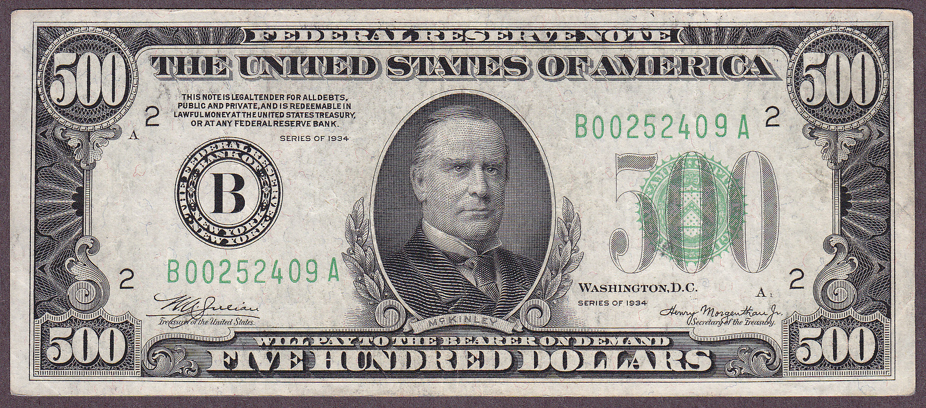 This is a very nice 1934 $500 FRN from the New York district. The serial number is B00252409A. This is a sold VF note with no rips, tears, pinholes, bank marks, heavy soil or heavy folds. It is a good collectiable mid range lightly circulated $500 note. All 4 corners are squared and it even has deep punch through embossing. Never cleaner or doctored.