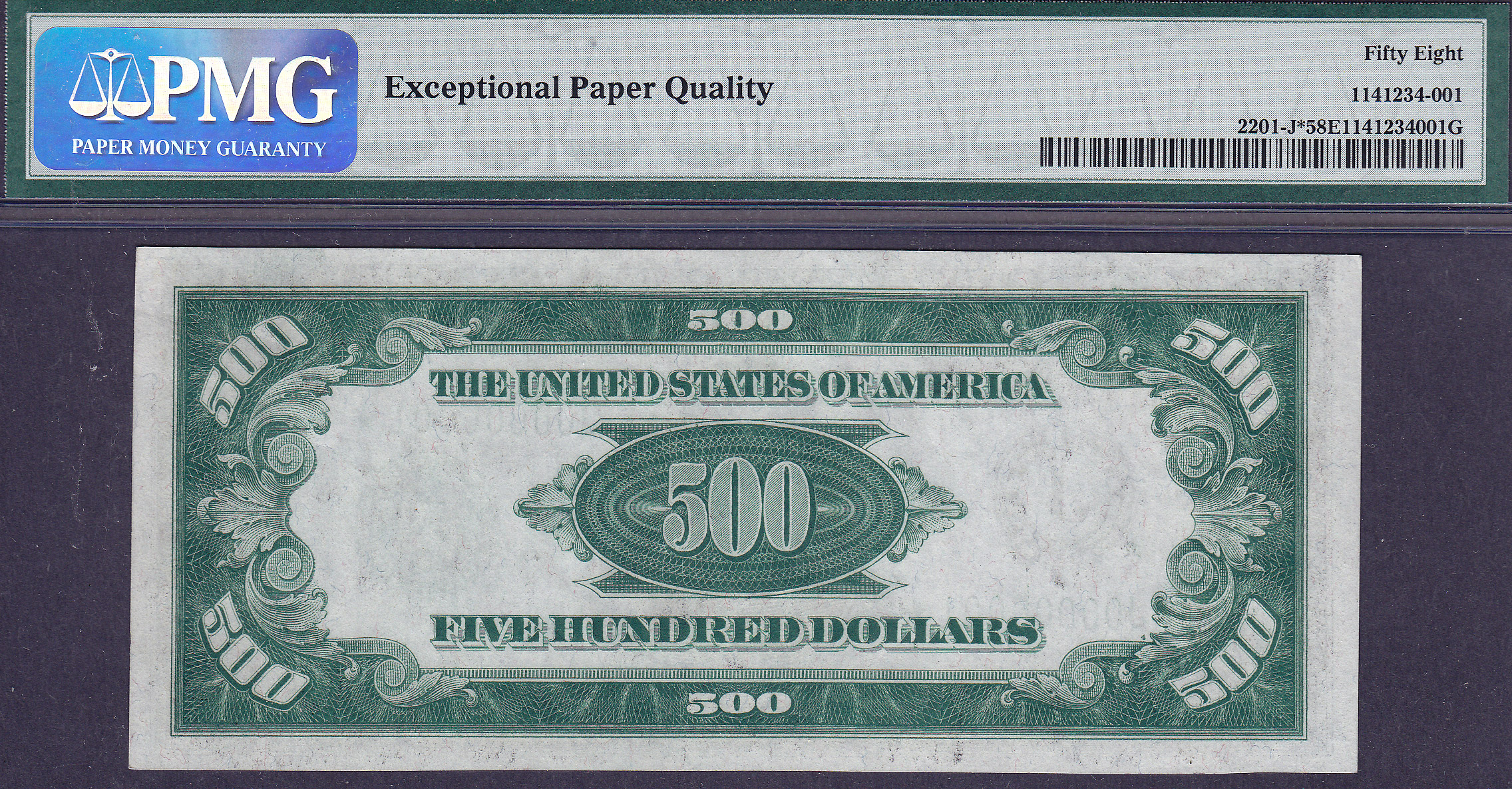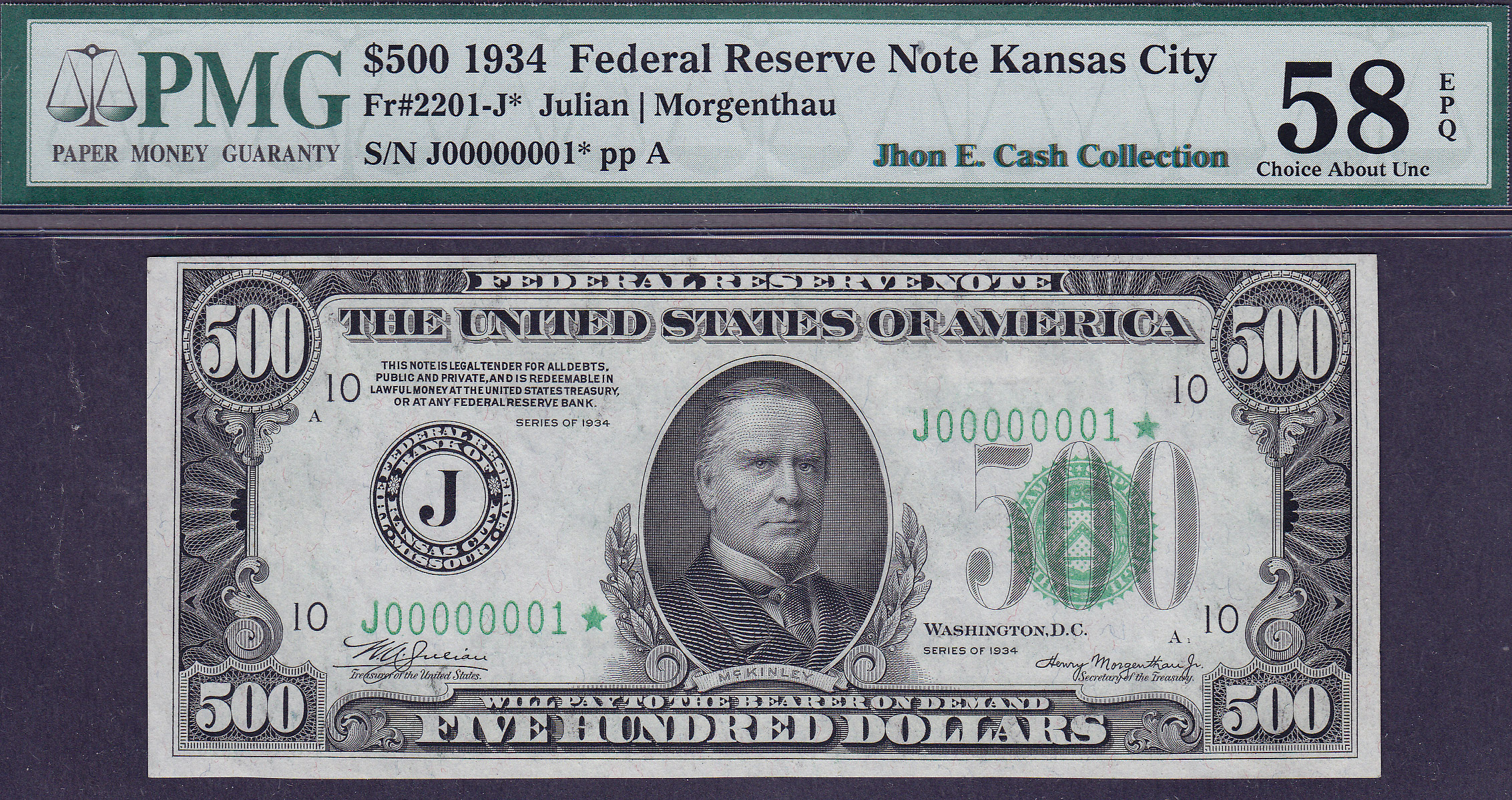 PMG & PCGS POP1/None Finer! THIS NOTE HAS BEEN RE EVALUATED BY PMG AND NOW RESIDES IN A PMG-63EPQ HOLDER. This is the” Holy Grail” of all small sized US Currency notes. It is certainly one of the most prized and expensive US small sized note ever listed anywhere. There is only one serial number one star note ever released for all 1928 and 1934 $500 and $1,000 bills. There were two other serial number one $500’s. One was a 1928 $500 serial number one note that sold at the Baltimore ANA in, I believe 2003 to 2005. I will have to check the year. It sold for BIG, six figure bucks. The other one I never saw. Neither one of them were star notes. I purchased this note from an Estate that was brokered by a well known currency dealer friend of mine back in September of 2001, a few days after 911. I also purchased the other 4 serial number one star notes that currently reside in the Jhon E Cash Collection. I consider this Kansas City $500 serial number one star note to be the highlight of the Jhon E Cash Collection. It is also the only known $500 star note on the Kansas City district. Over the years I have received many serious offers for it, but I can’t quite pull the trigger. I have listed this rare specimen for other to view it as I will probably never sell it. The centering is a tad bit off that keeps it from the GEM-65 grade. It is 100% original all the way. The serial number of this 1934 $500 Kansas City star is J00000001*. This note was originally improperly graded and now resides in a PCGS-63PPQ holder. This is one of those types of notes that any serious collector or investor would die for. I hope you enjoy viewing it and email it to your friends! It’s truly a beauty and a piece of Americana history. For you information, this is also the only 1934 $500 star from the Kansas City district. This pedigreed note should be in the Smithsonian Museum in Washington DC for all Americans to see as it is a very important part of the US monetary history.