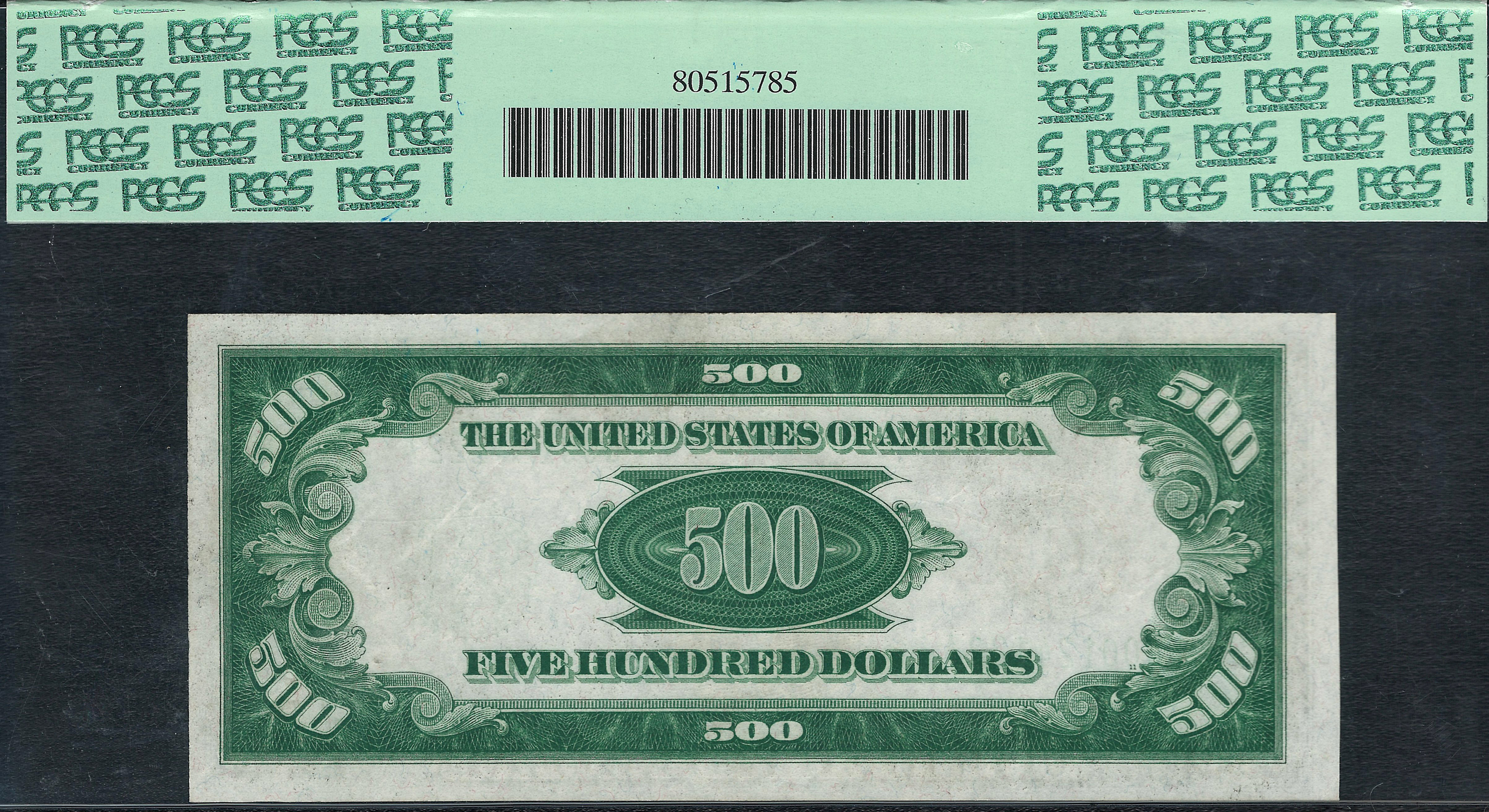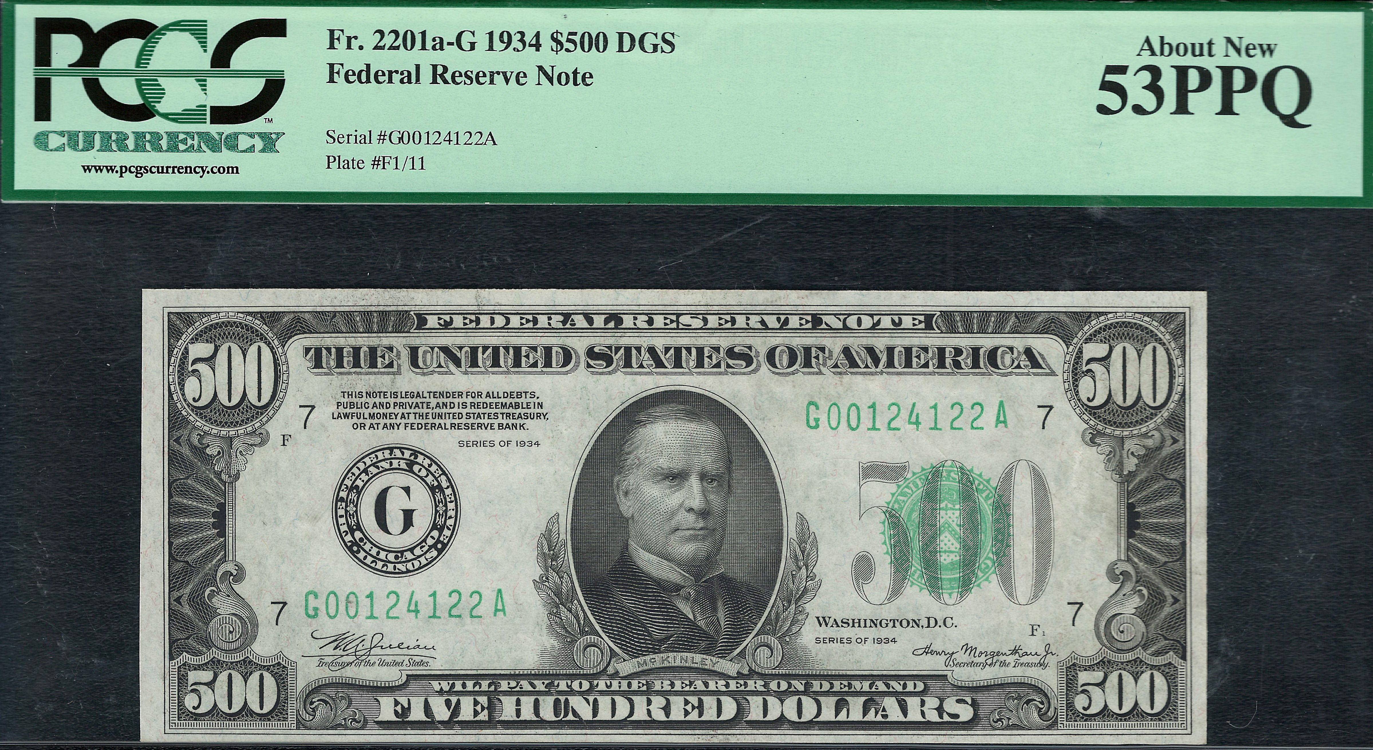 This is a very nice example of a Fr.-2201a, a 1934 $500 Chicago FRN with Ser. G00124122A. It is in a PCGS AU-53 PPQ holder. This is one of the few PPQ $500 dollar bills that I have. Most examples are pressed and cleaned, not this one! It has never been doctored with in any way. If you are looking for a top notch $500 note for your collection, here it is. No rips, tears, pinholes or bank marks. It is totally original.