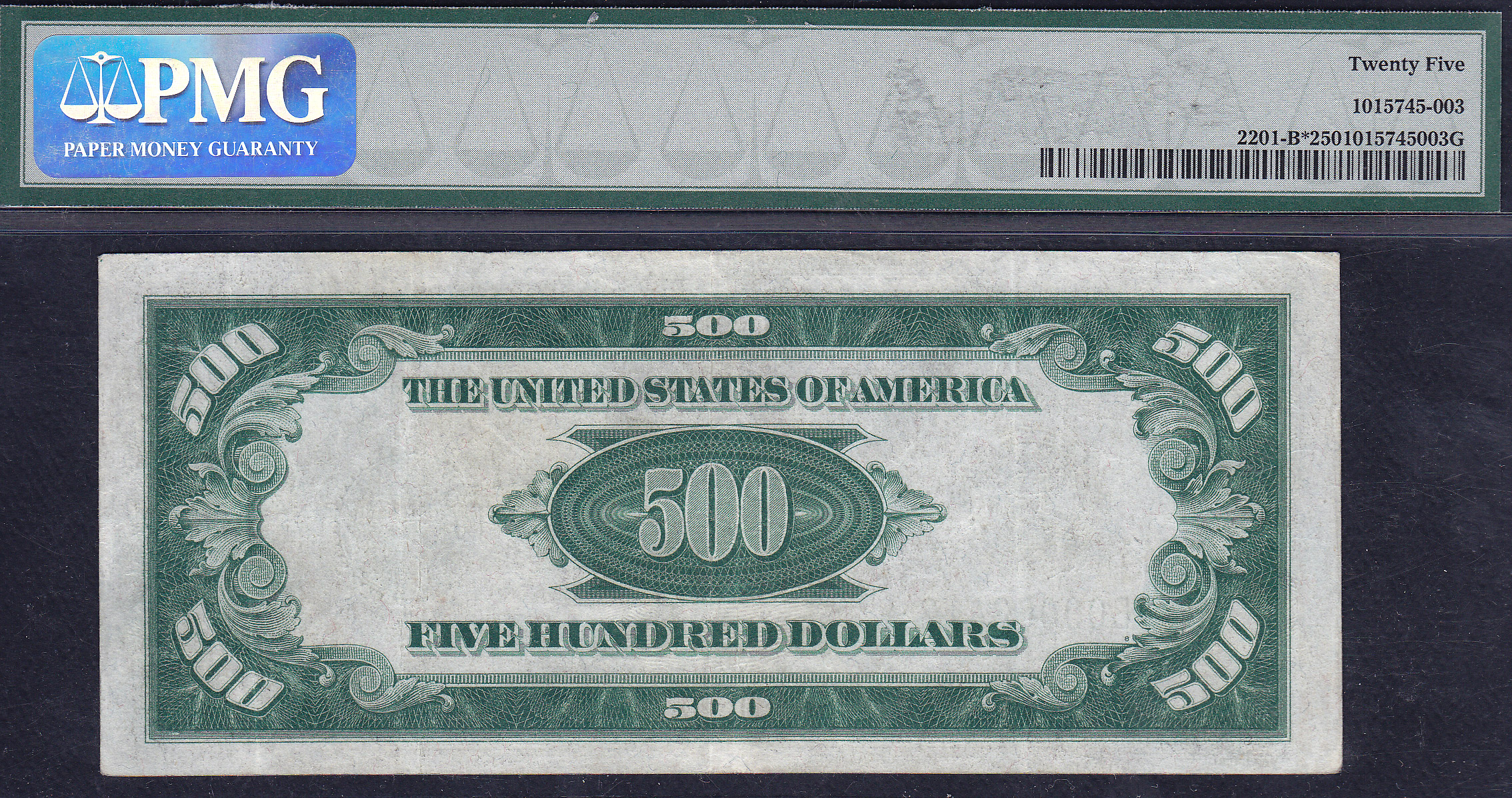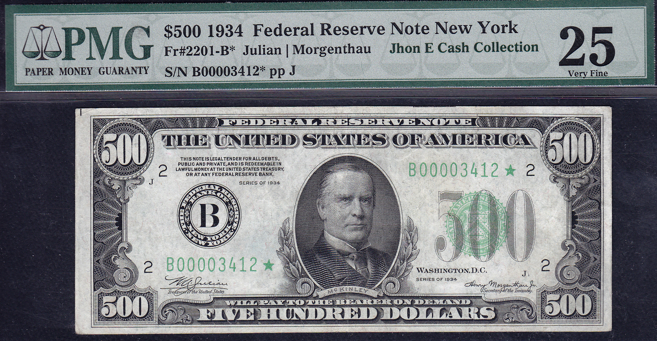 This 1934 $500 FRN Star is from the New York district. Of the 15 known, PMG has graded most of them in a VF or less grade. The serial number is B00003412*. It has been graded as a PMG VF-25. It faces up much nicer than the grade states. See the scans. It currently resides in the Jhon E Cash Collection.