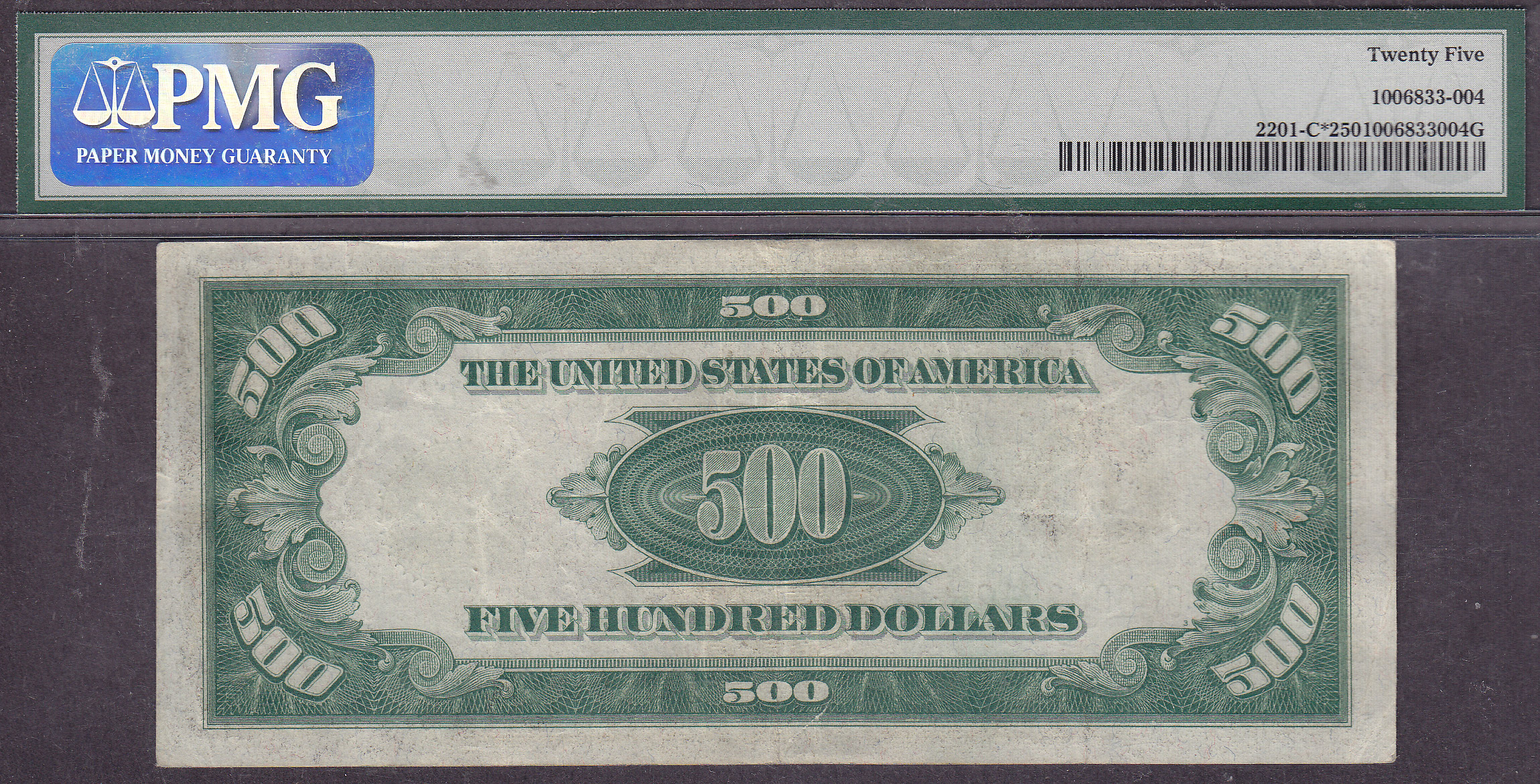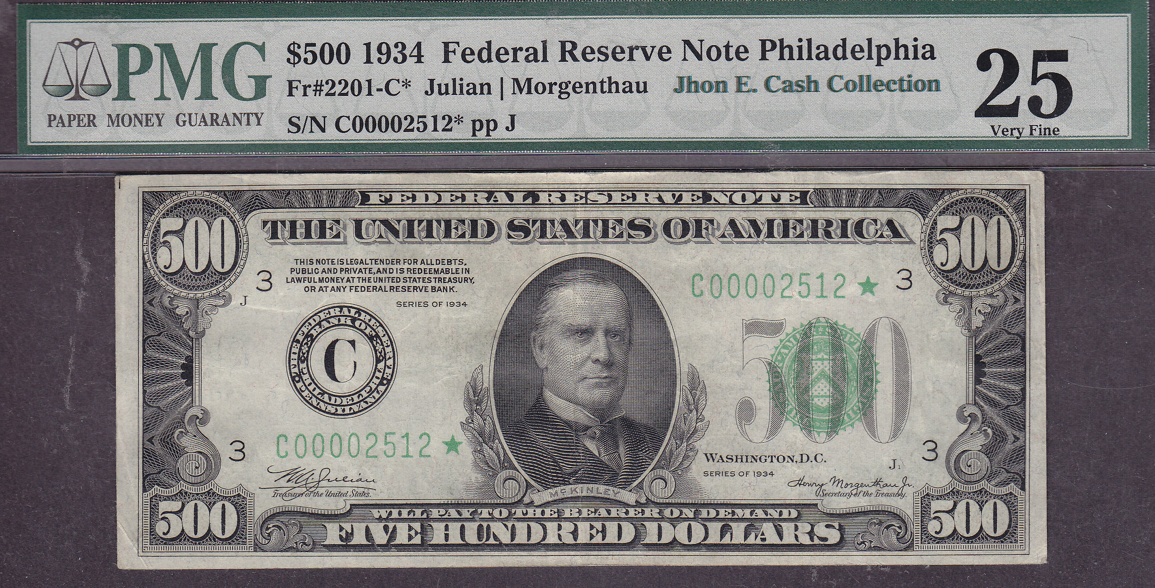 This is a problem free 1934 $500 FRN Philadelphia Star note. The serial number is C00002512* It has been graded as a PMG VF-25. You wont see many Philadelphia $500 star notes as there are only 13 known. This VF note fits right in the middle of the pack in grade. No rips, tears or pinholes. It currently resides in the Jhon E Cash Collection.