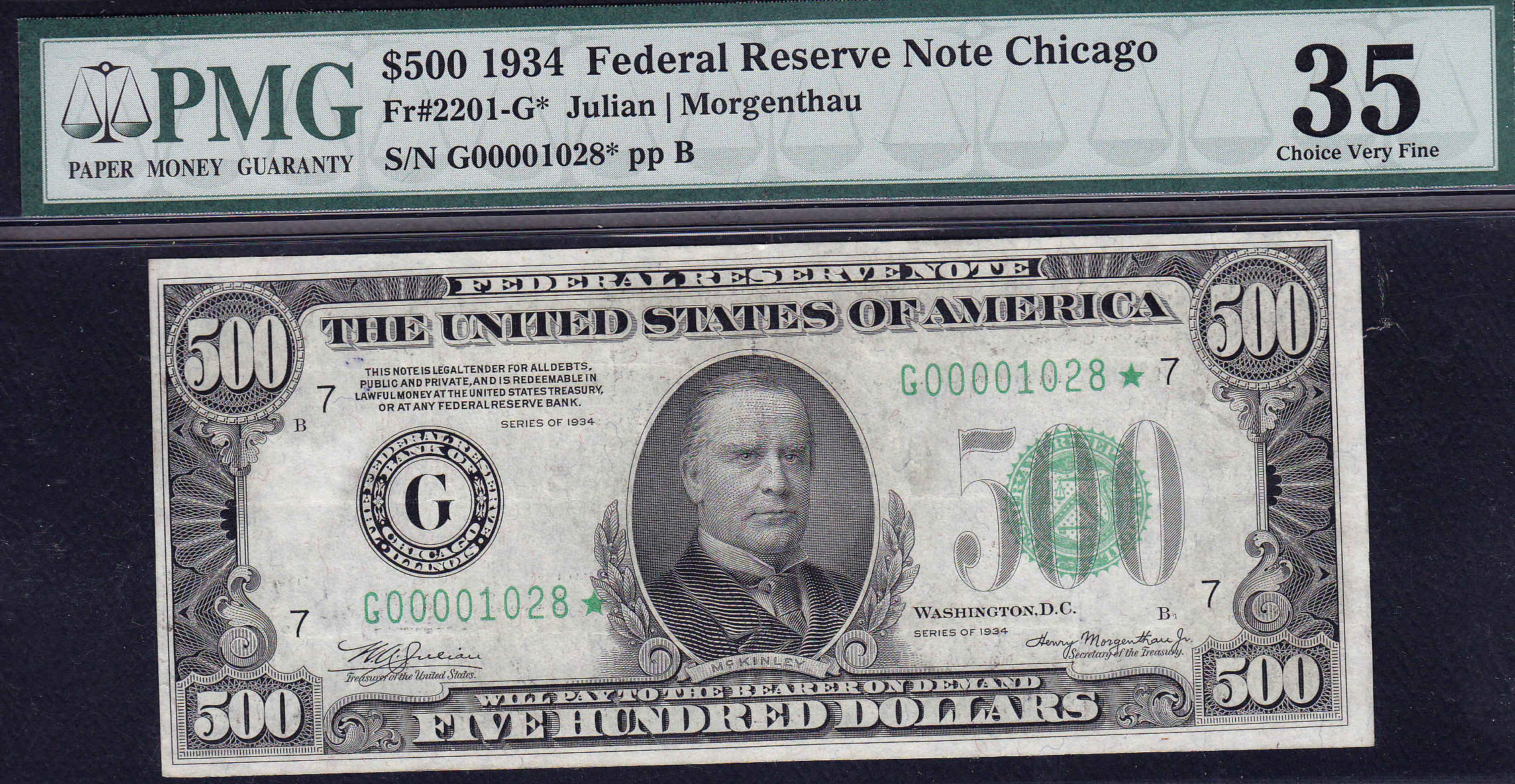 Fr.-2201G* 1934 $500 Star Chicago PMG VF-35 Serial # G00001028*
