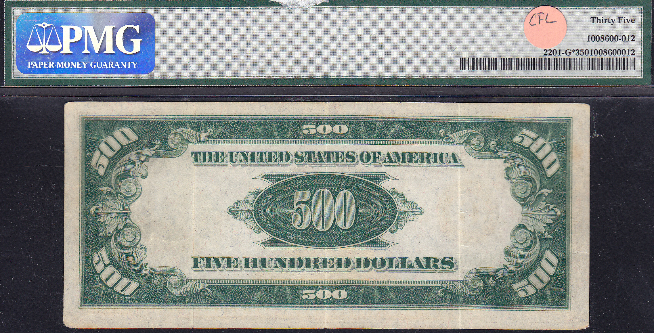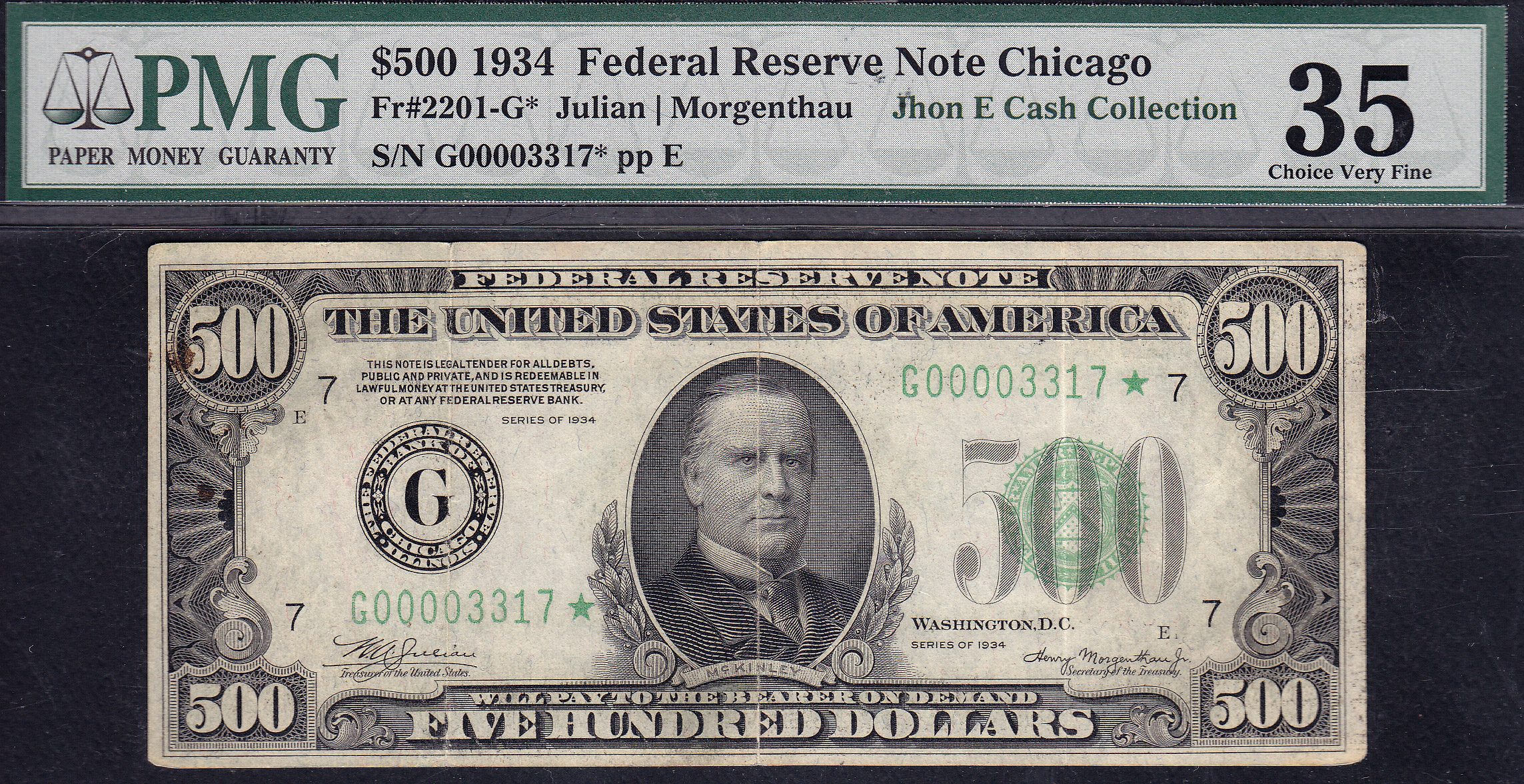 This is a 1934 $500 FRN from Chicago with a serial number of G00003317*. It has been graded as a PMG VF-35. This note should have the PMG EPQ designator as it is totally original. You can see the 3 folds. There are no rips, tears or pinholes.