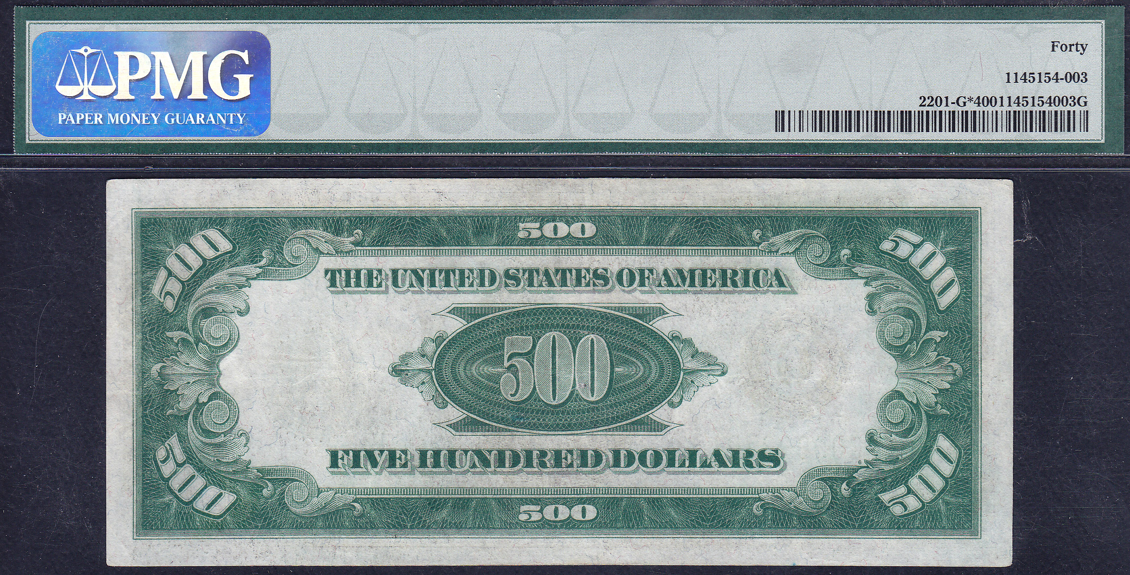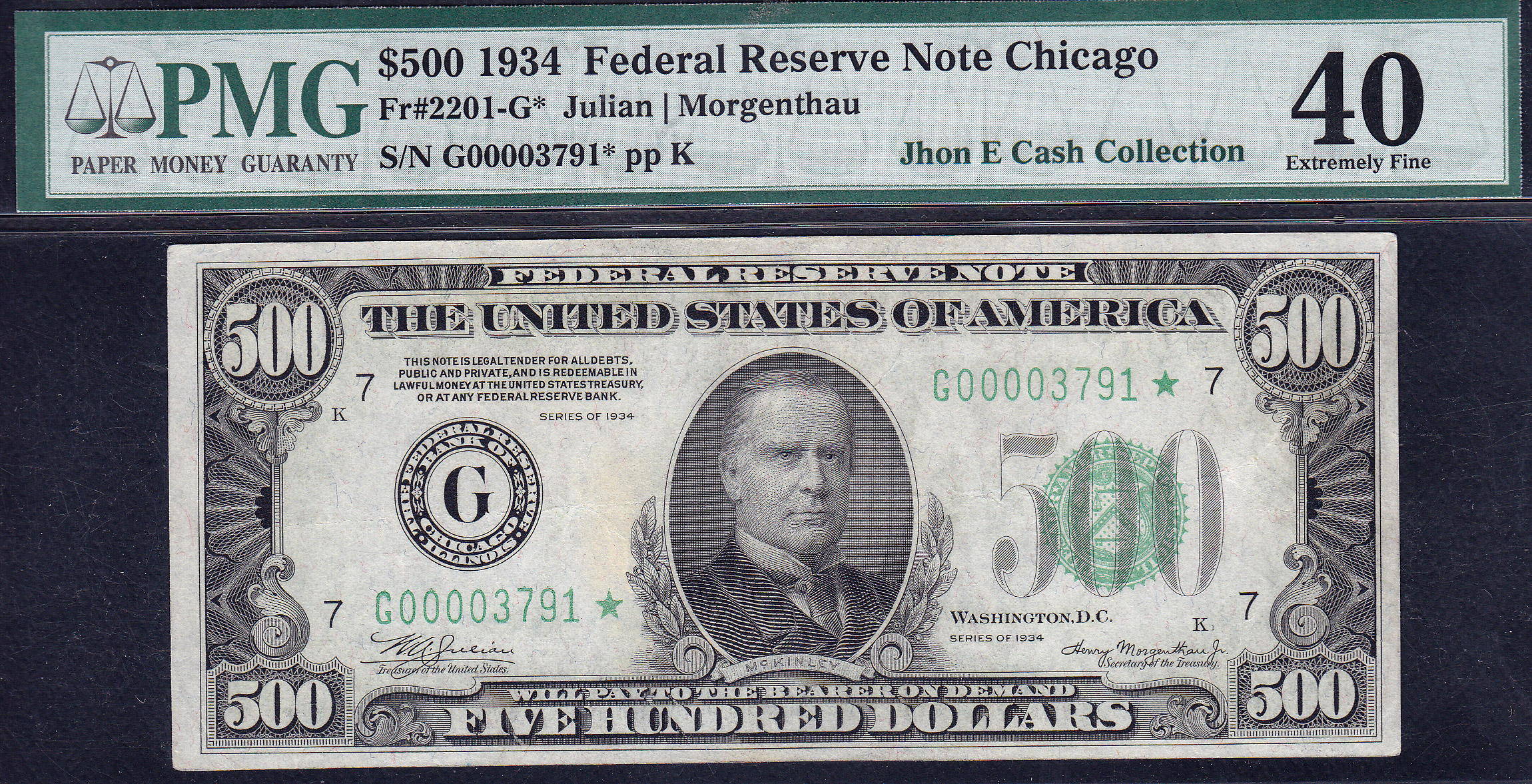 I bought this 1934 $500 Chicago star note in 2004. The serial number is G00003791* and is graded as a PMG VF-40. It is one of the best looking PMG EF-40s you'll ever see. A true no problem note with no rips, tears, pinholes, stains or anything else. great margins and no missing pieces. This is one of the better $500 Chicago stars I have to offer. This note currently resides in the Jhon E Cash Collection.