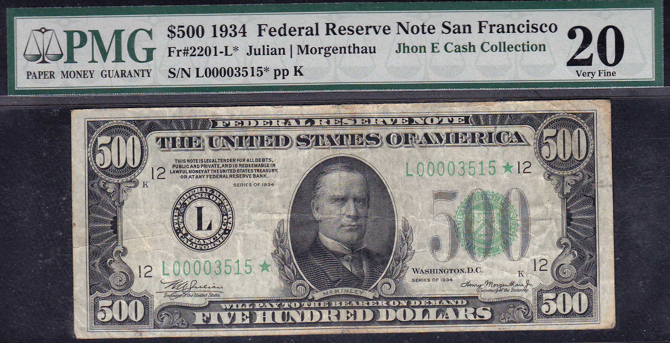 Fr.-2201L* 1934 $500 Star San Francisco PMG VF-20 Serial # L00003515*