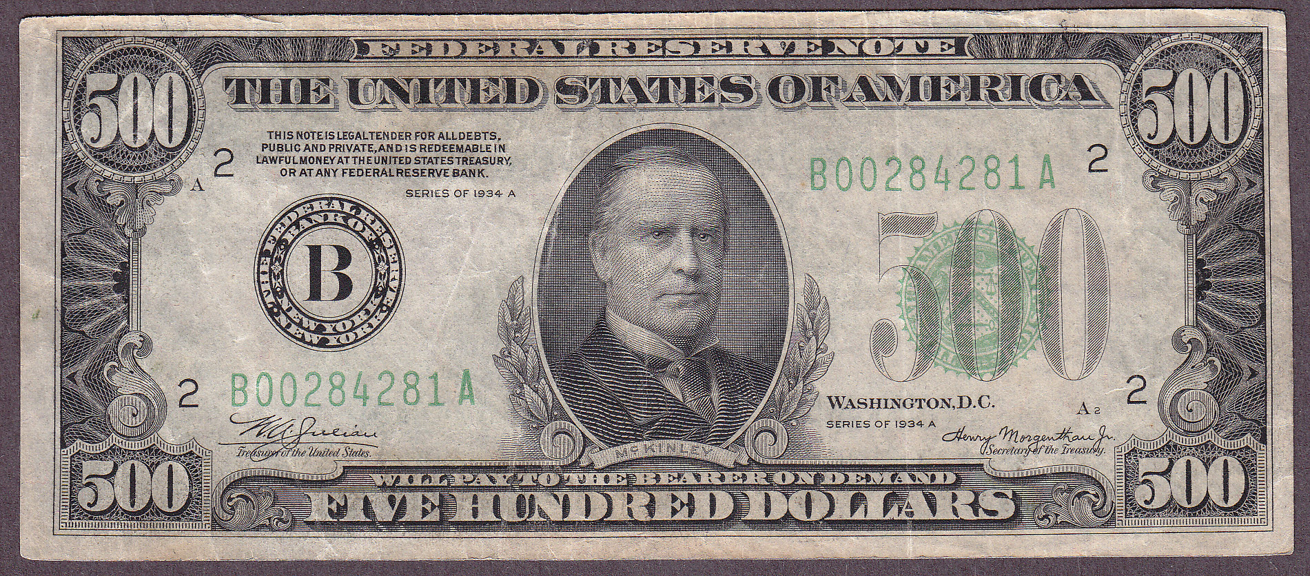 Here is a very nice problem free 1934A $500 FRN from NY. No rips, tears or pinholes.
