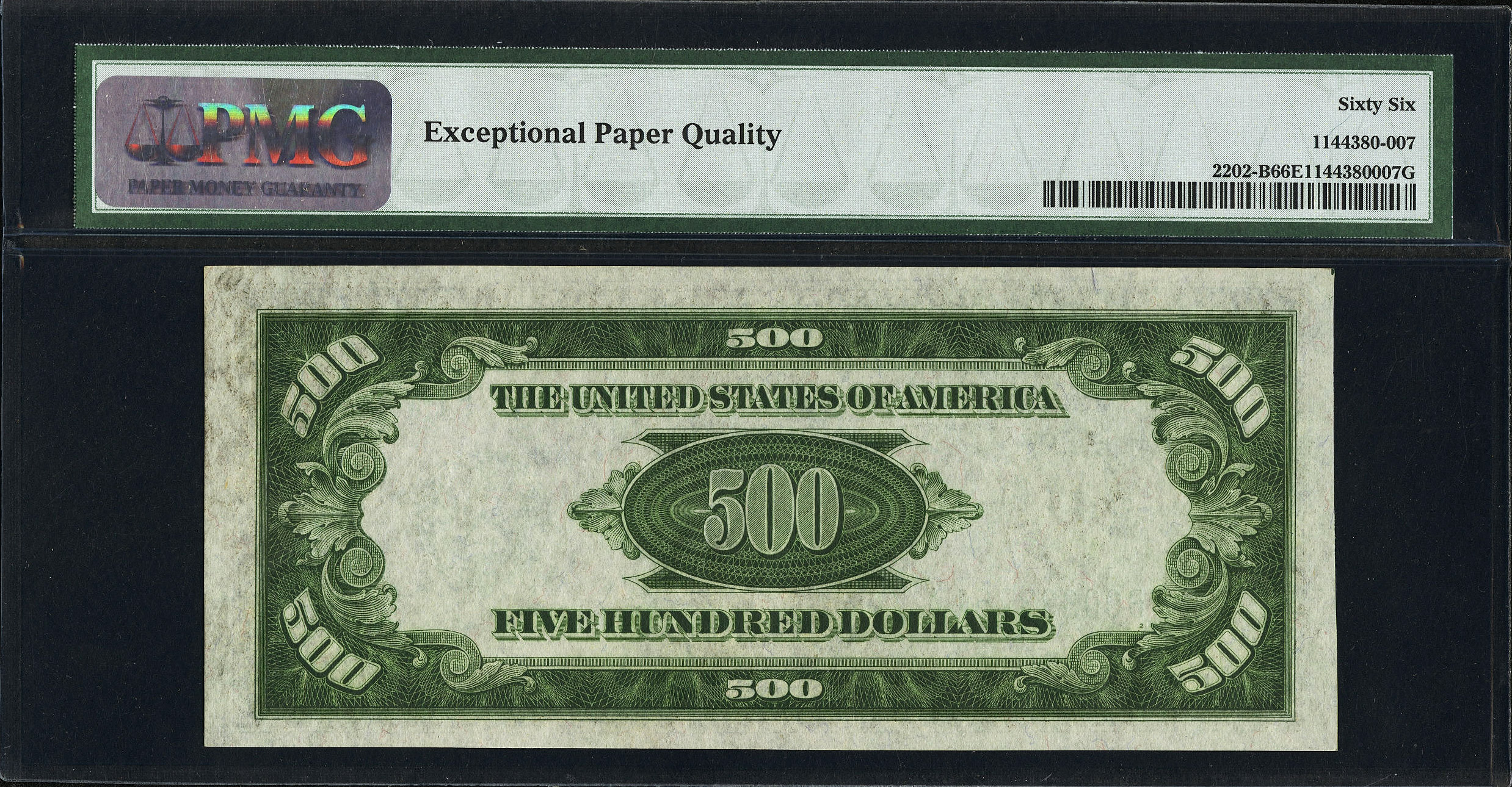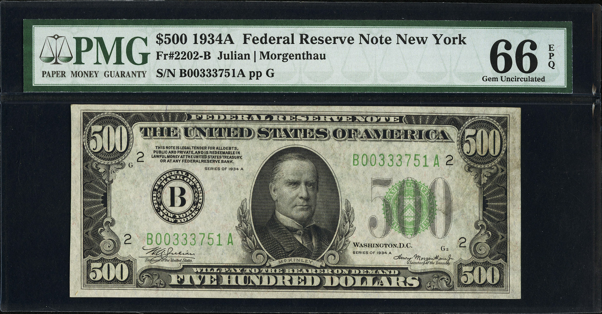 One of the finest known!!!!This fully margined and perfectly printed 1934A $500 FRN is the first one of a consecutive pair of notes that are equally nice and graded 66EPQ by PMG. It also boast wholly original paper surface and full broad margins on both sides. To date a lone superb 1934A $500 has been graded by PMG and PCGS combined, making this pair a hot ticket for register set collectors. THey do not get any better that this. Compared to a price on the internet of $4350.
