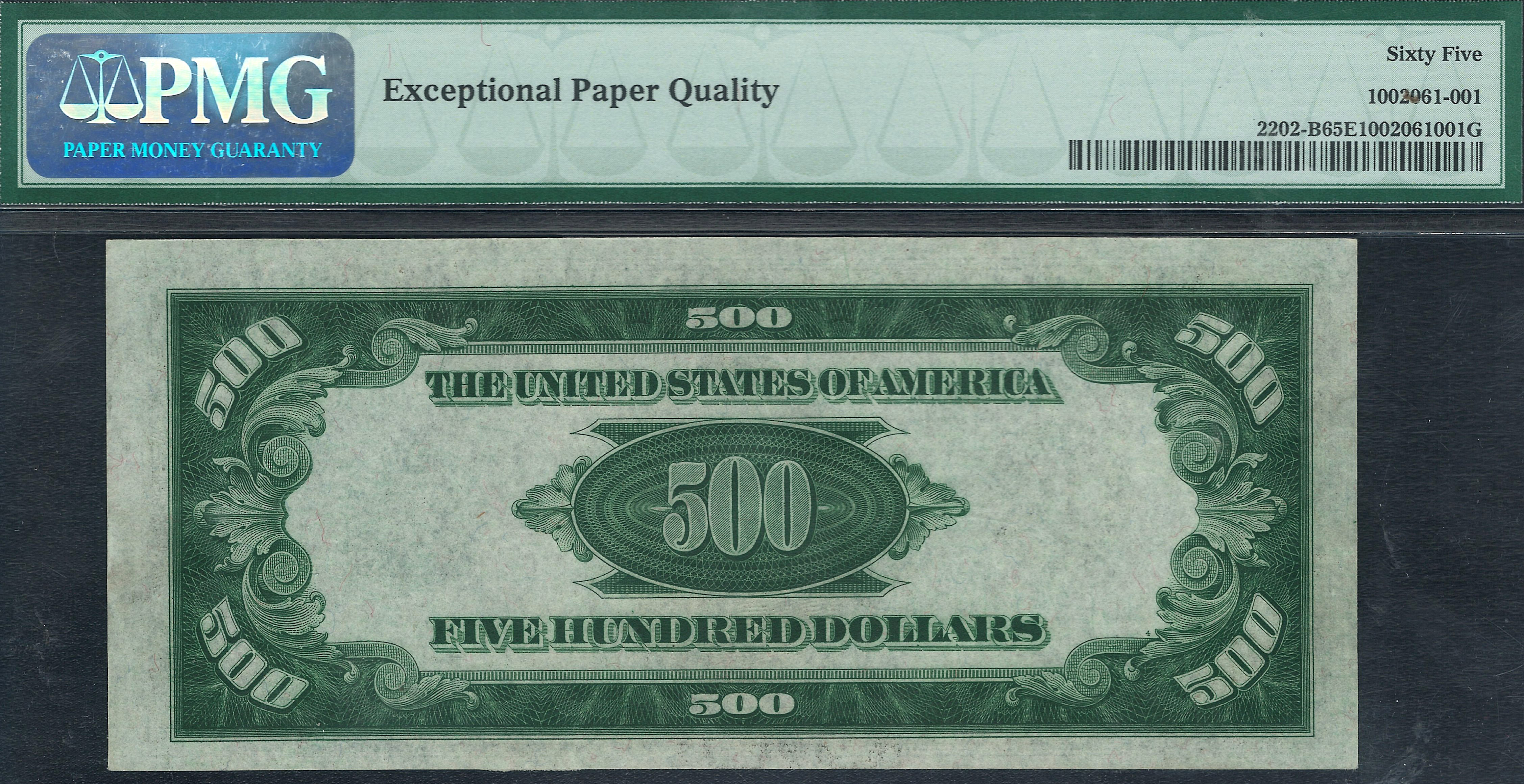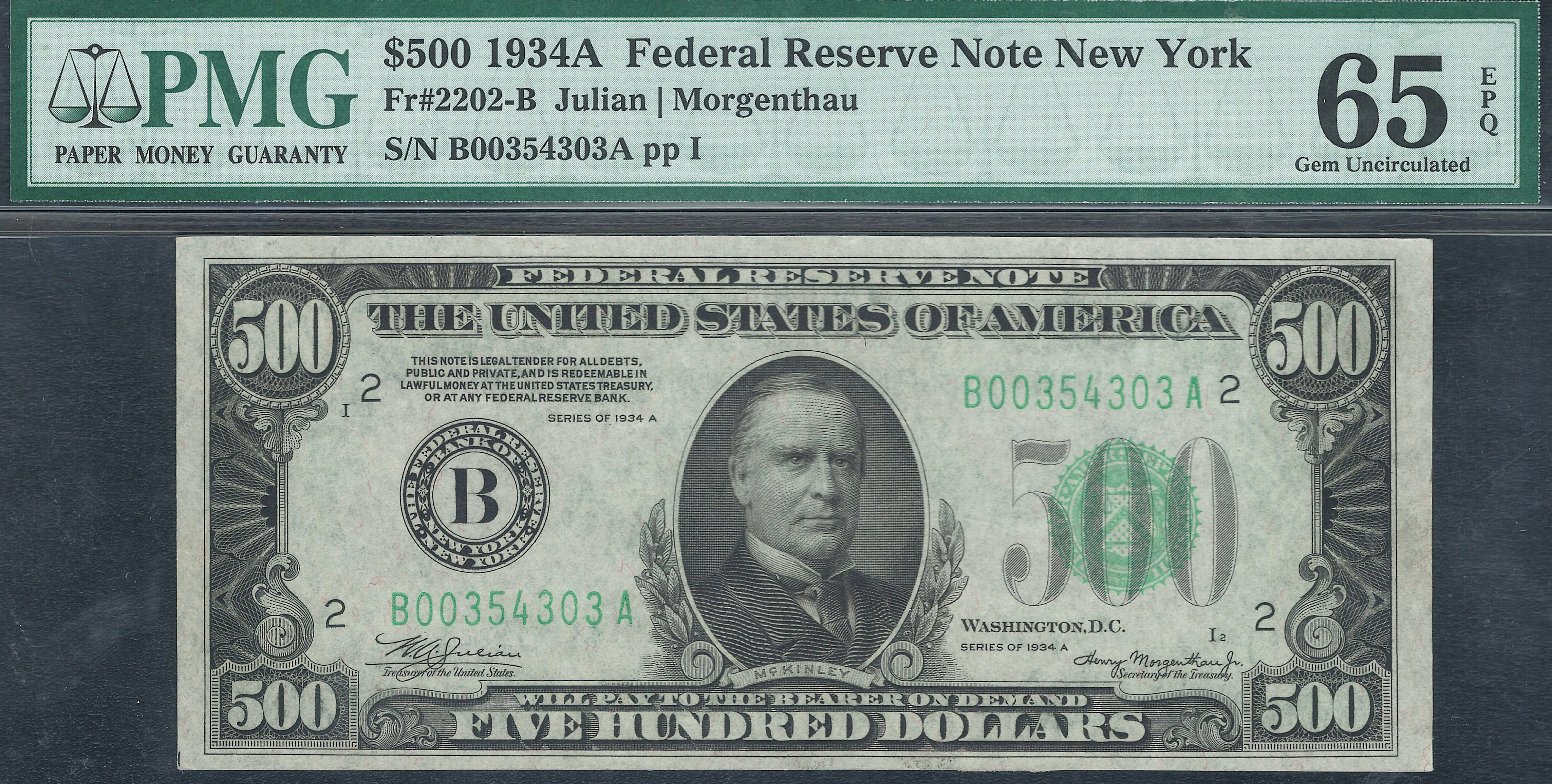 This is a very nice 1934A New York $500 FRN. The serial number is B00354303A and resides in a PMG GEM-65EPQ holder. 1934A $500 bills are more scarce than its little brother, the 1934 $500 series. As you view the note you will notice the nice even margins on the front and back. The green inks used is as vivid as the day it was printed 75 years ago. For those astute collectors who want to own one of the GEM versions of this series without paying a premium, this is your chance. I also have another 1934A series $500 from the Chicago district on the website also in a PMG-65EPQ holder as well as a 1934 $500 from the Chicago district in a PCGS-64PPQ holder.