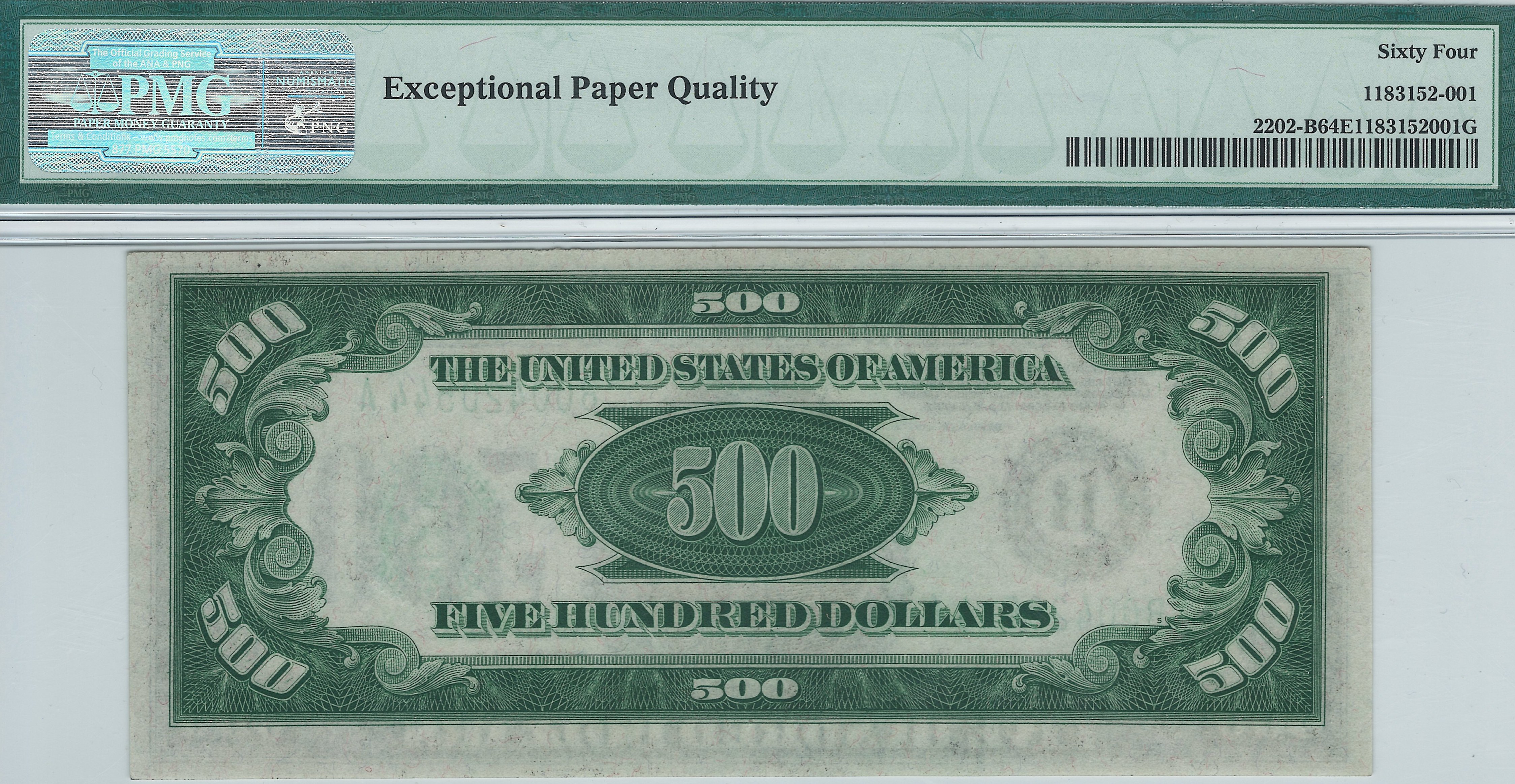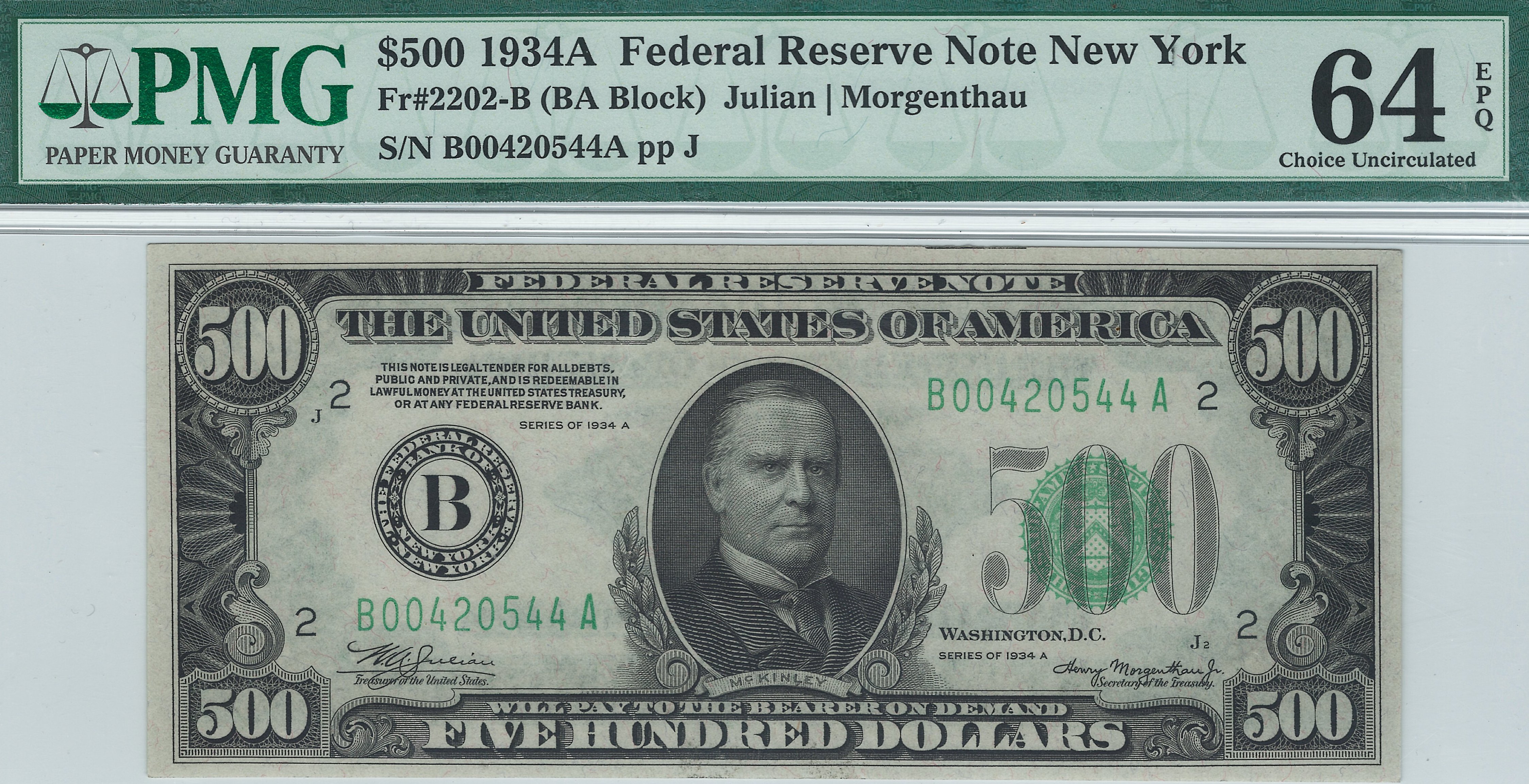 This is a stunning 1934A $500 Federal Reserve Note from the New York District. It is in a PMG-64EPQ holder. This 1934A $500 FRN has no rips, tears, pinholes, bank marks or anything else wrong. You can easily view the embossing on the reverse of the seal and serial numbers. The only thing better that this one is a GEM-65 note which would cost over a thousand dollars mote. The serial number is B00420544A