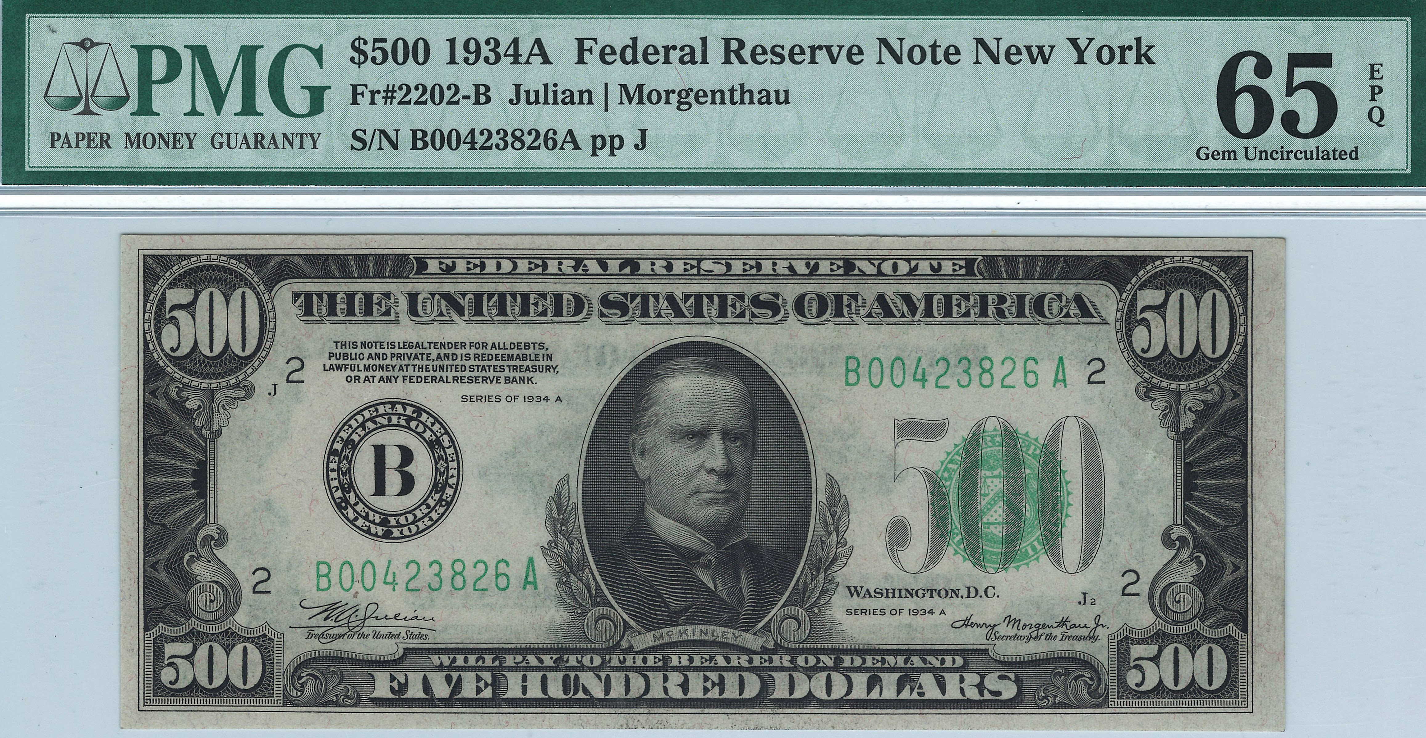 Fr.-2202 1934A $500 New York FRN Ser. B00423826A PMG 65 EPQ
