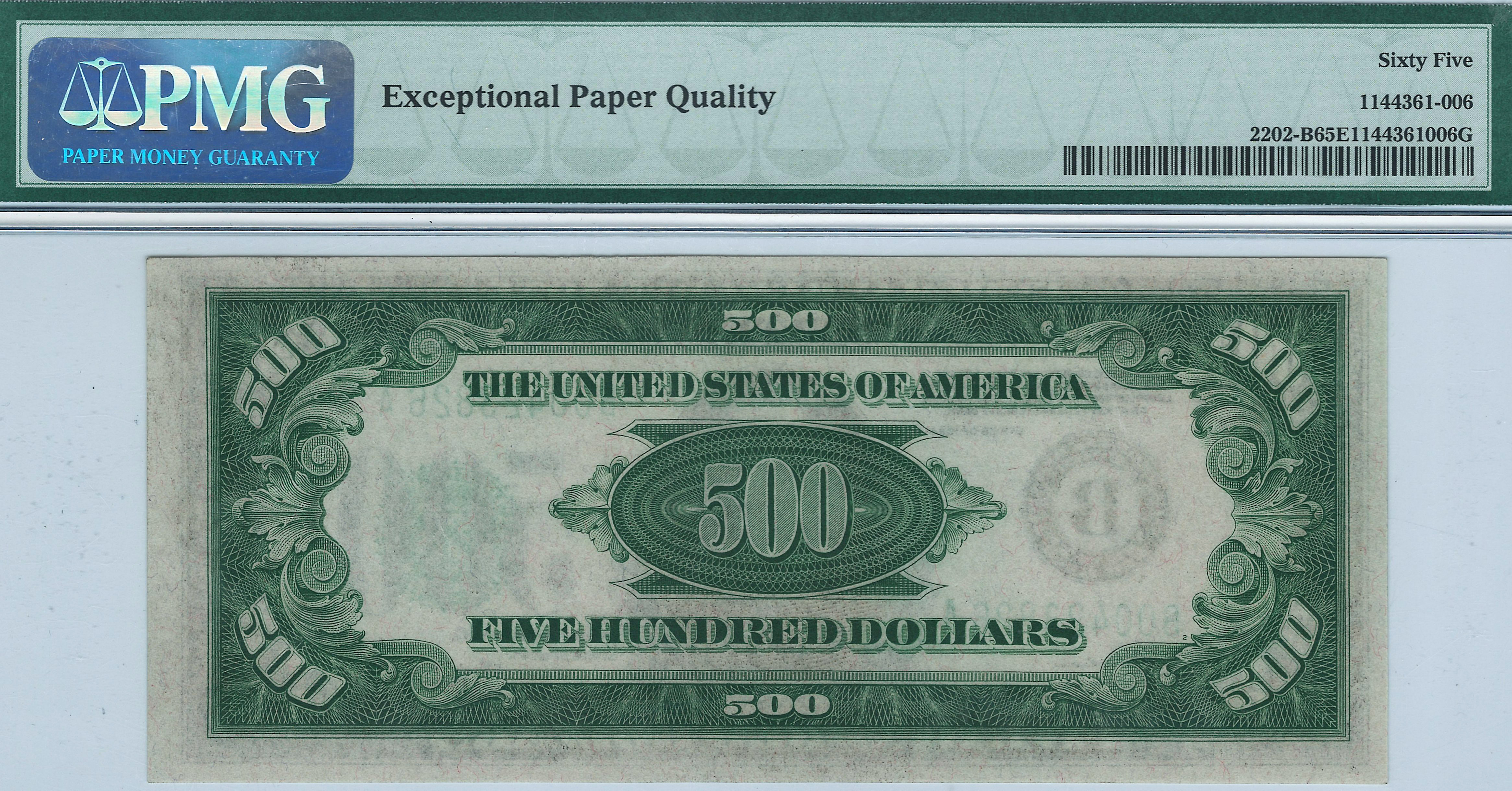This is a very n ice 1934A $500 FRN in a PMG-65PPQ holder. It is from the New York District. It is well centered and has the same vivid green inks as the day it was printed. The serial number is B00423826A and is in a PMG-65PPQ holder.