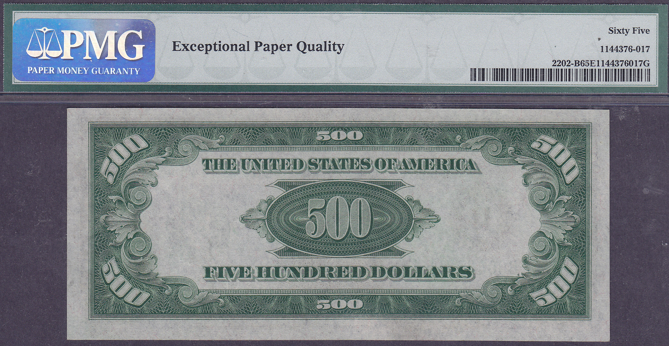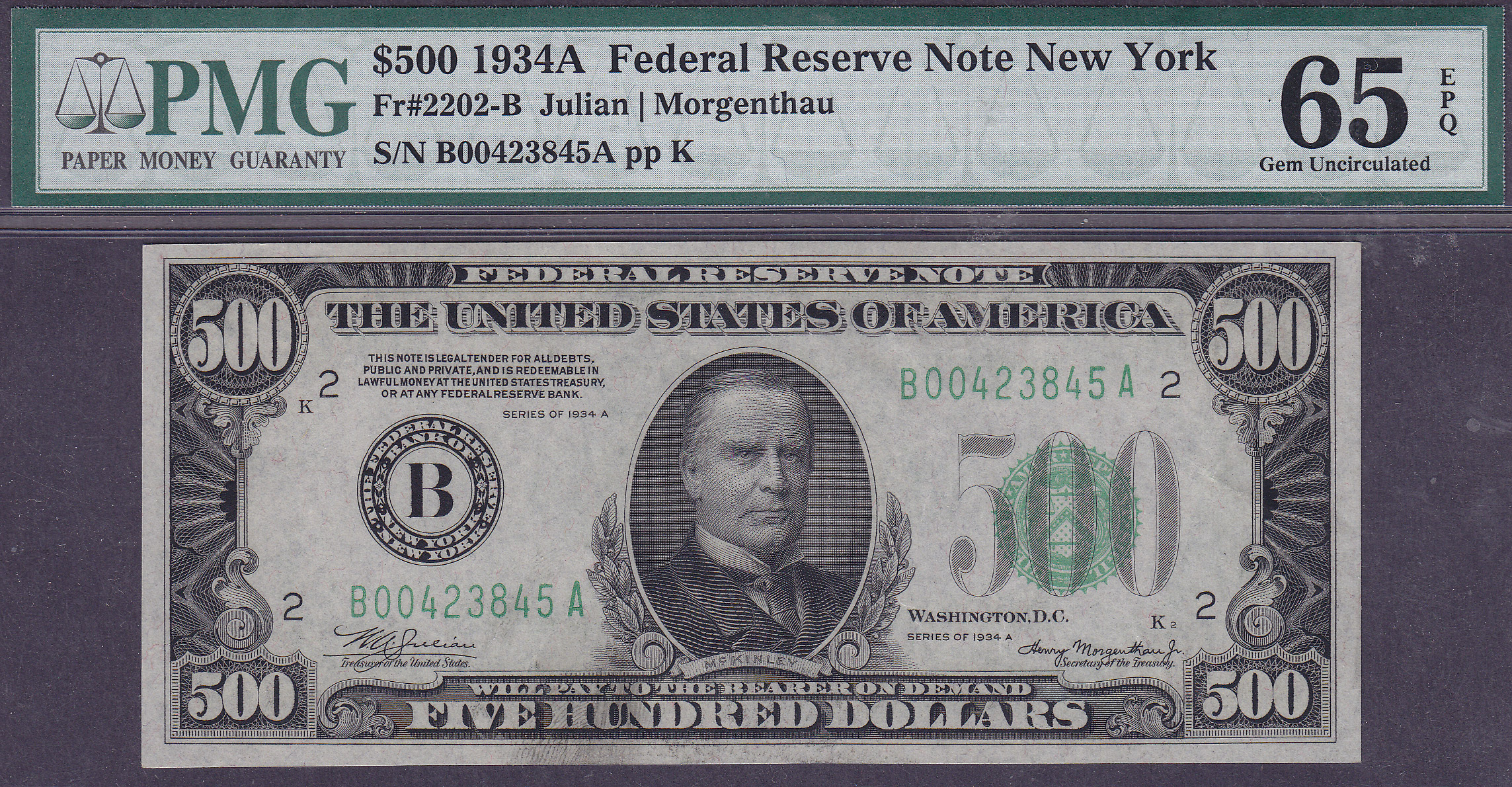 Fr.-2202 1934A $500 Federal Reserve New York Ser. B00423845A PMG-65 EPQ