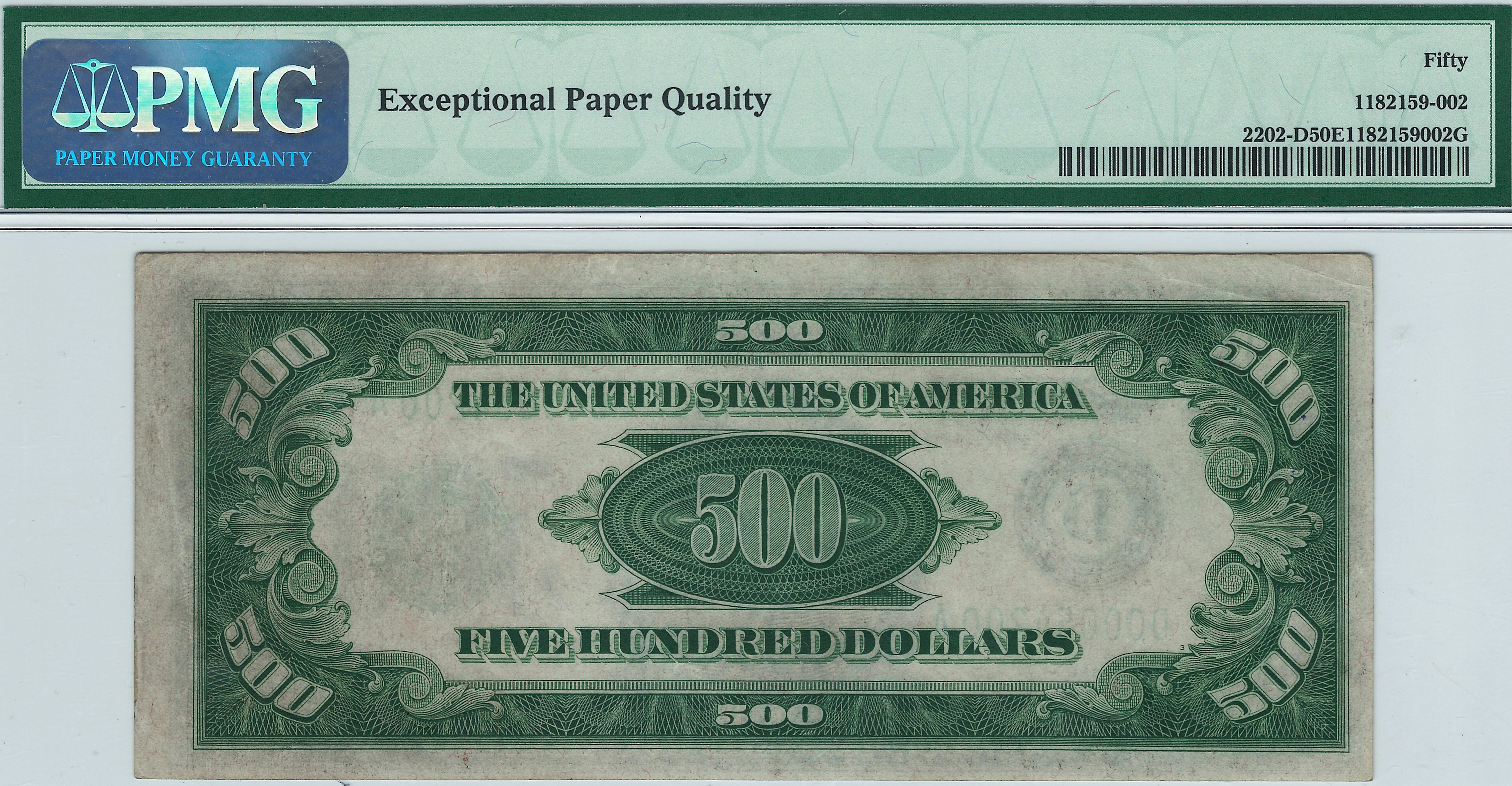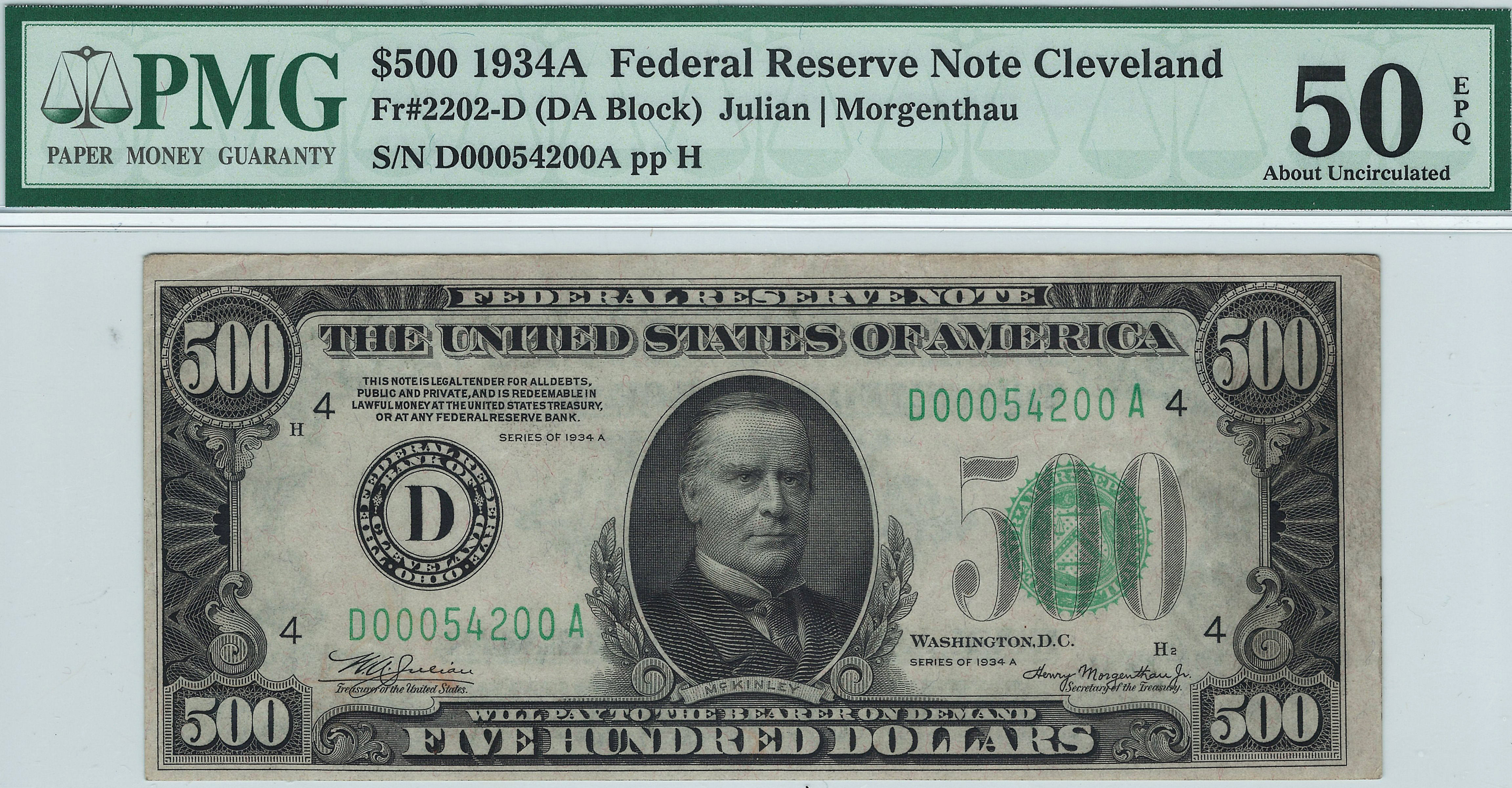 This is a very nice 1934A $500 FRN from the popular and tough Cleveland District. The serial number is D00054200A and is in a PMG-50EPQ holder. It is getting very difficult to find any original $500 or $1,000 bills anymore. Most all of them have been cleaned and pressed to try and enhance their value. So when you do find an original never doctored note, you jump at the opportunity to own it. Here today I offer you a very nice example with four squared corners and punch through embossing that can be seen through the holder. There are no rips, tears, pinholes or marks of any kind. Slight bank teller handling to the right top keeps it from a much higher grade. This is common as all notes had to be hand counted in vaults for bank inventory