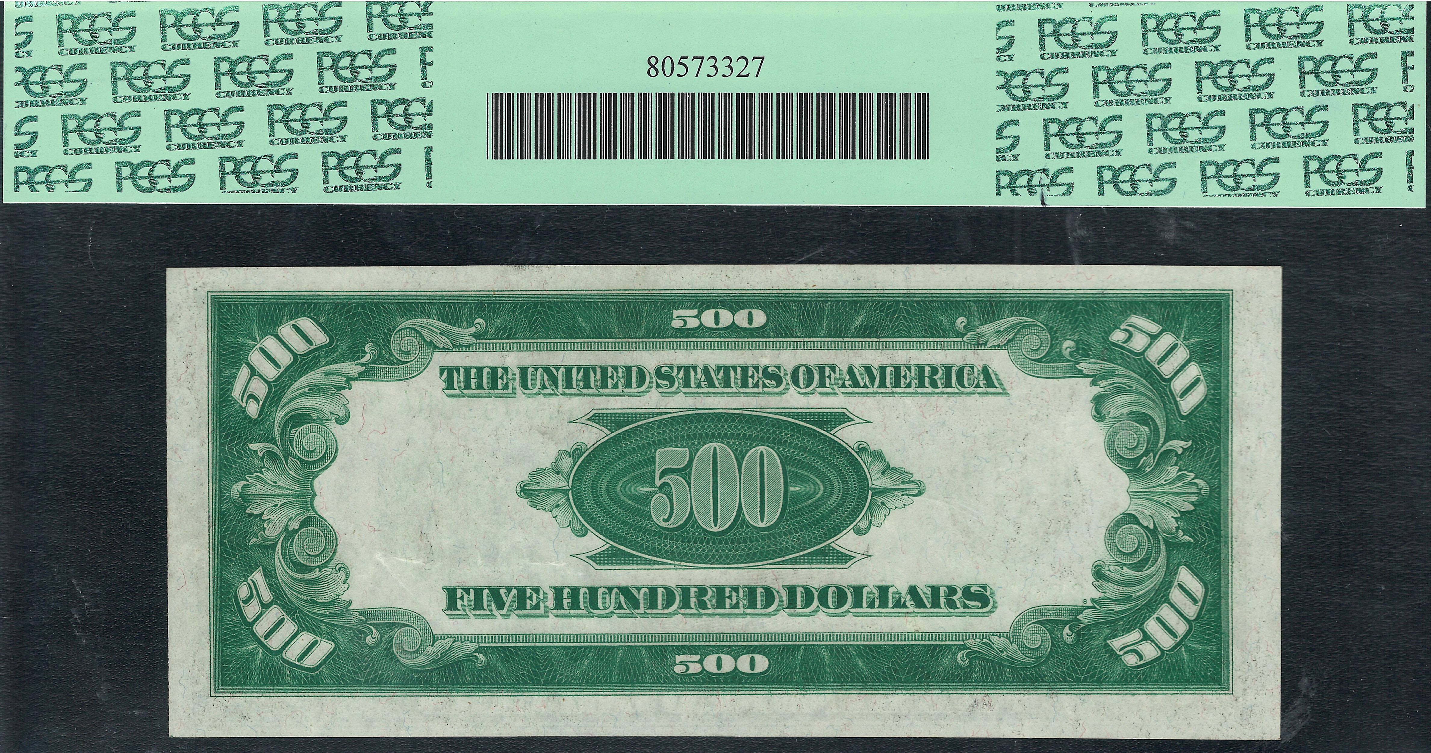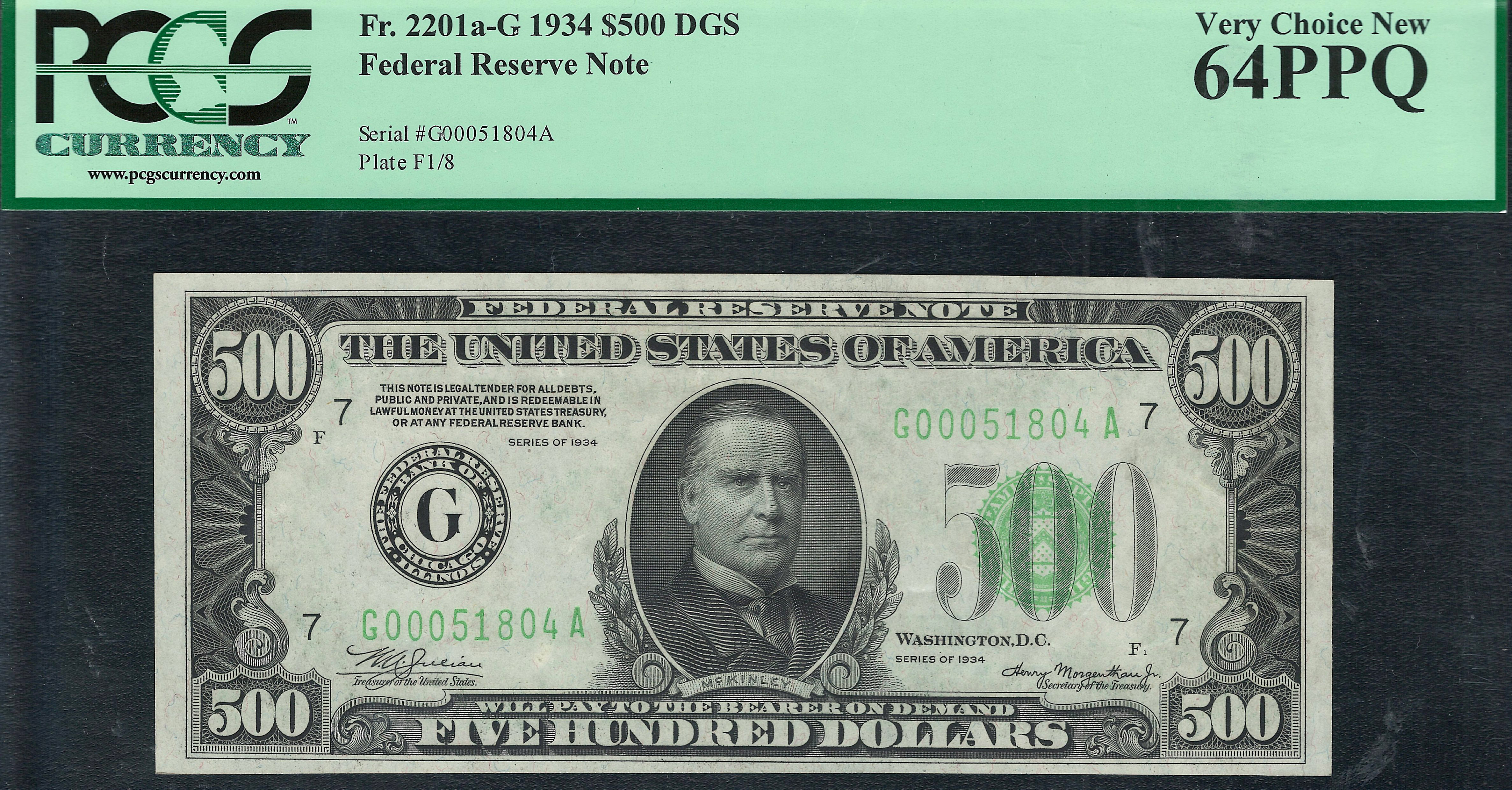 This is a nice example of an original 1934 mule Chicago $500 FRN. The serial number is G00051804A and is in a PCGS-64PPQ hilder. At the price I have this listed at it will not last long here on this website. It is totally original with NO rips, tears, pinholes, bank marks or any other issue. It has never been pressed or cleaned as most of the $500 and $1,000 bills have over the years.It also features the Dark Green Seal variety.