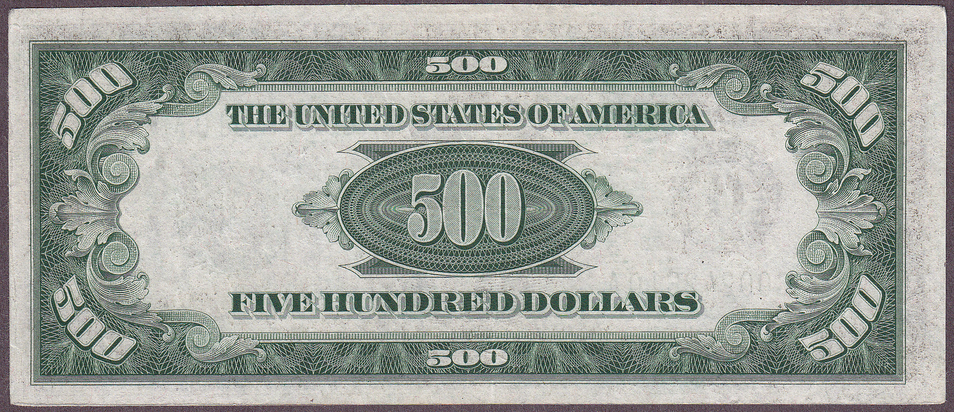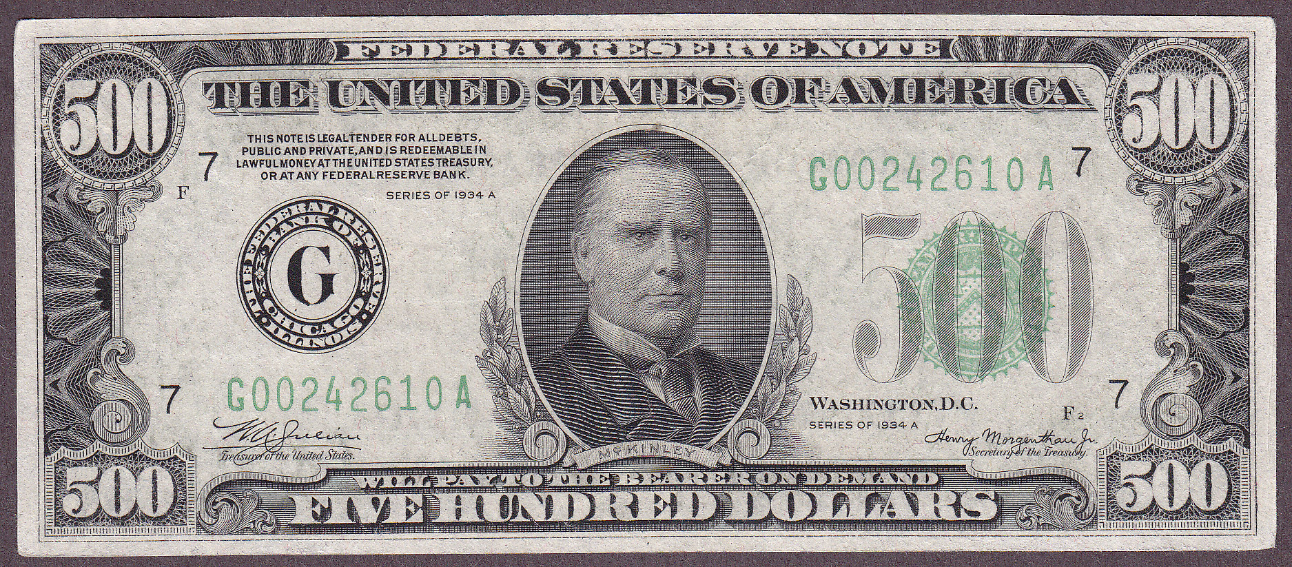This is a very nice and problem free 1934A $500 FRN from the Chicago District. The serial number is G00242610A. As you view the large scans you will notice that there are no rips, tears, pinholes or heavy soil or folds. It is a very collectible note. It is a lightly circulated problem free condition.
