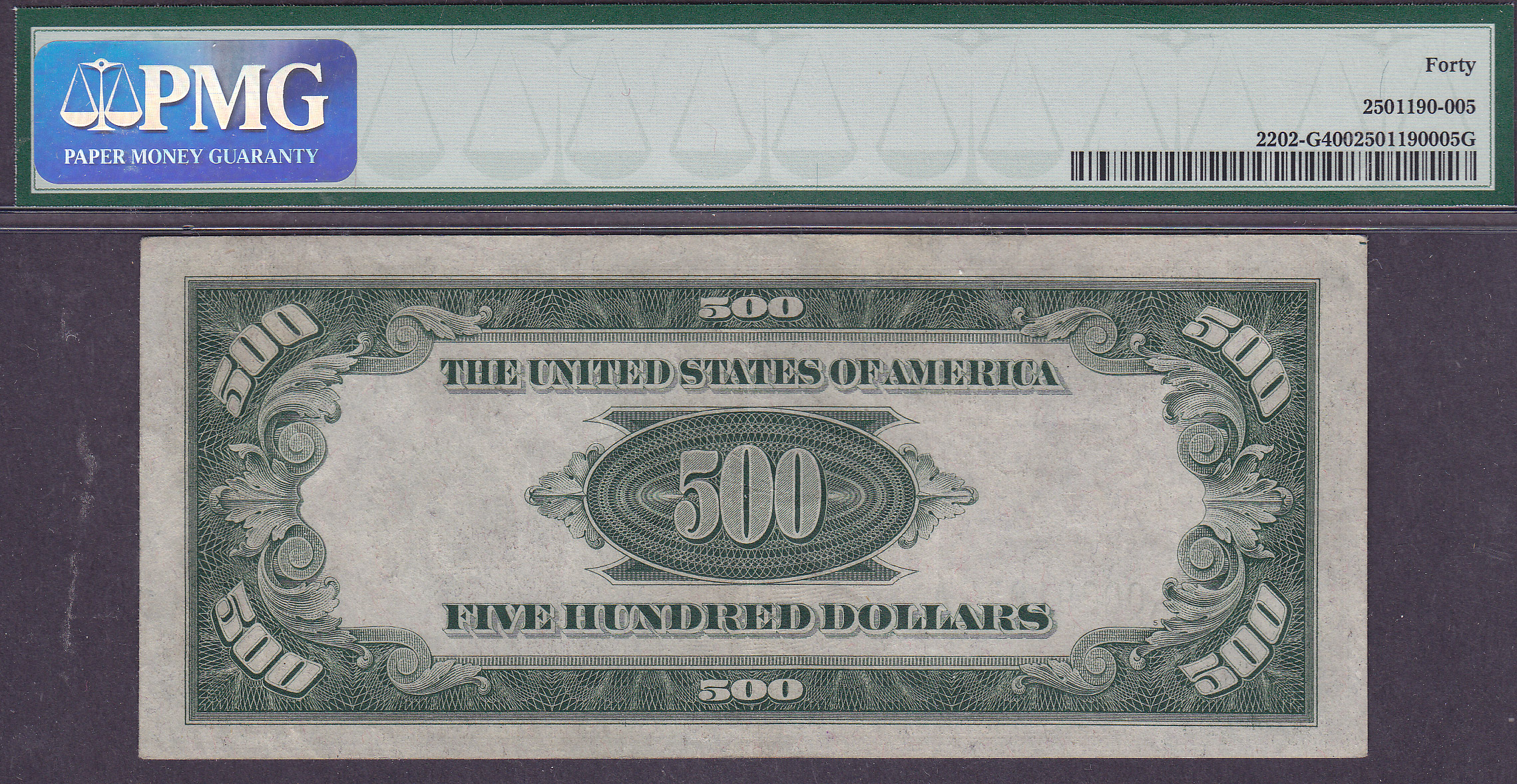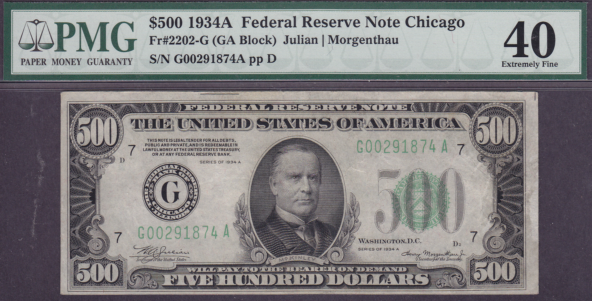 Here is a very nice Very Fine/Extra Fine 1934A $500 Chicago FRN. There are no rips, tears, pinholes, bank marks or anything else that would distract from this note. The serial number is G00291874A. A good price for a solid problem free $500 Federal Reserve Note.