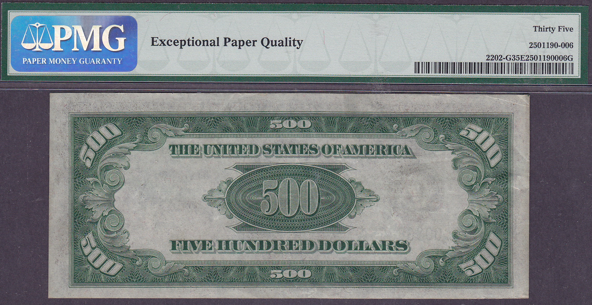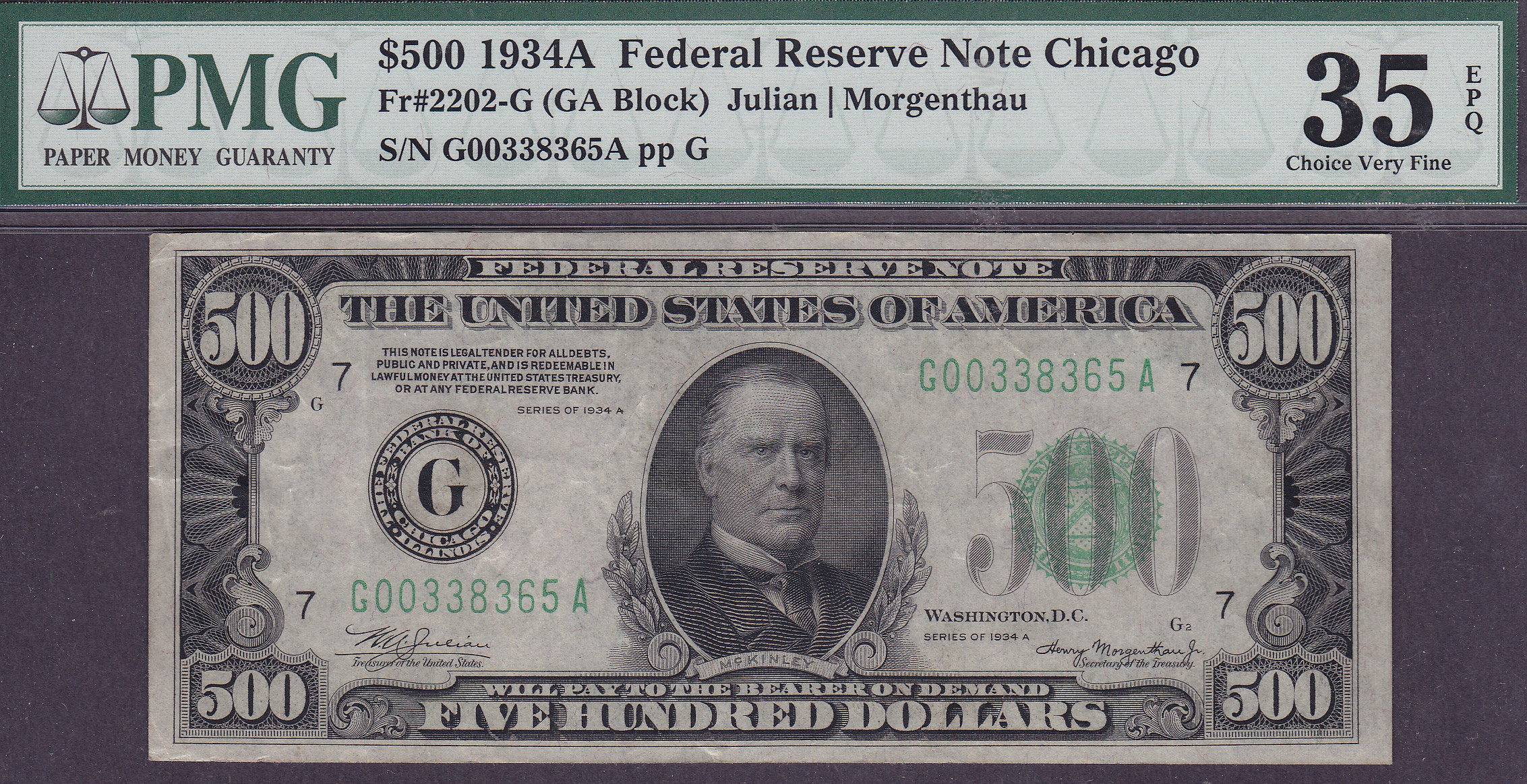 Here is a very nice totally problem free 1934A $500 bill from the Chicago district. It has never been pressed or cleaned. It is housed in a PMG VF-35EPQ holder. You can see and feel the embossing. There are no rips, tears, bank marks or pinholes. The margins are full on both sides. the green inks are as clear as the day is was printed. This would make a great note for the person who does not want to spend a bundle on a UNC note. The serial number is G00338365A.