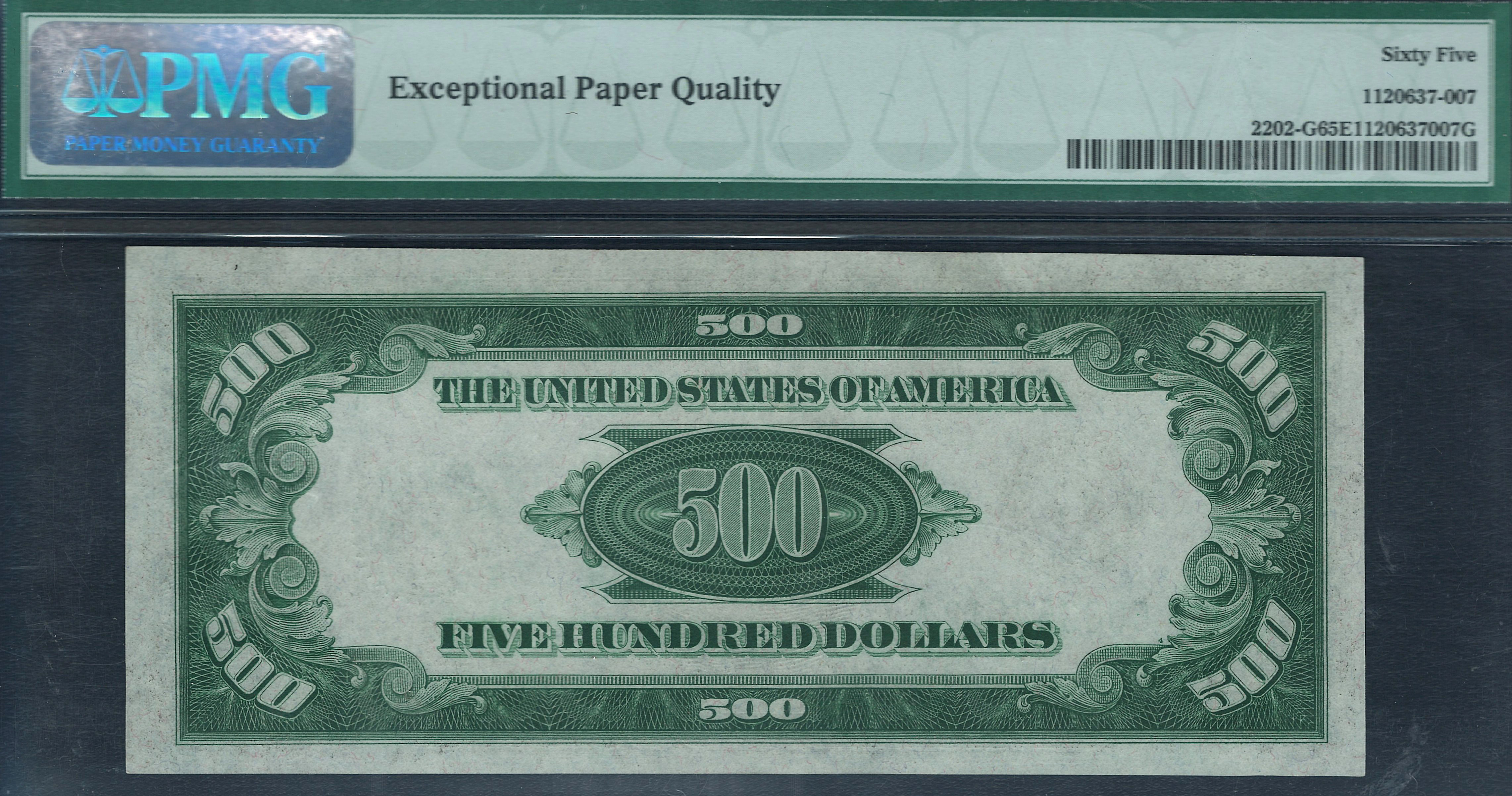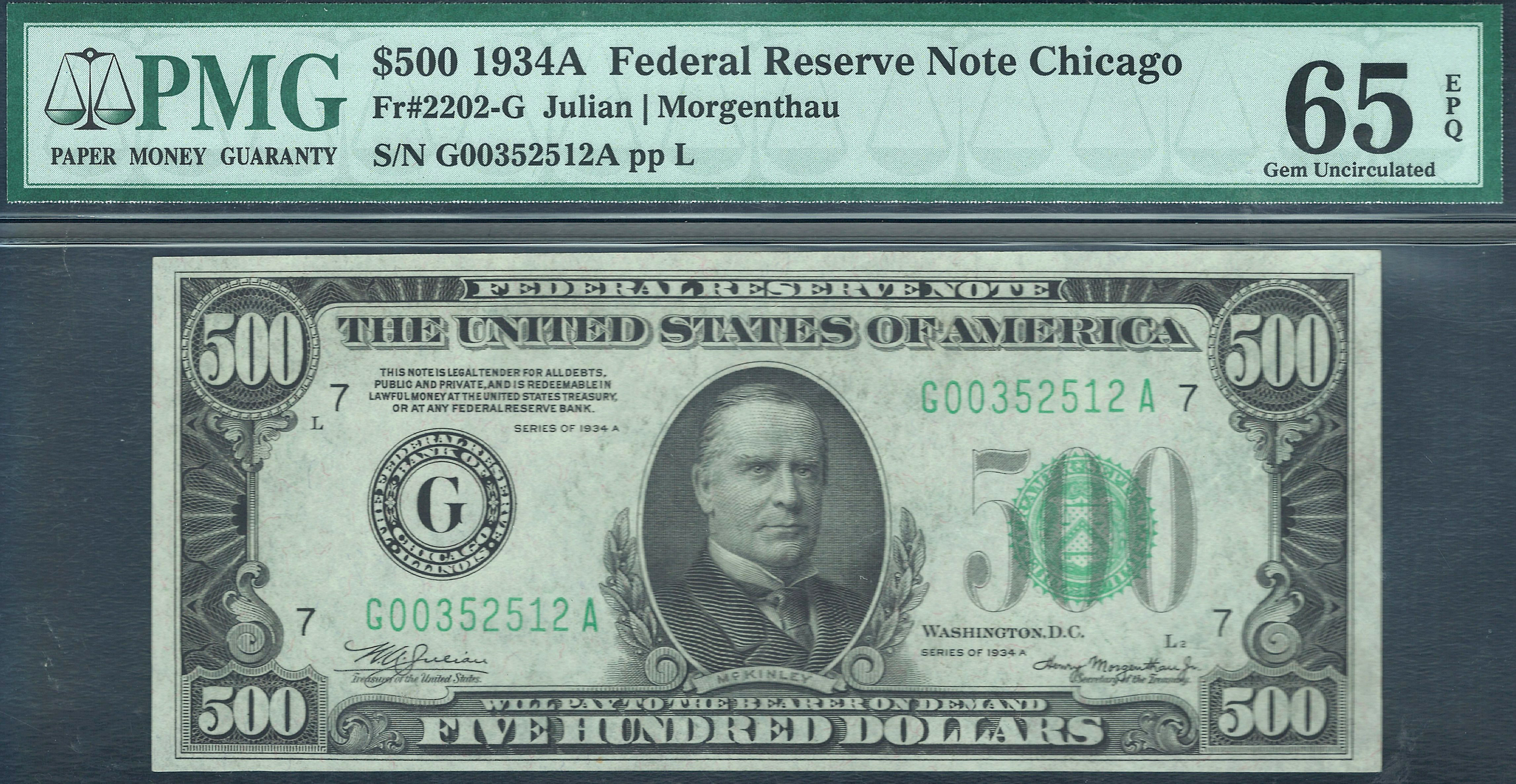 This is a very nice 1934A Chicago $500 FRN. The serial number is G00352512A and resides in a PMG GEM-65EPQ holder. 1934A $500 bills are more scarce than its little brother, the 1934 $500 series. As you view the note you will notice the nice even margins on the front and back. The green inks used is as vivid as the day it was printed 75 years ago. For those astute collectors who want to own one of the GEM versions of this series without paying a premium, this is your chance. I also have another 1934A series $500 from the New York district on the website also in a PMG-65EPQ holder as well as a 1934 $500 from the Chicago district in a PCGS-64PPQ holder.