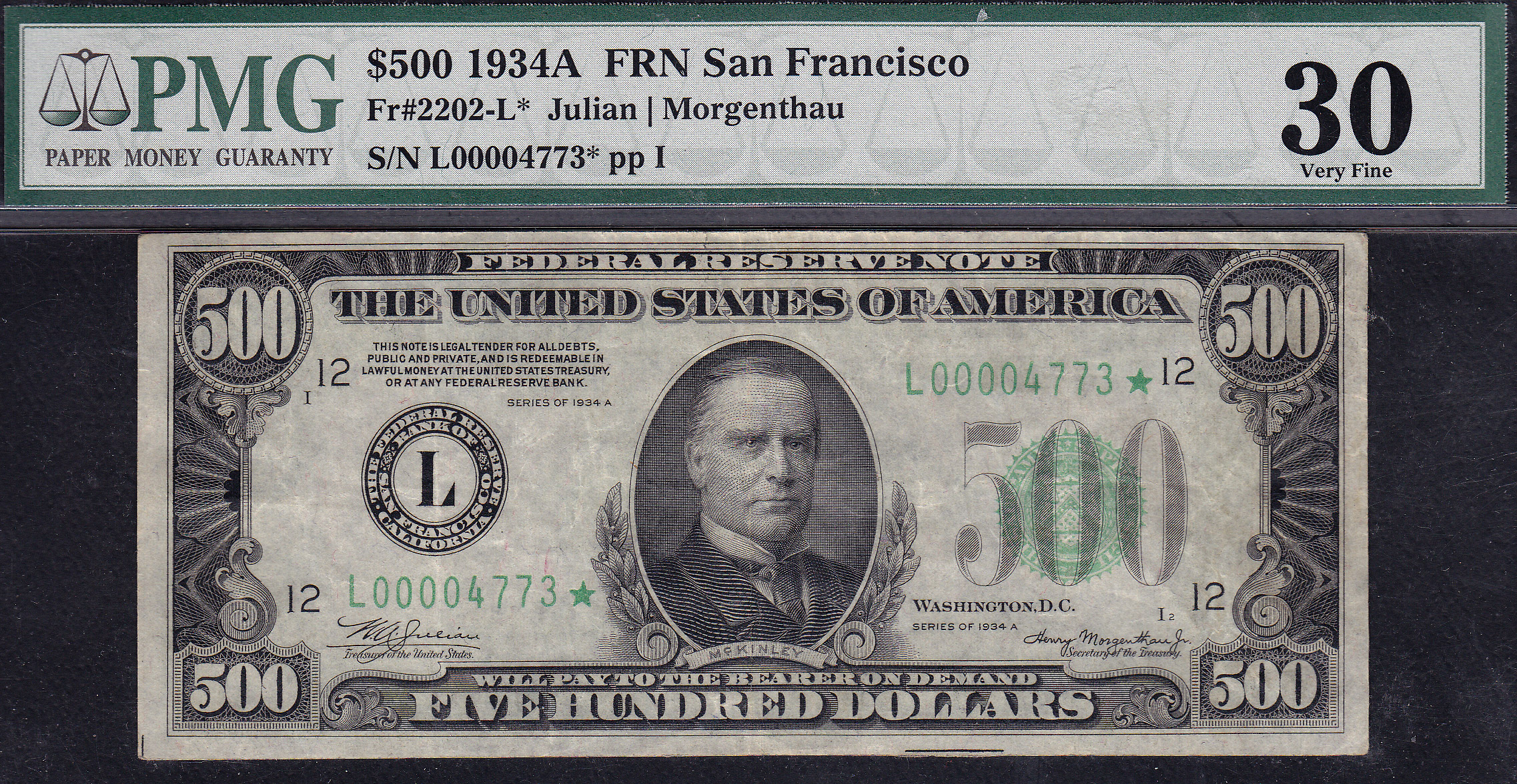 Fr.-2202L* 1934A $500 San Francisco PMG VF-30 Serial # L00004773*