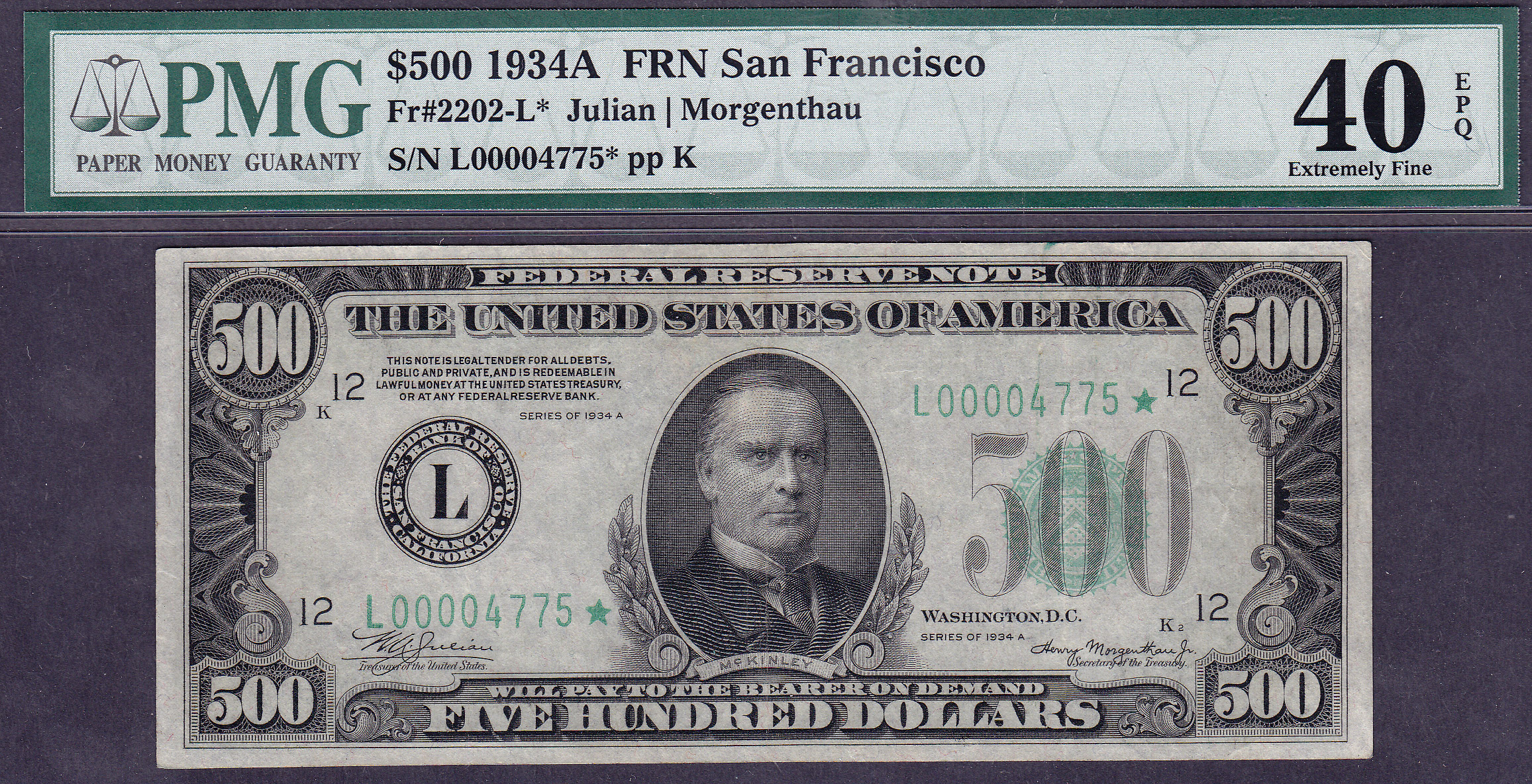 Fr.-2202L* 1934A $500 San Francisco Star PMG EF-40EPQ Serial # L00004775*