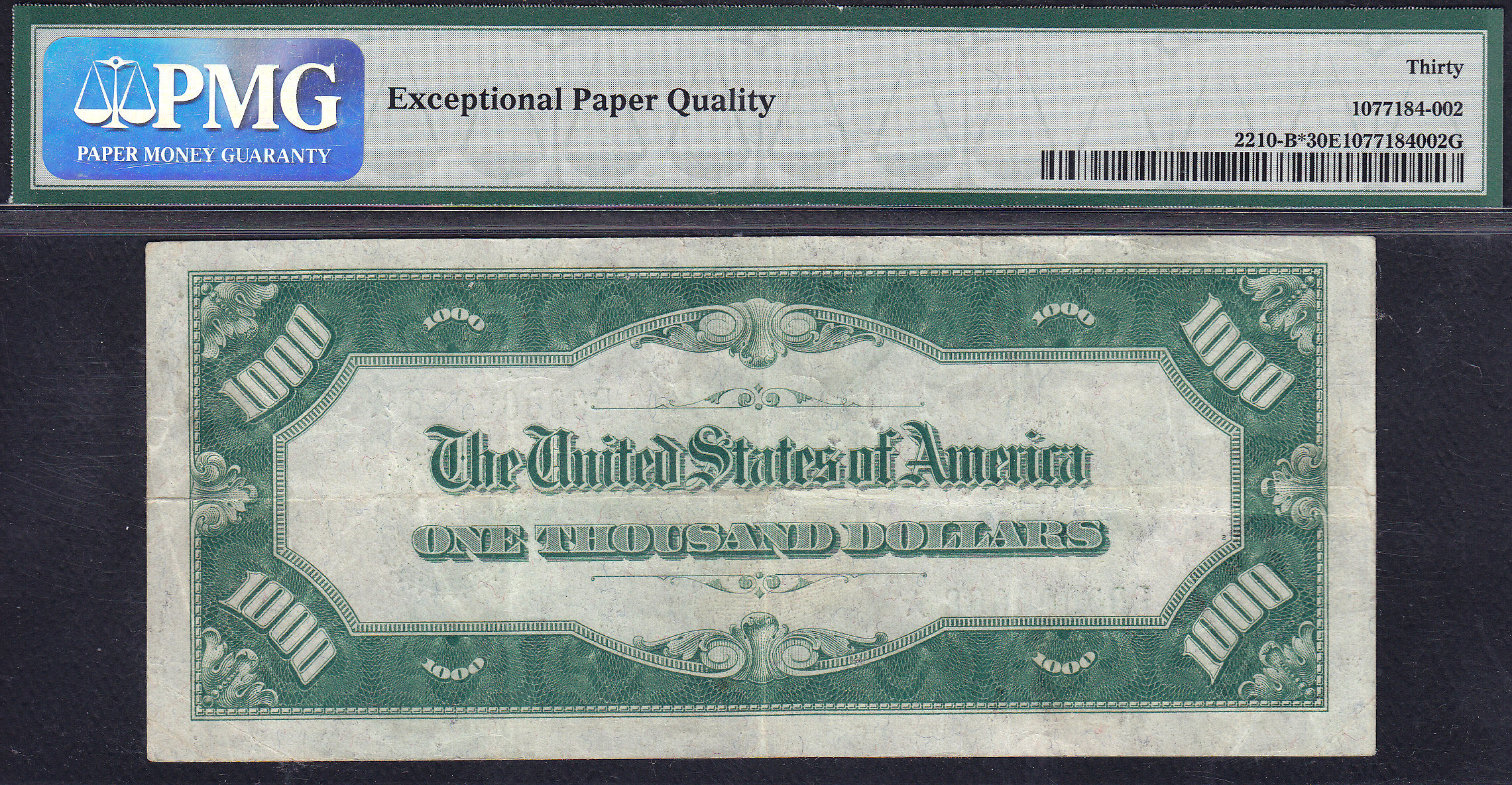 Here is another rare 1928 $1,000 Star note. I own two of the 14 known 1928 $1,000* star notes. This is from the New York District. There are two known the other one is serial number B00000111*. It is F/VF and it sold for $52,000 in January 2006. It had issues. It will never bee seen again. This note has the EPQ notation which means it is 100% original, never messed with as is most of these rare star notes. This note currently resides in the Jhon E Cash Star Collection. This note is also the second lowest serial number star known of all 14 1928 $1,000 star notes. A 1928 $1,000 Star from the New York district just sold at the FUN show in Orlando on 1/12/2013 for $76,875 in a PCGS-63 holder. These 1928 $1000 stars are very rare and highly desirable by collectors. They only show up every year or so.