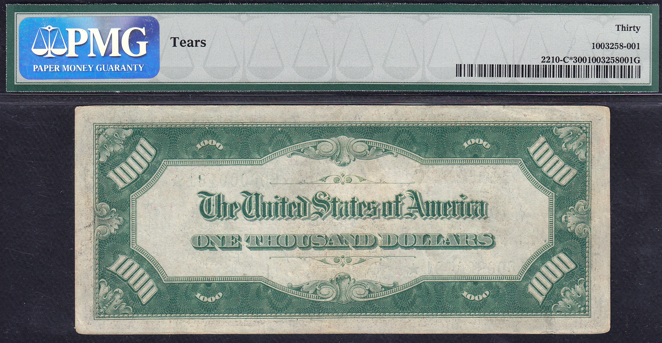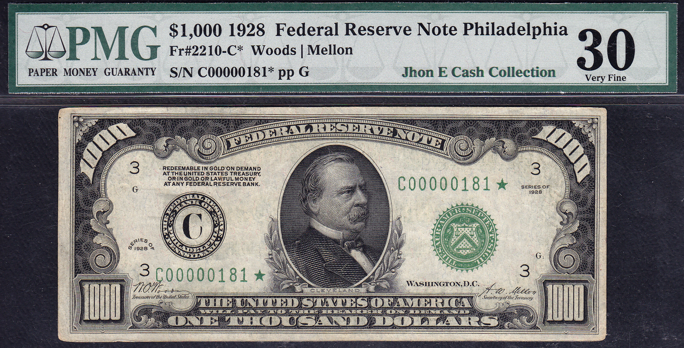 This is one of the 14 1928 $1,000 FRN star notes known to exist in all districts. How rare is that? Recently I sold a 1934 $1,000 FRN star note for $72,000 from the Dallas district. This is a 1928! There are 14 1928's, 113-1934''s and 13-1934A''s for a total of 140 known. This is also one of the finest known 1928 $1,000 stars of districts. It currently resides in the Jhon E Cash Collection. Funny thing, this 1928 Philadelphia $1,000 star has the same serial number C00000181* as my 1934 New York $1,000 star from new York, B00000181*.