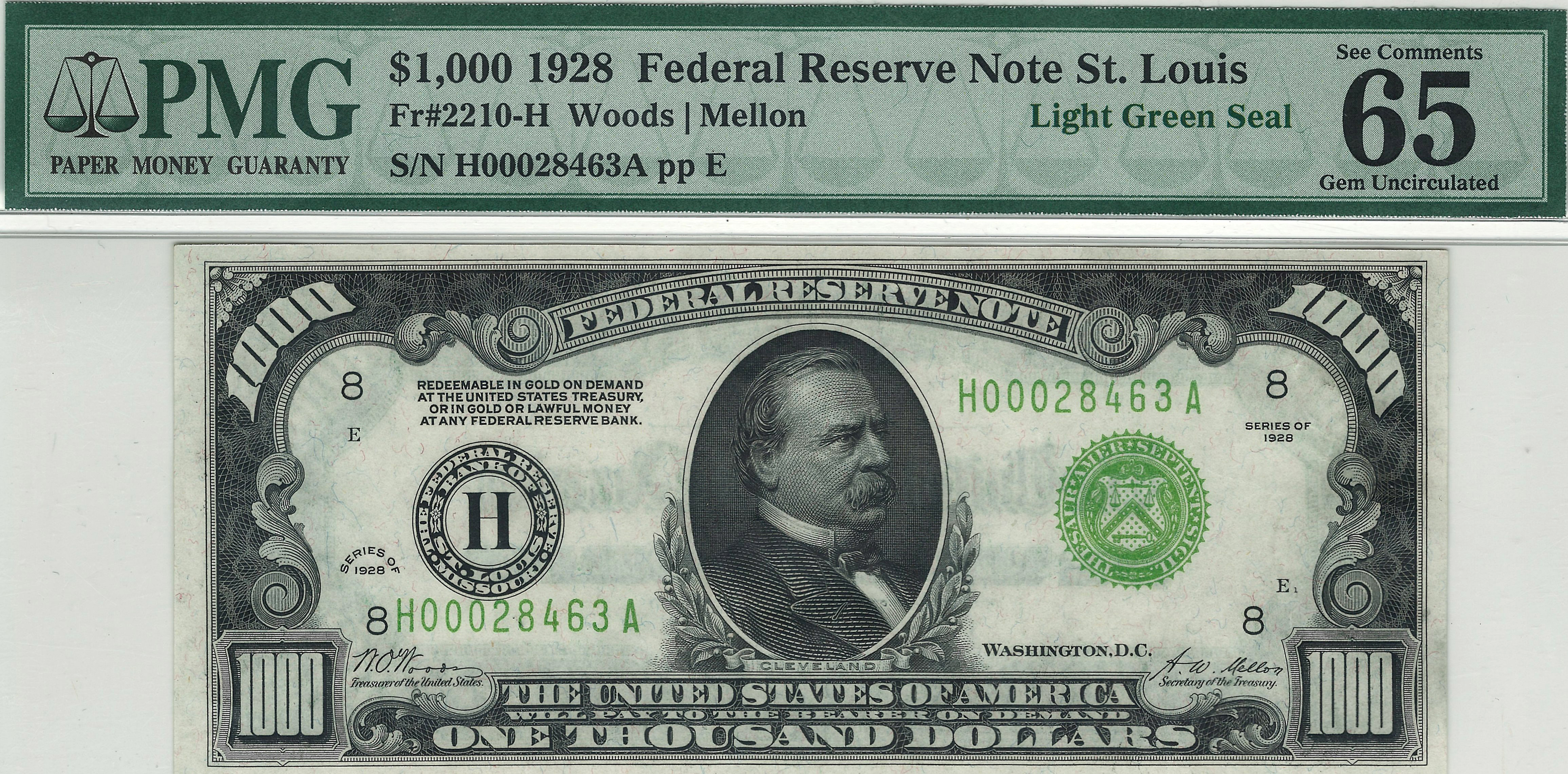 This is a very nice high grade Fr.-2210H or a 1928 $1,000 FRN from the popular St Louis District and features the scarcer Light Green Seal (LGS) variety. The serial number is H00028463A and is in a PMG-65EPQ holder. According to the PMG website this note is a POP1/0 with none finer. Other words it is the finest known or tied with the finest known. Here is a breakdown of some recent comps of 1928 $1,000 bills sold from the FUN Show held in Orlando, Florida held from January 10 to the 13th, 2013.