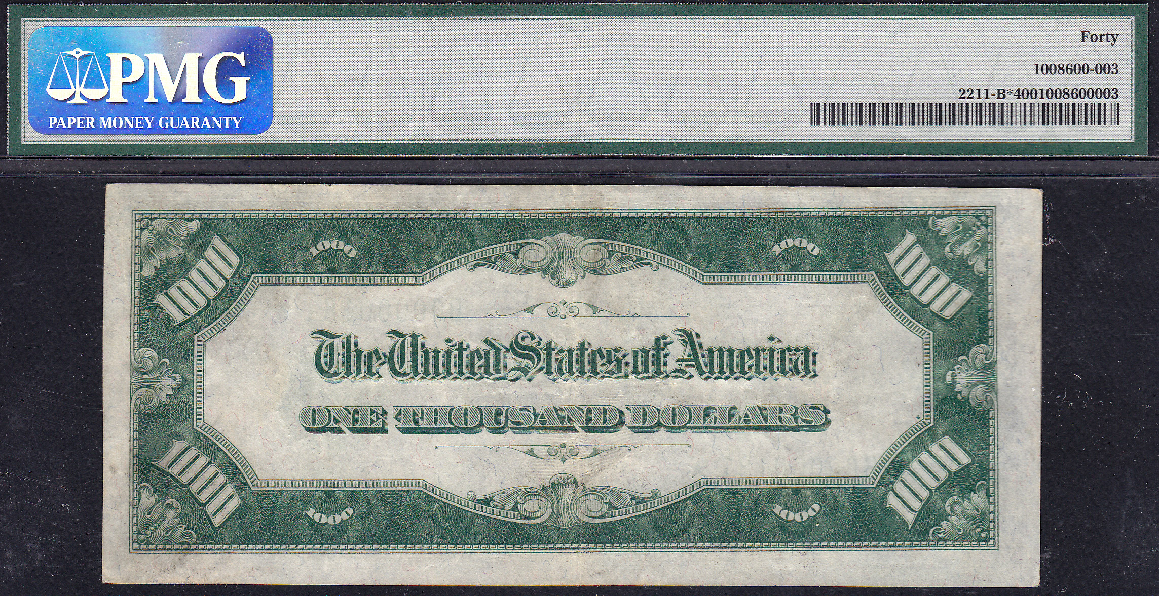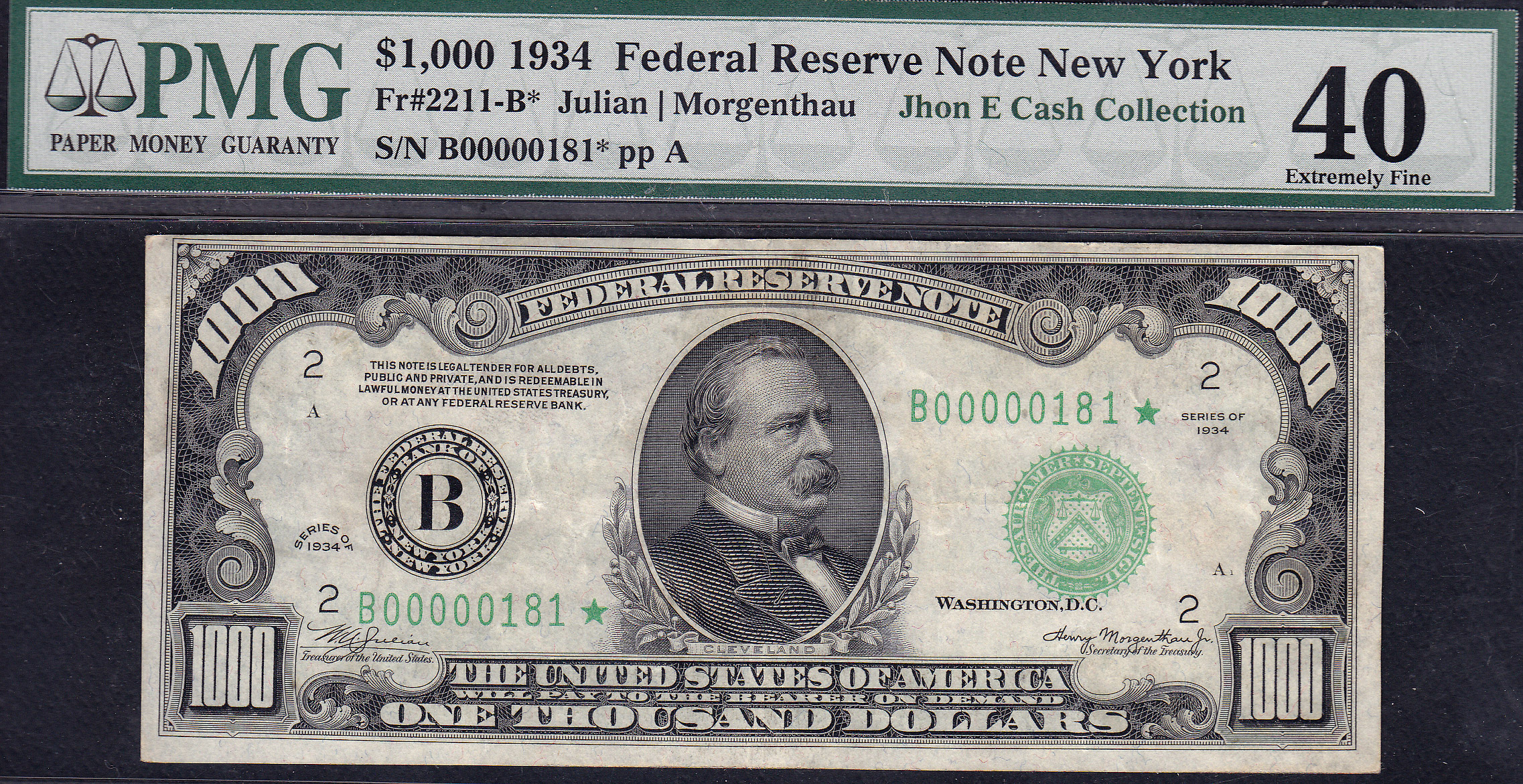 This is the one of three 1934 $1,000 New York stars known. It is graded as a PMG EF-40 note. There are no rips, tears or pinholes. If this were a coin, I could semi-retire. This is also the lowest serial number known. It currently resides in the Jhon E Cash Star Collection.