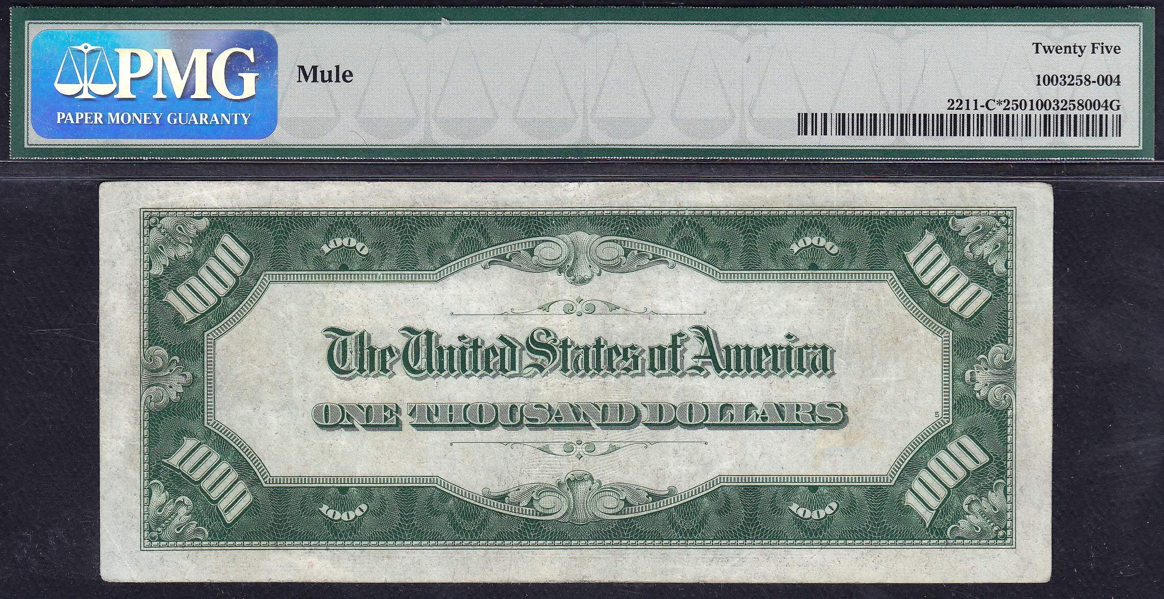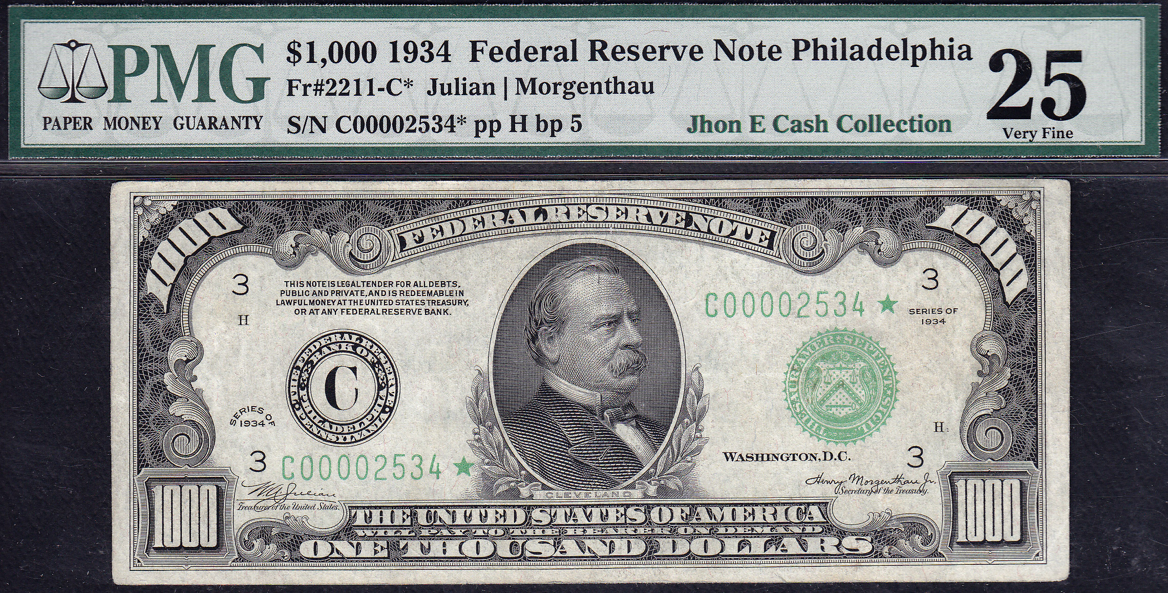 Philadelphia Freedom! This is a real nice example of the 1934 $1,000 Philadelphia star note. There are only ten (10) examples of this Philly star known. The serial number is C00002534. It is hard to tell, but I believe that this is a Lime Green or Light Green seal. It is hard to believe that PMG only gave this a VF-25 grade. Look at the scans and you will see why I question the grade. There are no visible pinholes, bank marks or rips. The centering is decent for the grade and the margins seem to be just fine. Go figure! This Philly star has been put into a PMG VF-25 holder and bears the serial number of C00002534*.