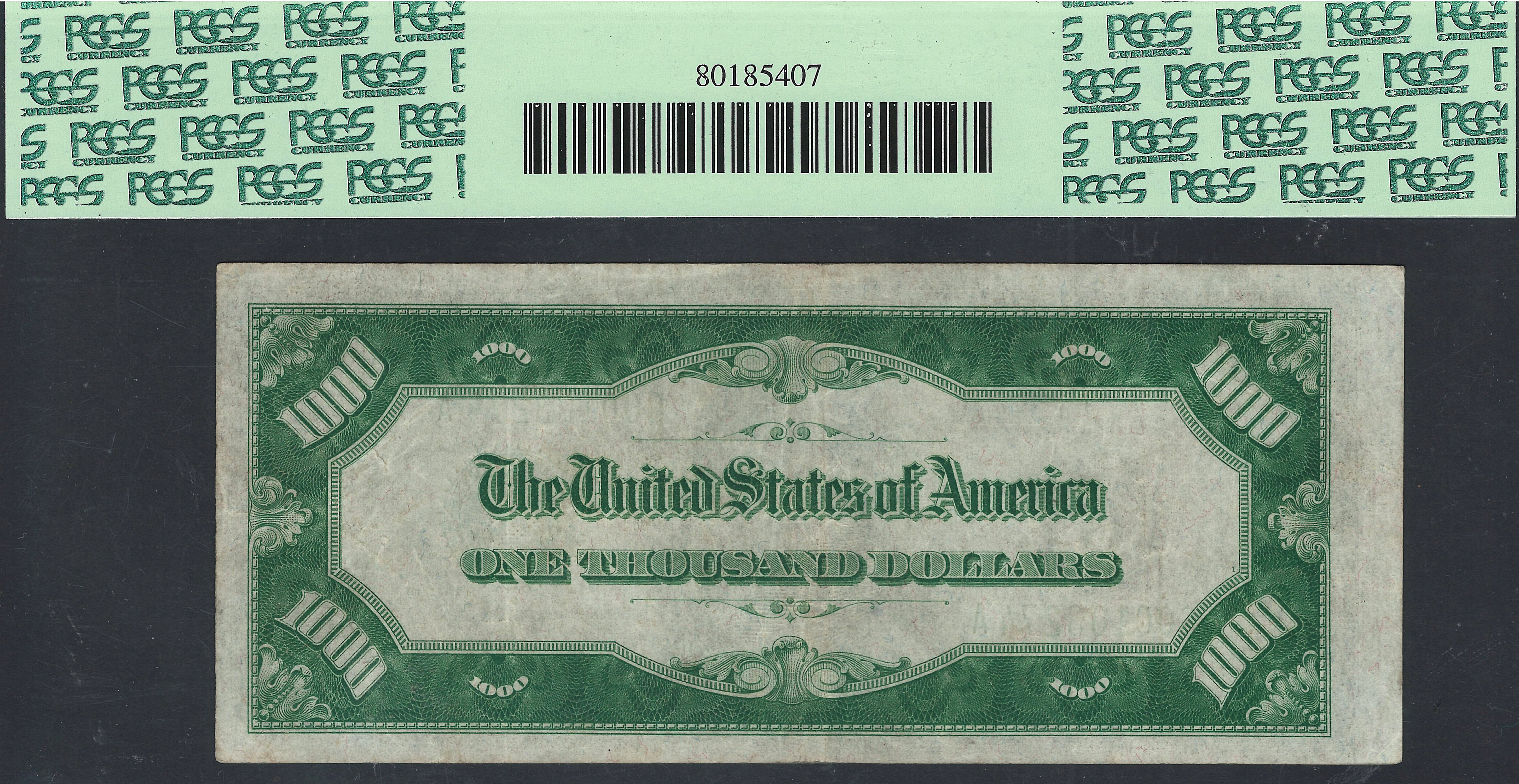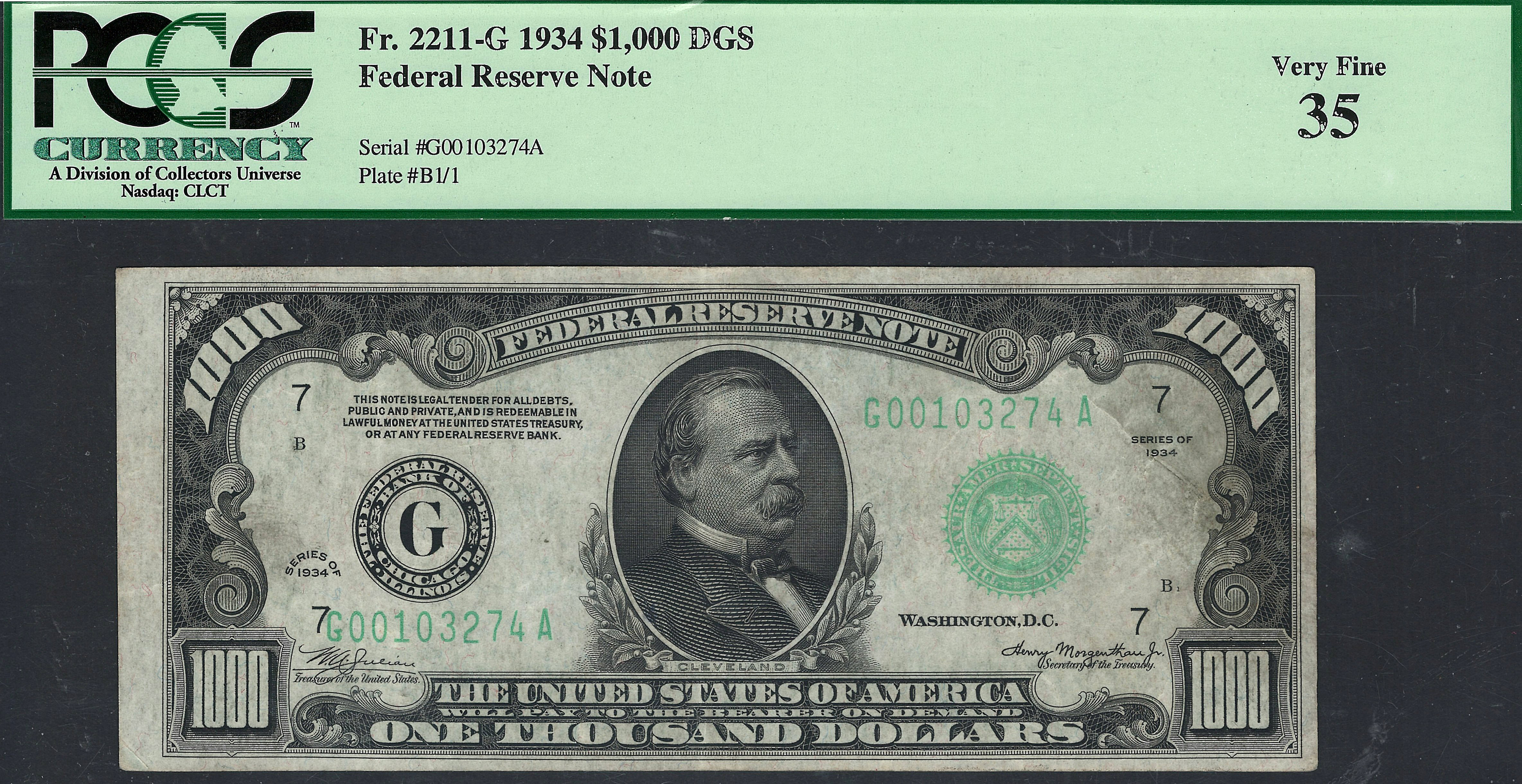 This is a Fr.-2211 or a 1934 $1,000 Chicago FRN with Serial no. G00103274A. It resides in a PCGS VF-35 holder. As you view the large scans you will notice that there are NO rips, tears, pinholes or bank marks. This would make a very nice mid grade type note for your collection. It would also make a nice note to carry around and show off to your friends. $500 and $1,000 bills are getting harder to find that are in a holder and not have any major repair issues. Prices have been steadily going up as demand for the nicer notes has increased dramatically. Get one while prices are this low.