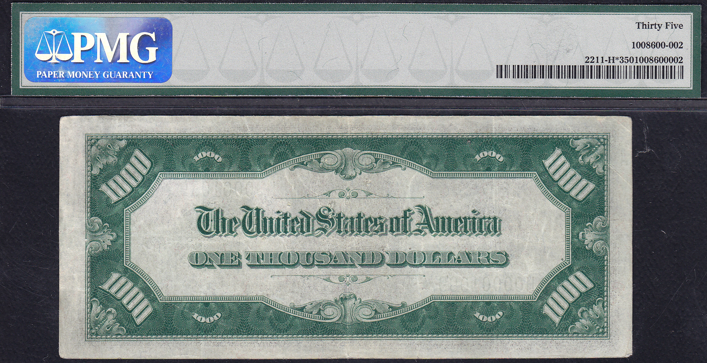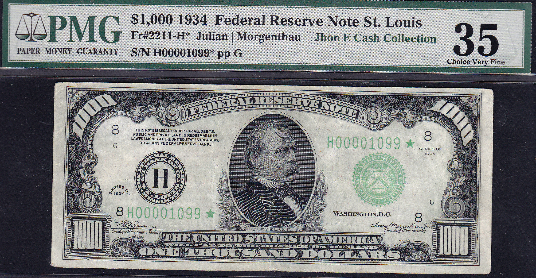 PMG POP 2/1 finer. This rare 1934 $1,000 FRN star note is from the fine city of St Louis, MO. There are only 5 known from this district. This PMG VF-35 is the 2nd finest of the 5 graded by PMG, the other one higher being a PMG-40. I find it hard to believe this is only a VF-35. You look at the scans and tell me. I don''t see any rips, tears, pinholes or bank marks. It features deep inks and broadwalk margins. This rare note currently resides in the Jhon E Cash Collection. The serial number is H00001099* and is in a PMG VF-35 holder.