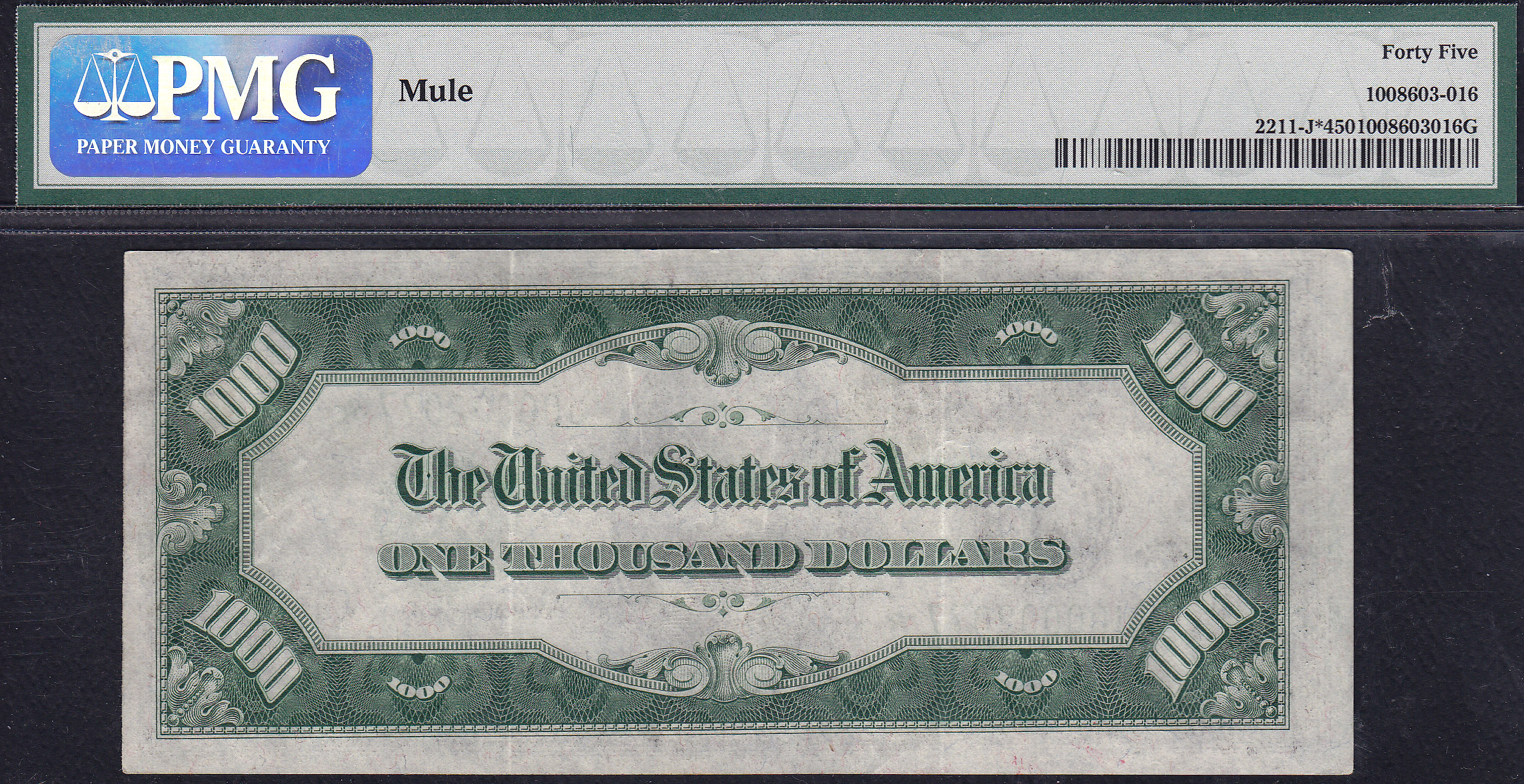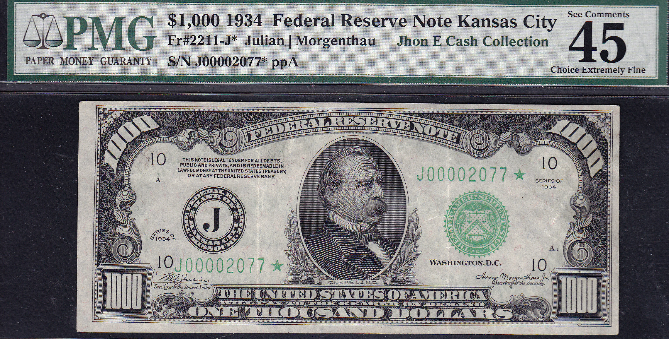 PMG POP 1/0 finer! Kansas City here I come...! This rare 1934 $1,000 Kansas City star has only 7 survivors known to exist. This is the FINEST Known. On top of all that, it is also a MULE star note. The serial number is J00002077* and is in a PMG-45 holder. This is a typical 3-fold VF note with no visible issues. It looks like it was in circulation for a very short period of time and folded and put away for posterity. You can tell this by the corners, as they are not wrinkled as it should be if it were in circulation for a longer period of time.