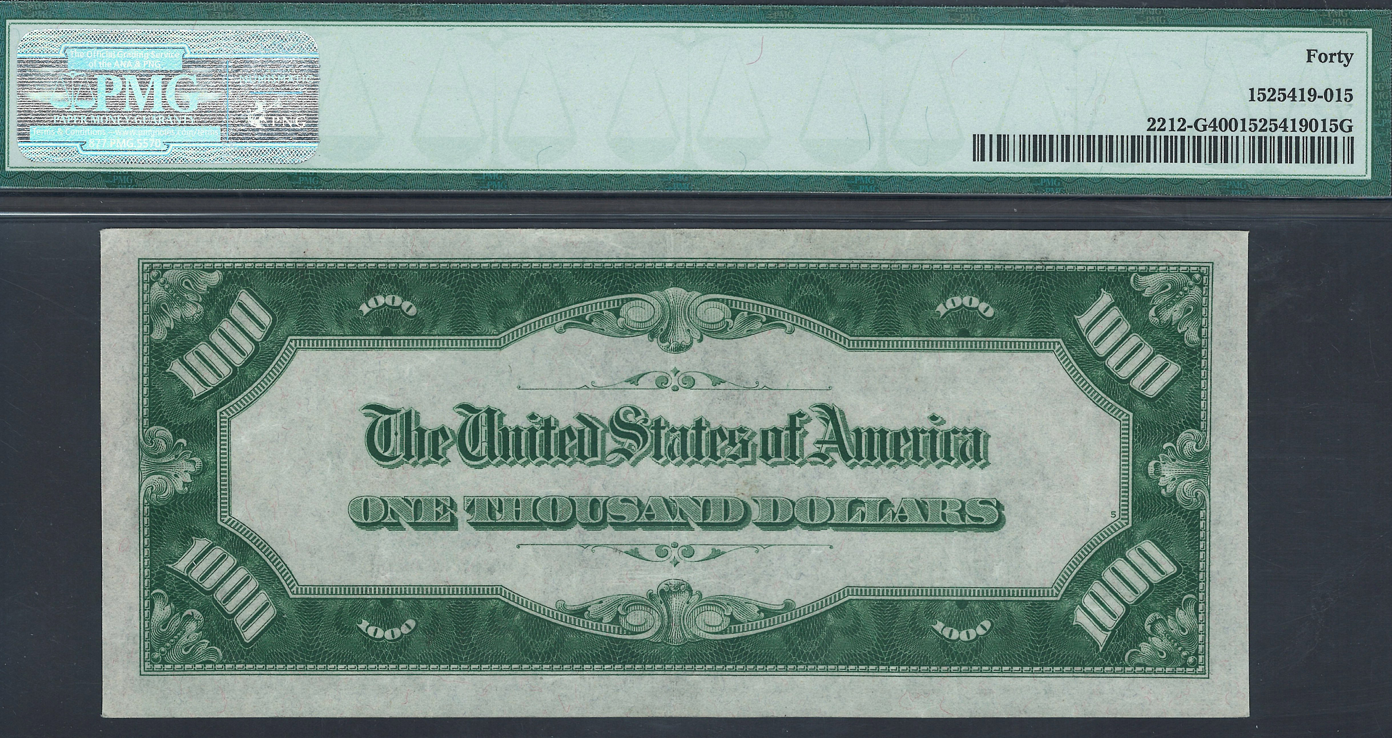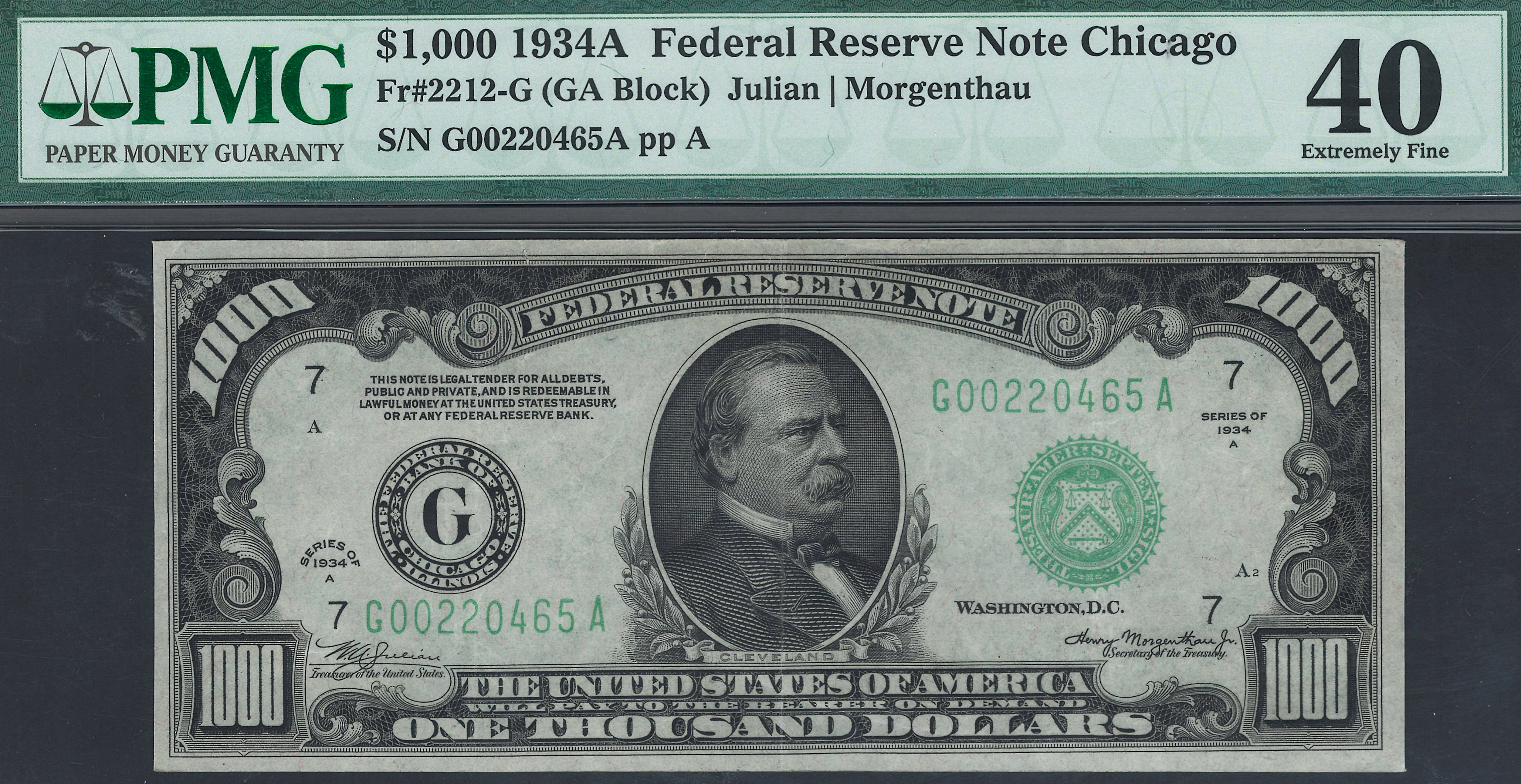 This is a very nice 1934A $1,000 FRN from the Chicago district. The serial number is G00220465A and it is in a PMG-EF40 holder. To top it off it is also a more desirable Light Green Seal Varity (LGS). You can not ask much more that that for the price. The 1934A is a tougher note than the more common 1934 series. There are no rips, tears, pinholes or any other issues. A great note to show off to friends or for your nice collection.