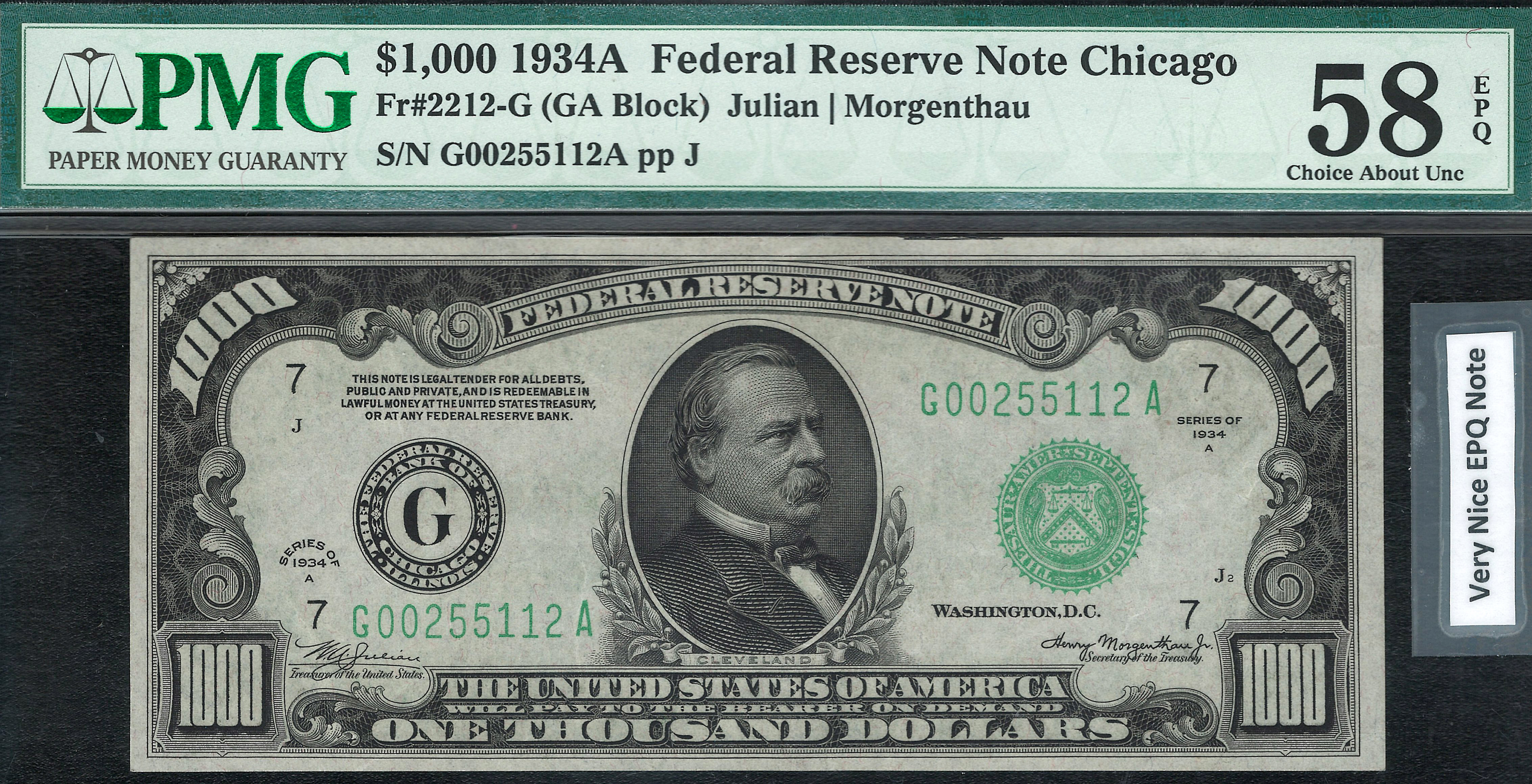 Fr.-2212 1934A $1,000 Chicago FRN Ser. G00255112A PMG 58-EPQ