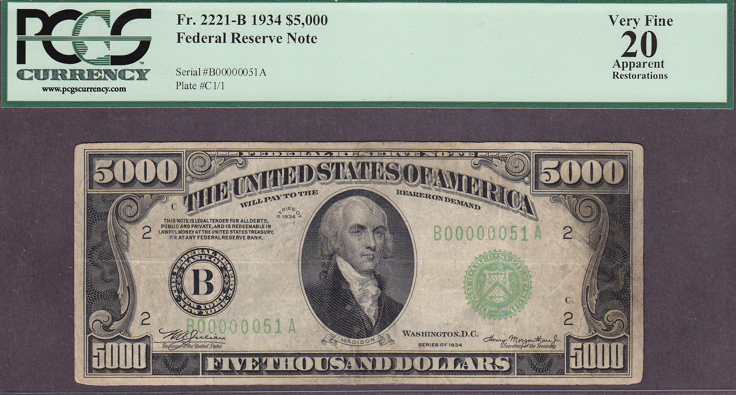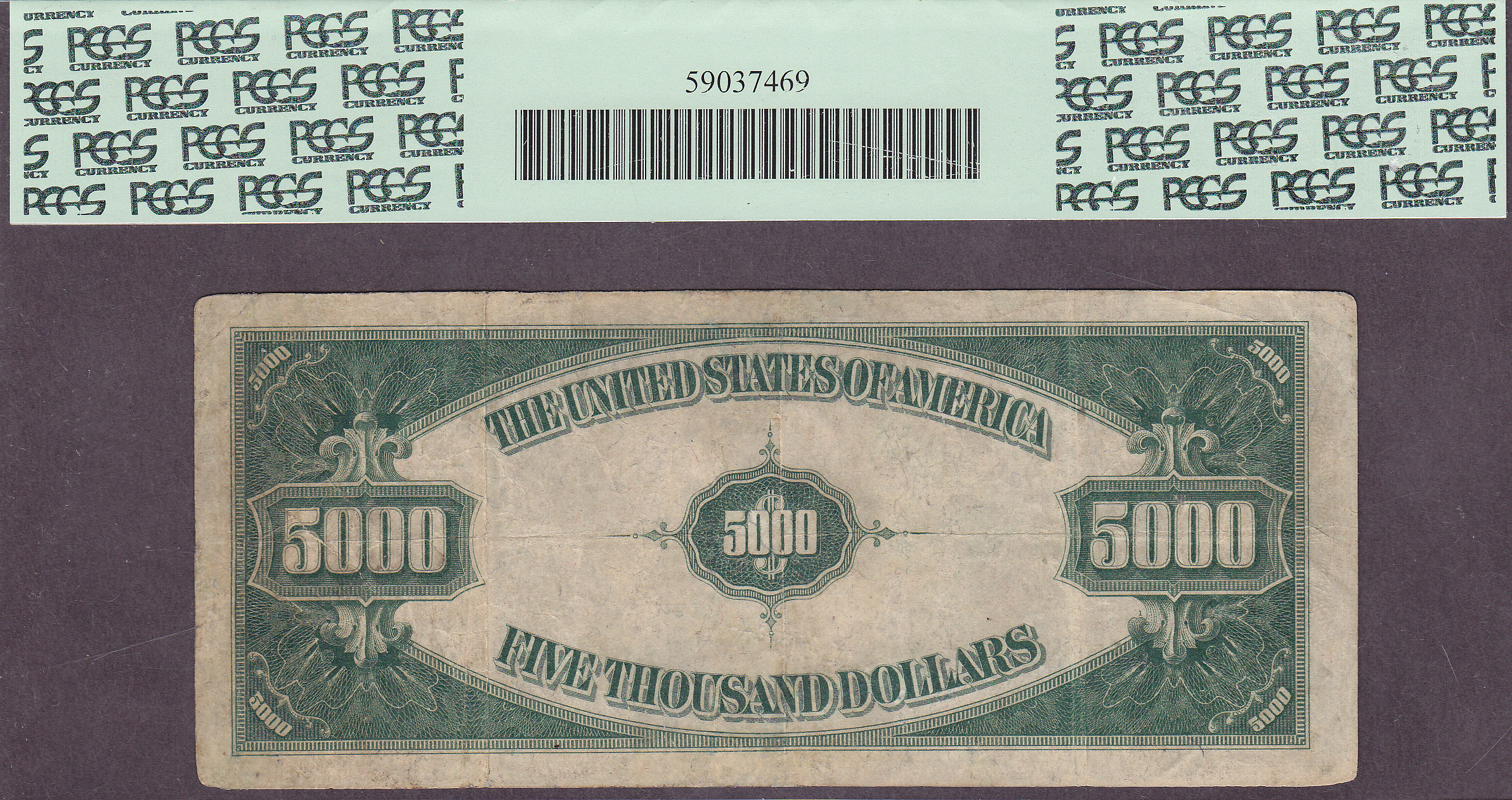 This is a new item to the Jhon E Cash Ultra High Denomination census. I just acquired this Very Fine 1934 $5,000 in December of 2012. Lately there have not been any decent $5,000 or $10,000 bills available anywhere. The prices are definitely moving up almost, but not quite to the pre 2007 prices. This one became available and I jumped on it because I can offer it for a really nice and attractive price. Most of the Ultra High denoms are in much higher grade and command a big premium from $85,000 to well over a $100,000. Here is the chance for a savvy collector to own one for a very decent low price. The serial number is B00000051A and it is in a PCGS VF-20 holder. I will be taking this note with me to the next few shows starting on 2/6/2013 at the Long Beach Show. It may be sold fairly soon, get it while you can as it is well below market price. This may be the only time that you ever see a decent 1934 genuine $5,000 bill for under $65,000.
