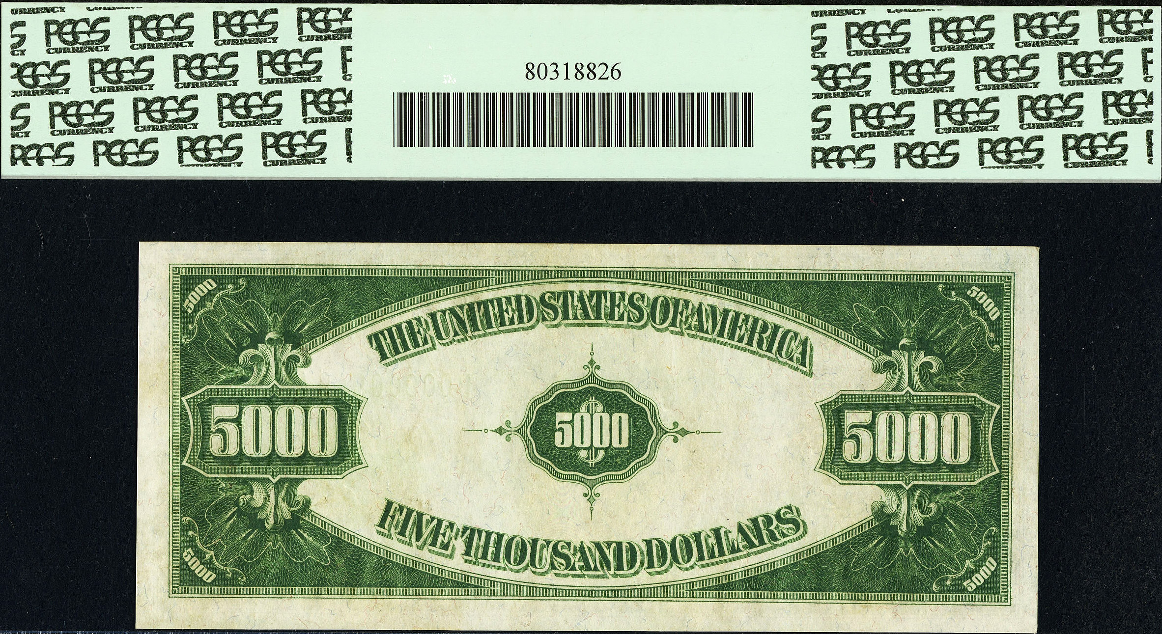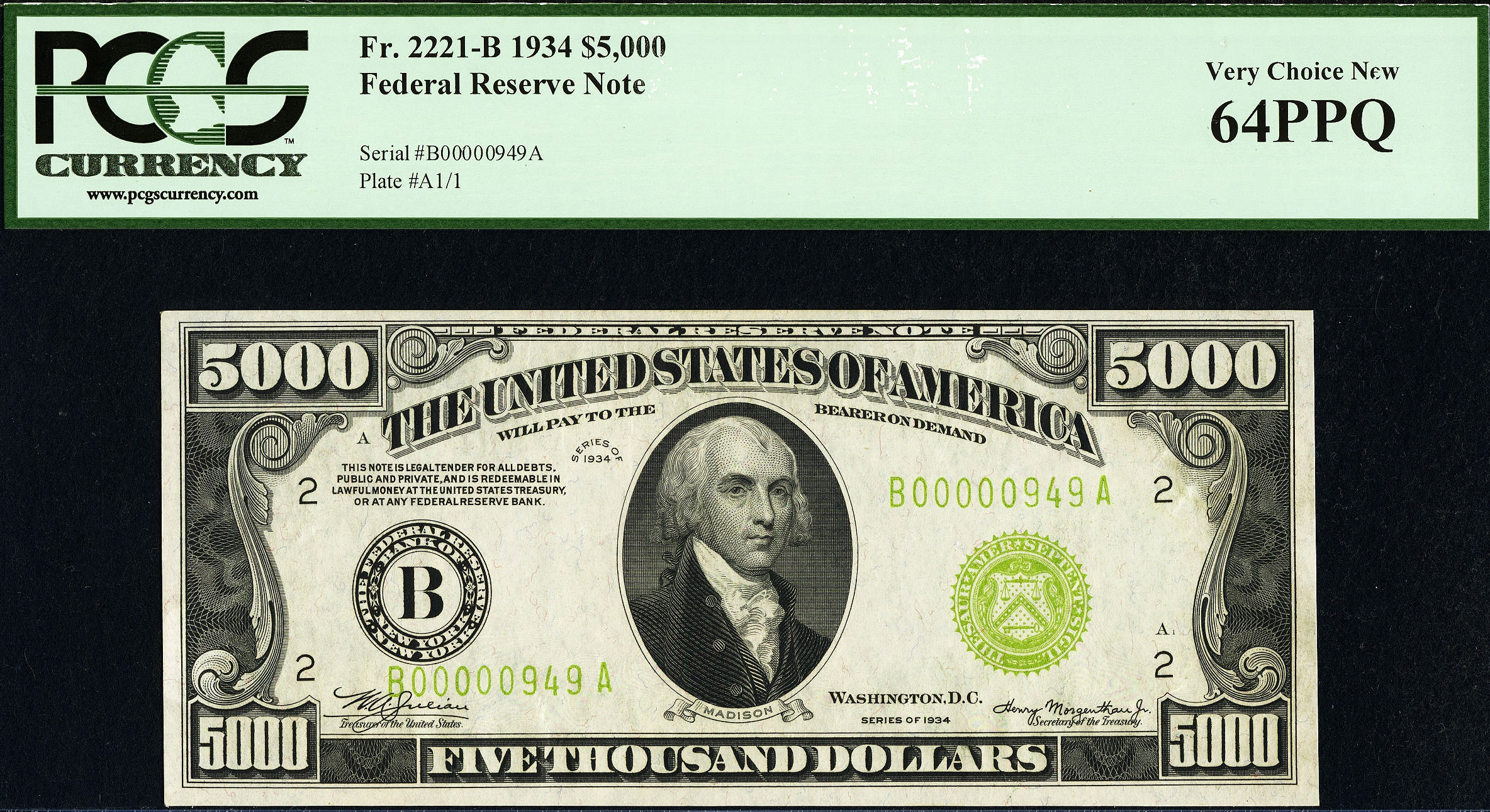 This is one of the nicest 1934 $5,000 bills from New York District that I have ever owned. It is of the light green seal variety LGS). It is totally original with no rips, tears or pinholes. You can easily see the embossing through the holder. There are only a very few of the 1934 $5,000 bills that are of this grade and even fewer the EPQ or PPQ designator from the two grading services. This is a POP2 note. The serial number is B00000949A and it is in a PCGS-64PPQ holder.