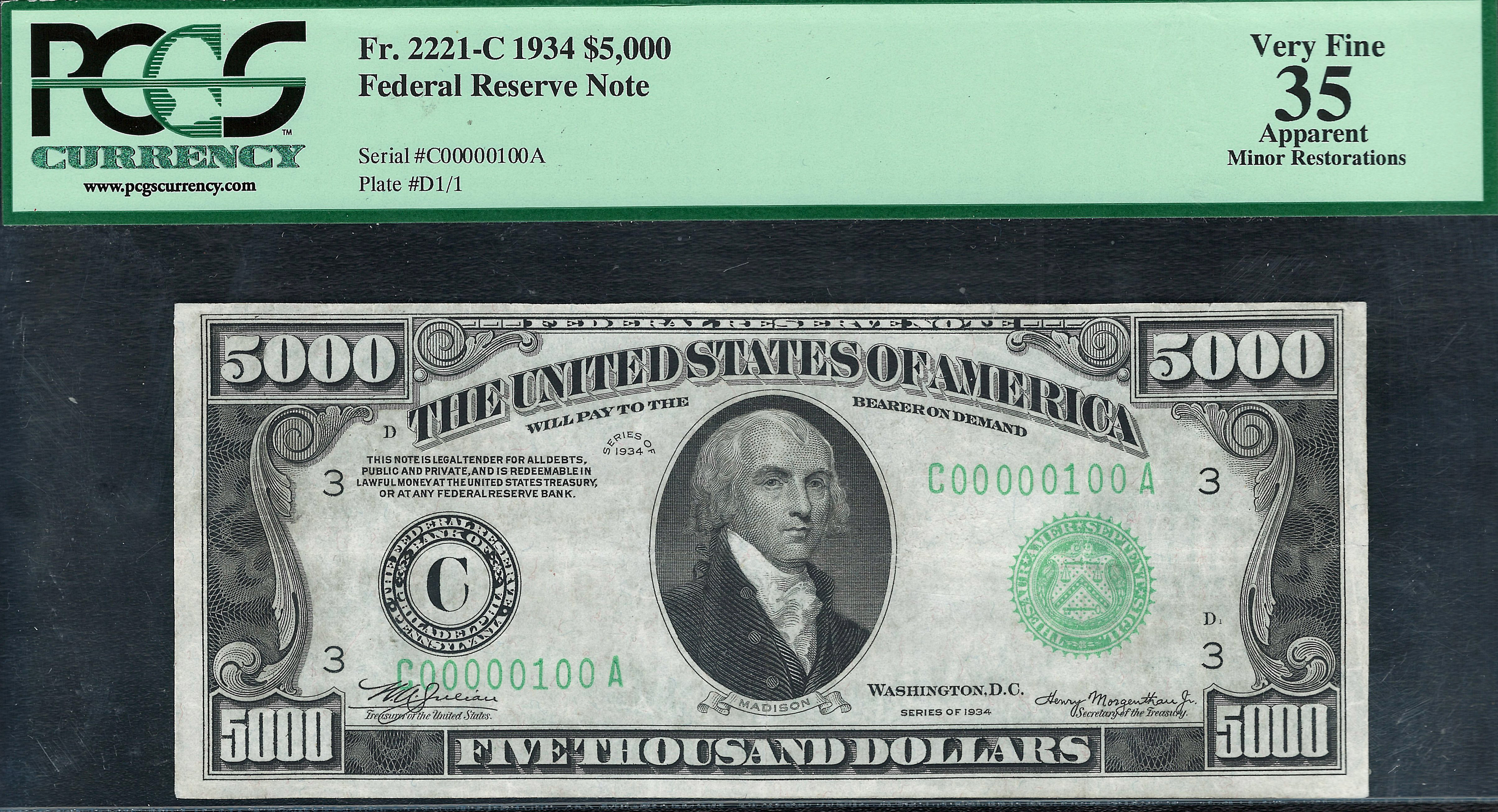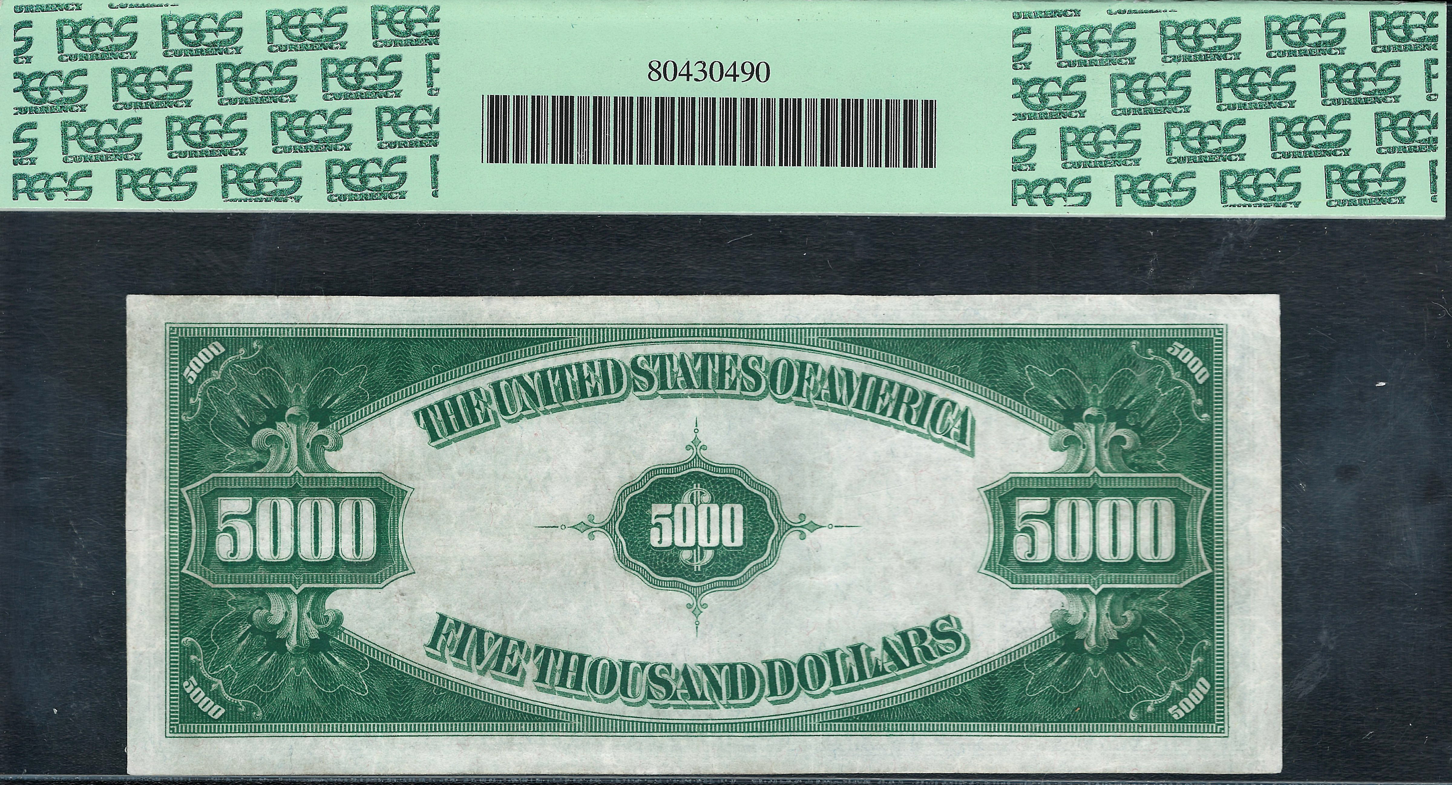 This is one of the rarest of all of the 1934 $5,000 notes known. This rare authentic $5,000 bill is from the very scarce Philadelphia (C) District and has a three digit fancy serial number of C00000100A. As you can see by the scans it is in great condition with no visible major issues. There are actually 4 Philly's in the census, but one of them is suspect with no known data. Technically that makes only three known for collectors. ONLY THREE! In comparison: there are five 1913 V nickels and they sell regularly for over $3.5 million each. What is wrong with this picture? This may be your only chance to own one of the three 1934 Philly $5,000 bills. There are only 186 known $5,000 in all series and districts. You will never see these notes in auctions, especially a Philly. This 1934 $5,000 bill has been graded as a PCGS-35 with some minor nicks on the margin that does not go into the design. Because of this minor issue it has been downgraded from a actual 45 grade to a 35 grade. In the recent FUN show auction held in Orlando on Jan 8th 2014 a 1934 $10,000 Binion Note in a PCGS-62 Holder sold for $129,150. It seems like a lot of our $5,000 and $10,000 are going to overseas buyers and collectors who are grabbing them as fast as they show up at auction or on the internet. They know that right now is a good time to buy them as the prices are low. I will be taking this Philly $5,000 note with me on the many road shows coming up in the next few months, if it is still available. I just lowered the price on this note for a quick sale. At $114,500 for a rare 1934 Philadelphia $5,000 bill, it is a no brainer for the serious buyer collector.