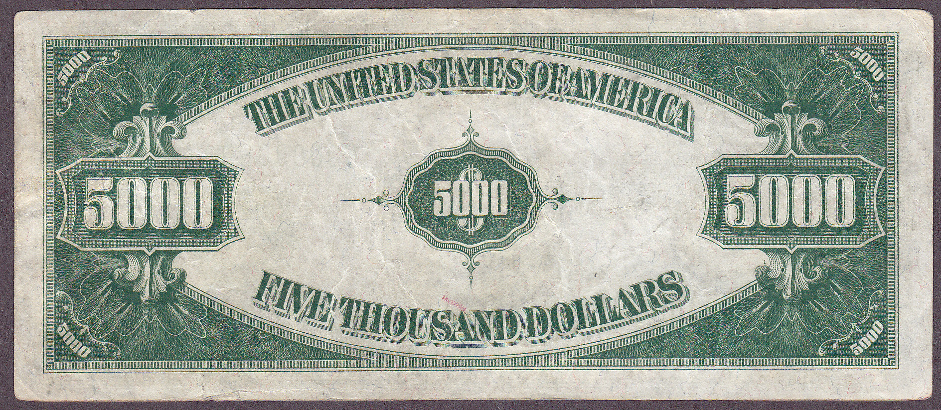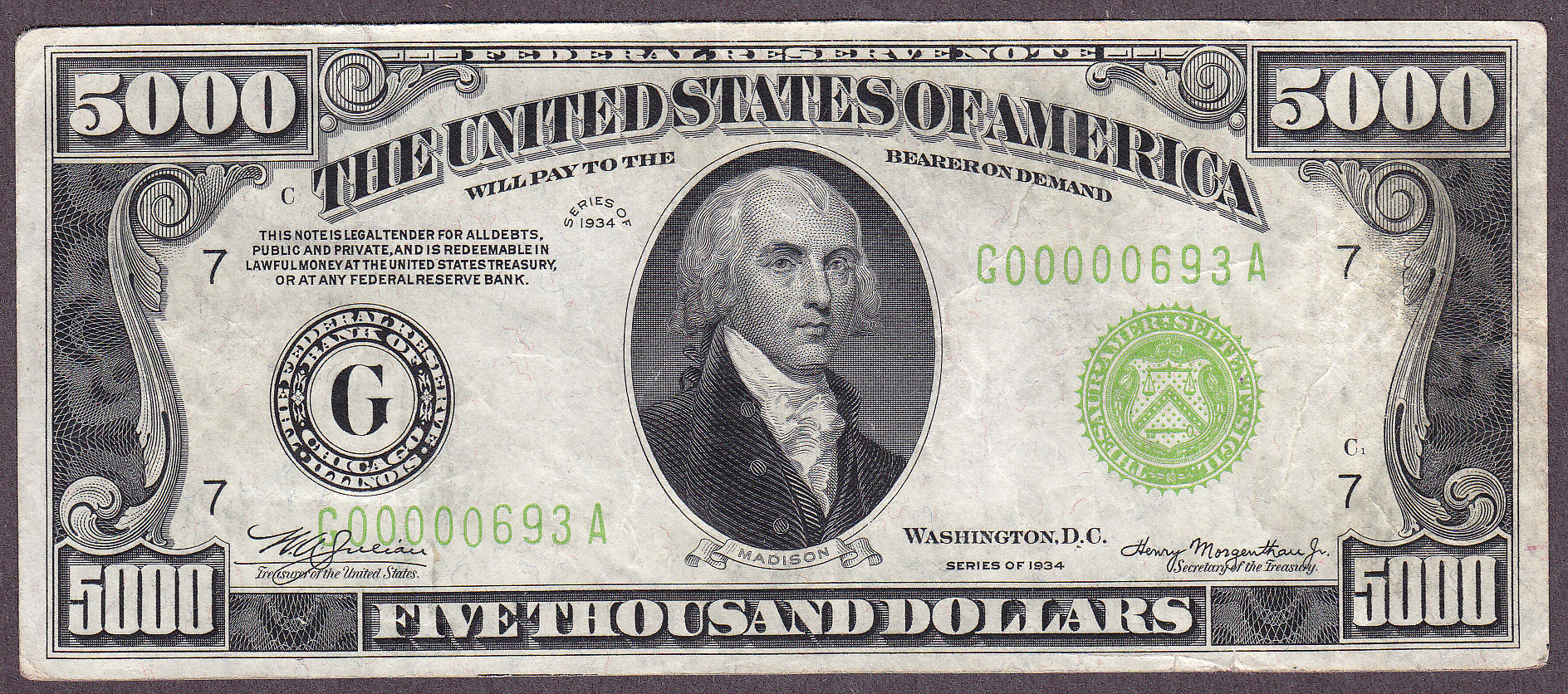 This is a real and rare US 1934 $5,000 bill from the ever popular Chicago district. It features a Light Green Seal (LGS) variety. The three digit low serial number is G00000963A. Recently I repurchased this nice $5,000 bill from a past client who had it for some time. This $5,000 bill is not in a PMG or PCGS holder because the grading companies were not around when he purchased the note. I will probably get it graded when I go to Chicago at the end of April. That is unless I sell it first.
