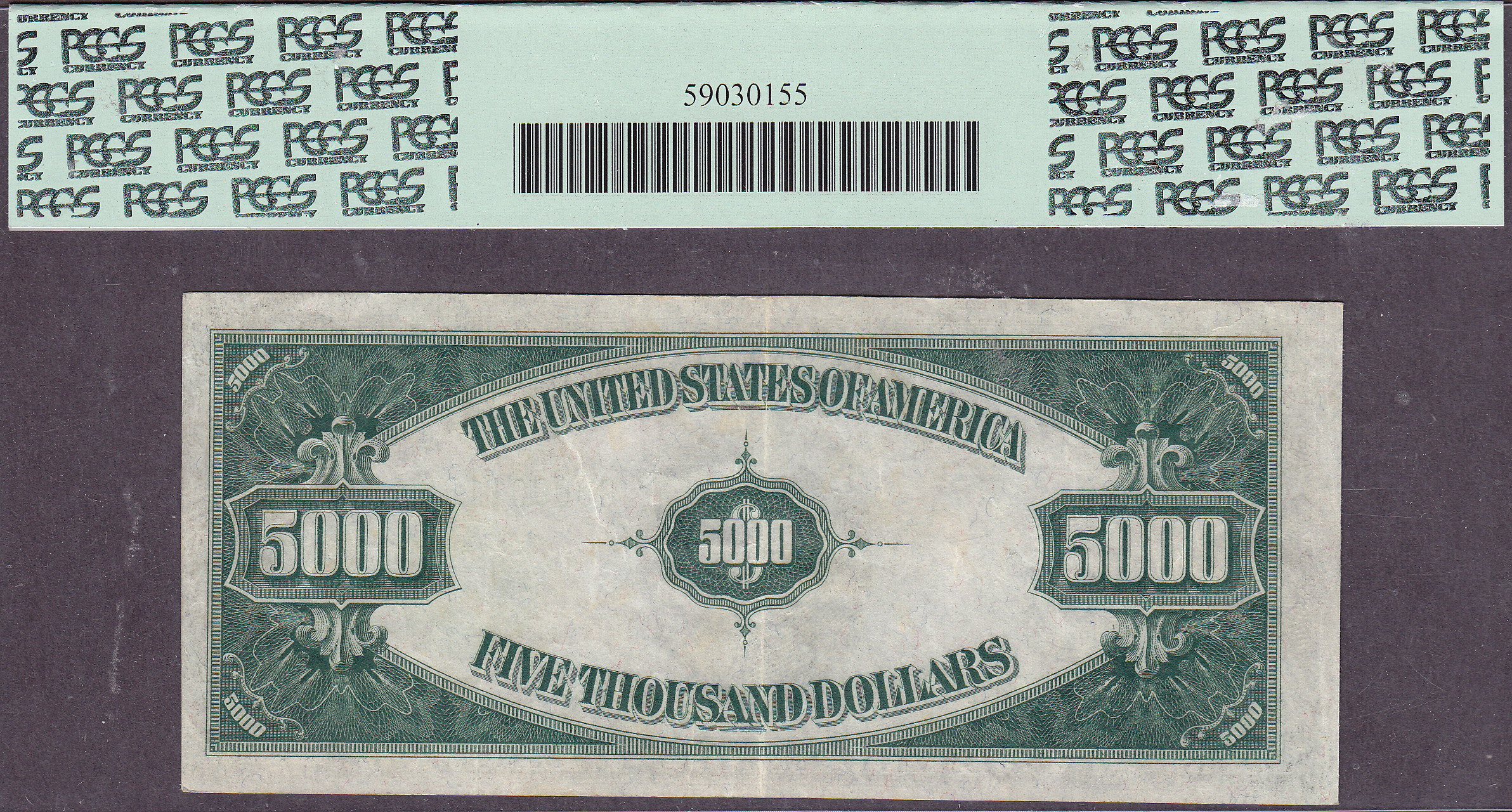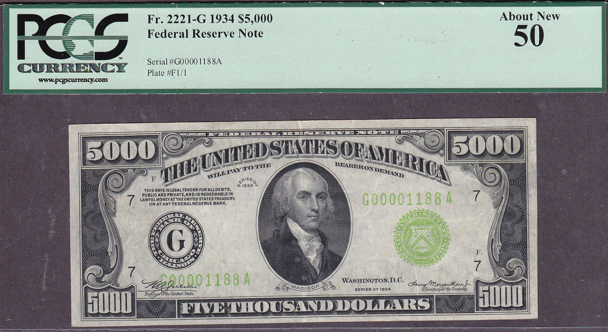This is a super nice 1934 $5,000 FRN from the Chicago district. This is of the light green variety. This is one of the nicer Chicago $5,000 notes I have owned. There are no issues with this one at at. There are no rips, tears, pinholes or bank marks. It is hard to fine a nice AU note with no issues. The serial number is G00001188A and it is graded as a PCGS AU-50. For your information there are only 176 $5,000 notes known. There are 208 $10,000 notes known.